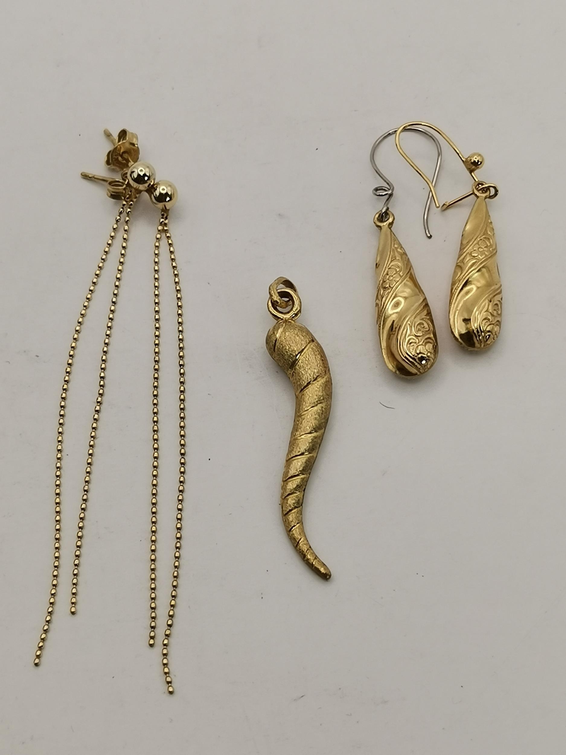 Collection of gold jewellery - 9ct Gold two strand drop earrings, 9ct Gold Horn of life pendant plus 9ct gold pear drop earrings gross weight 5 grams