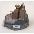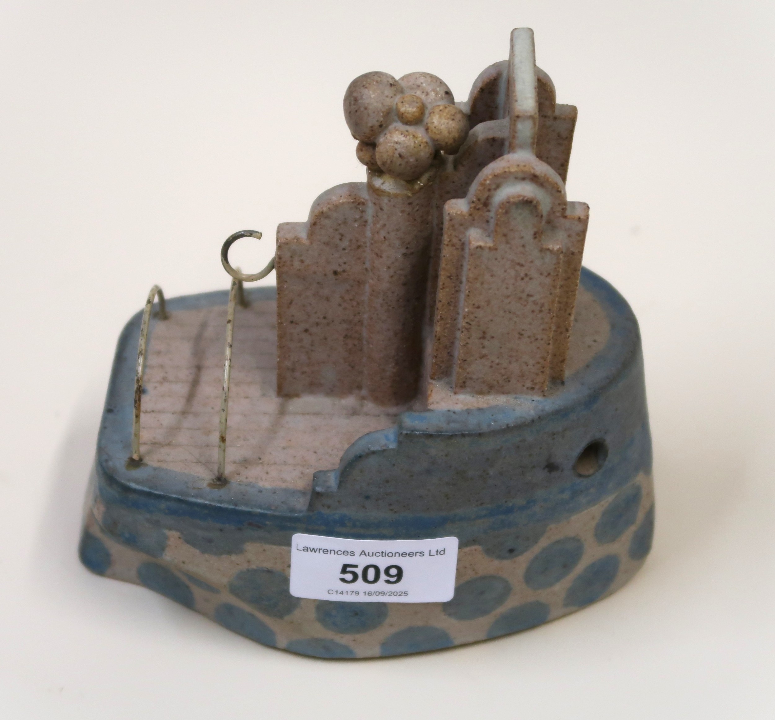 Alan Heaps, pottery model of a boat with blue glazed decoration (losses to funnel)