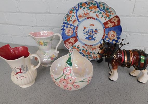 Melba ware shire horse, Devon jug, Mailing items & charger, (damage to handle of basket)