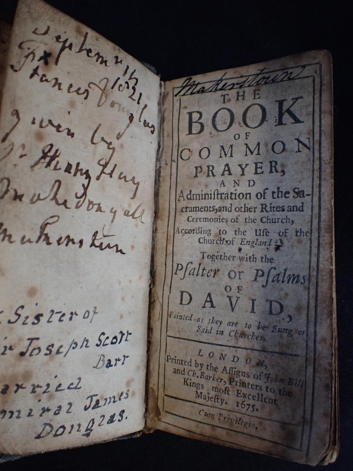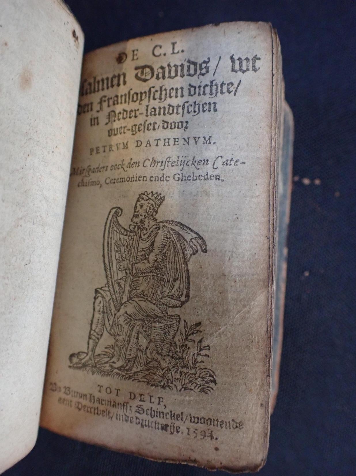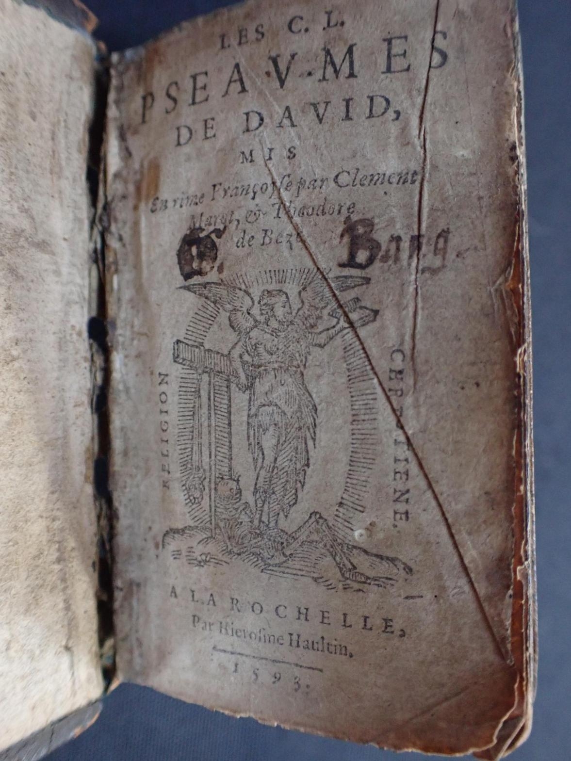 CLEMENT MAROT & THEODORE DE BEZE: 'LES PSEAUMES DE DAVID' a miniature edition, H. Haultin, La Rochelle 1593, bound with the Psalms in Dutch, 1594 (a/f; old very damaged binding), with The book of common prayer, and Psalms, printed John Bill and Ch. Barker London 1675 (2)