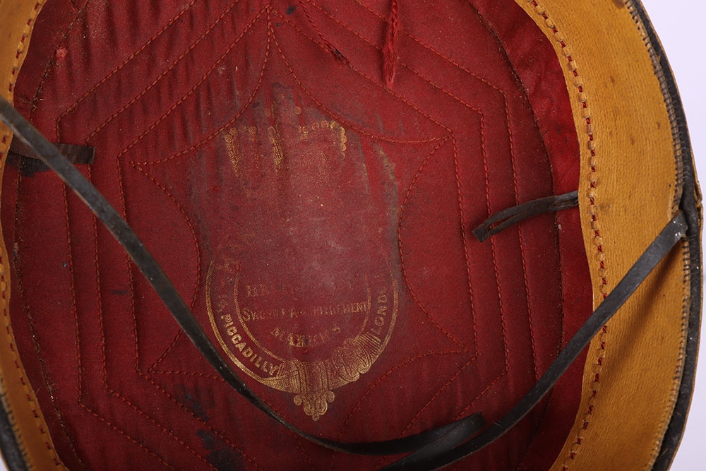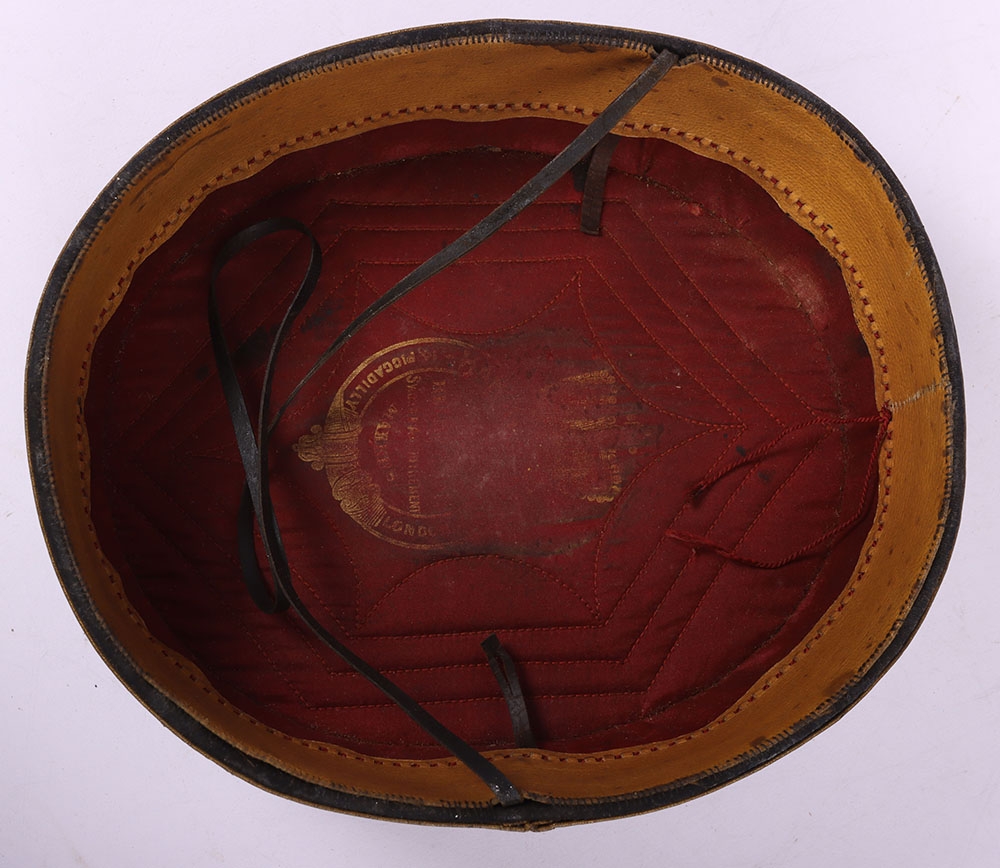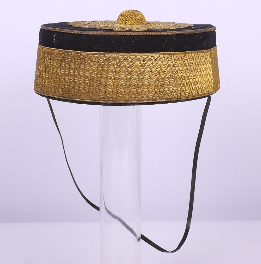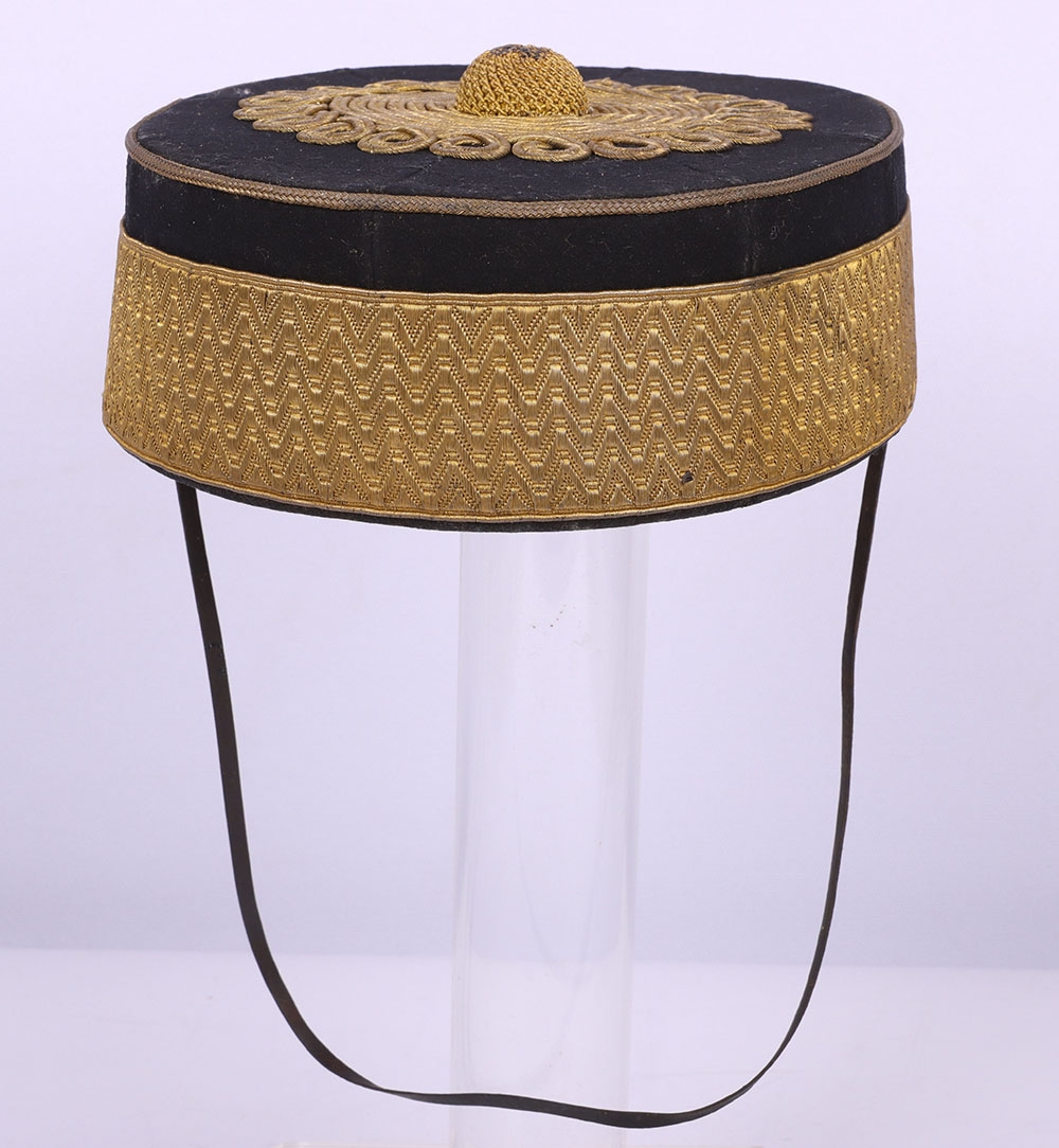 Victorian Hussars Regiment Pill Box Cap, fine blue cloth pill box cap with lace band to the centre, knotted top and bullion cord decoration. Tan leather sweatband with crimson lining and thin patent chinstrap. Generally good condition. This design of cap is worn by multiple Hussar regiments.
