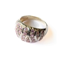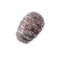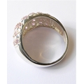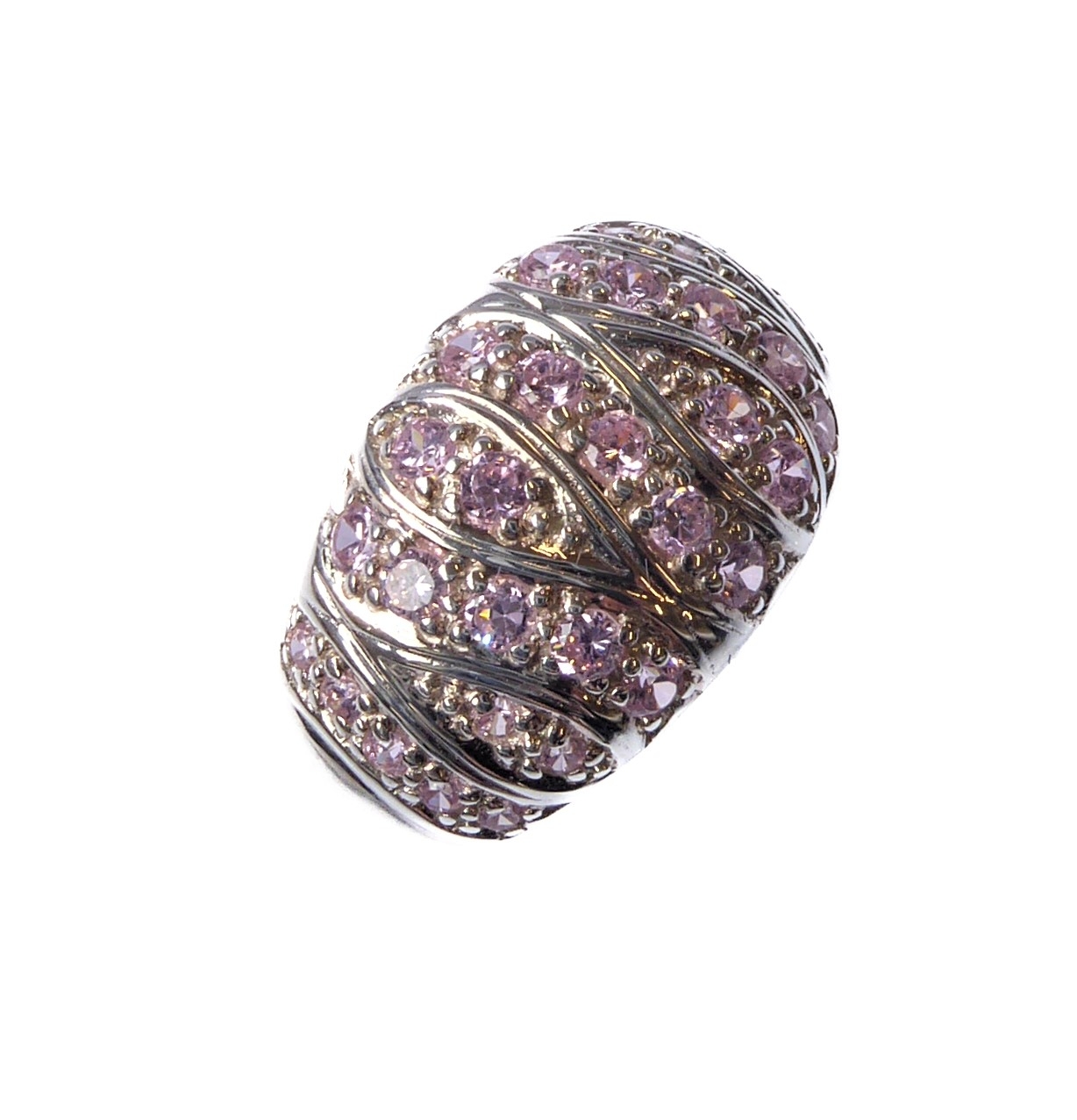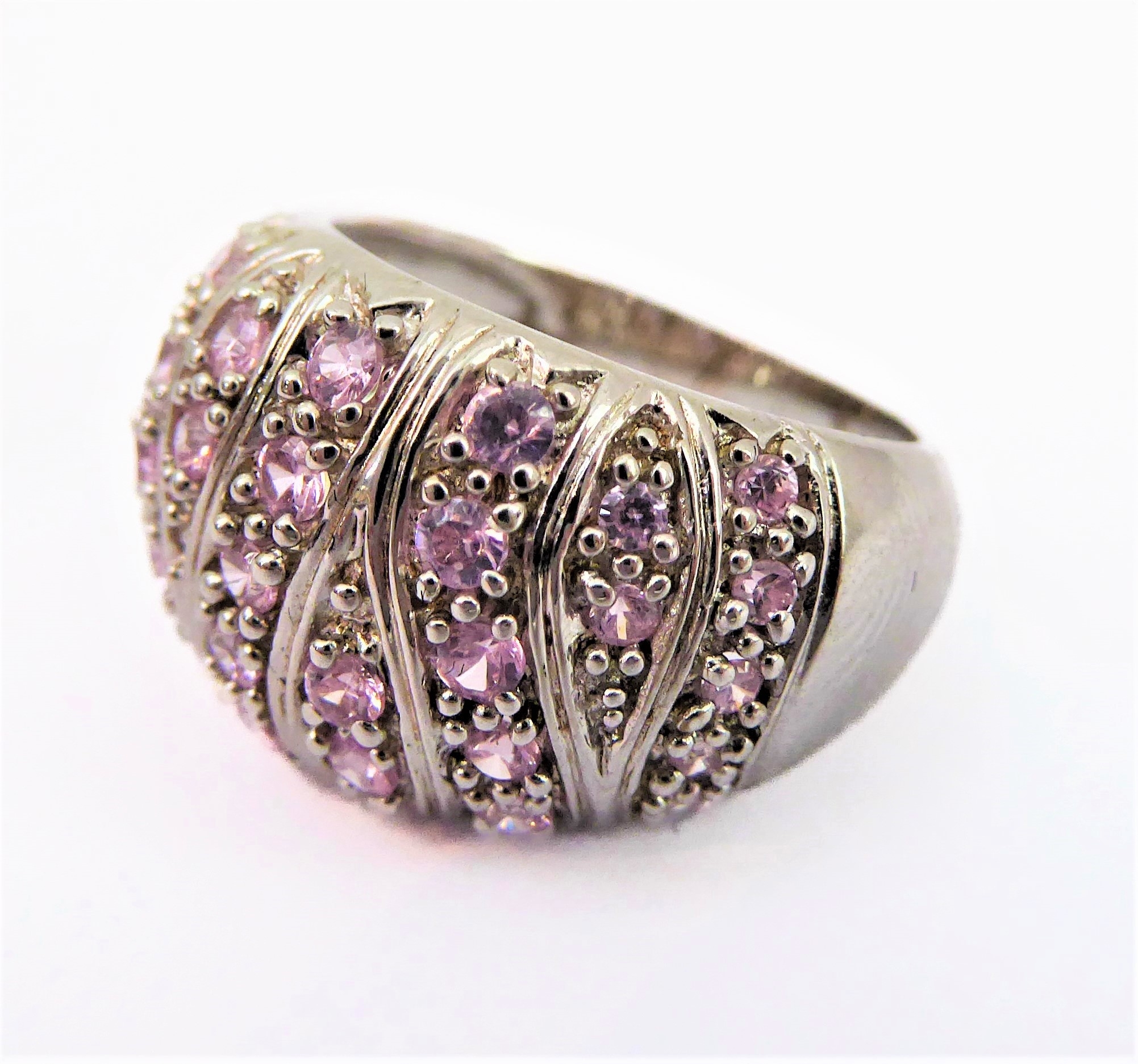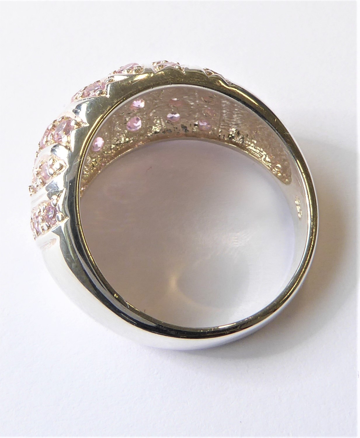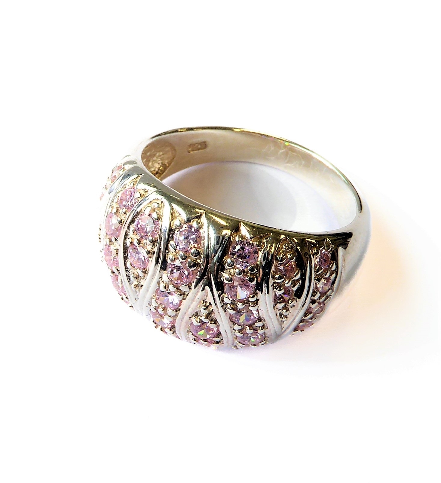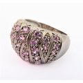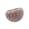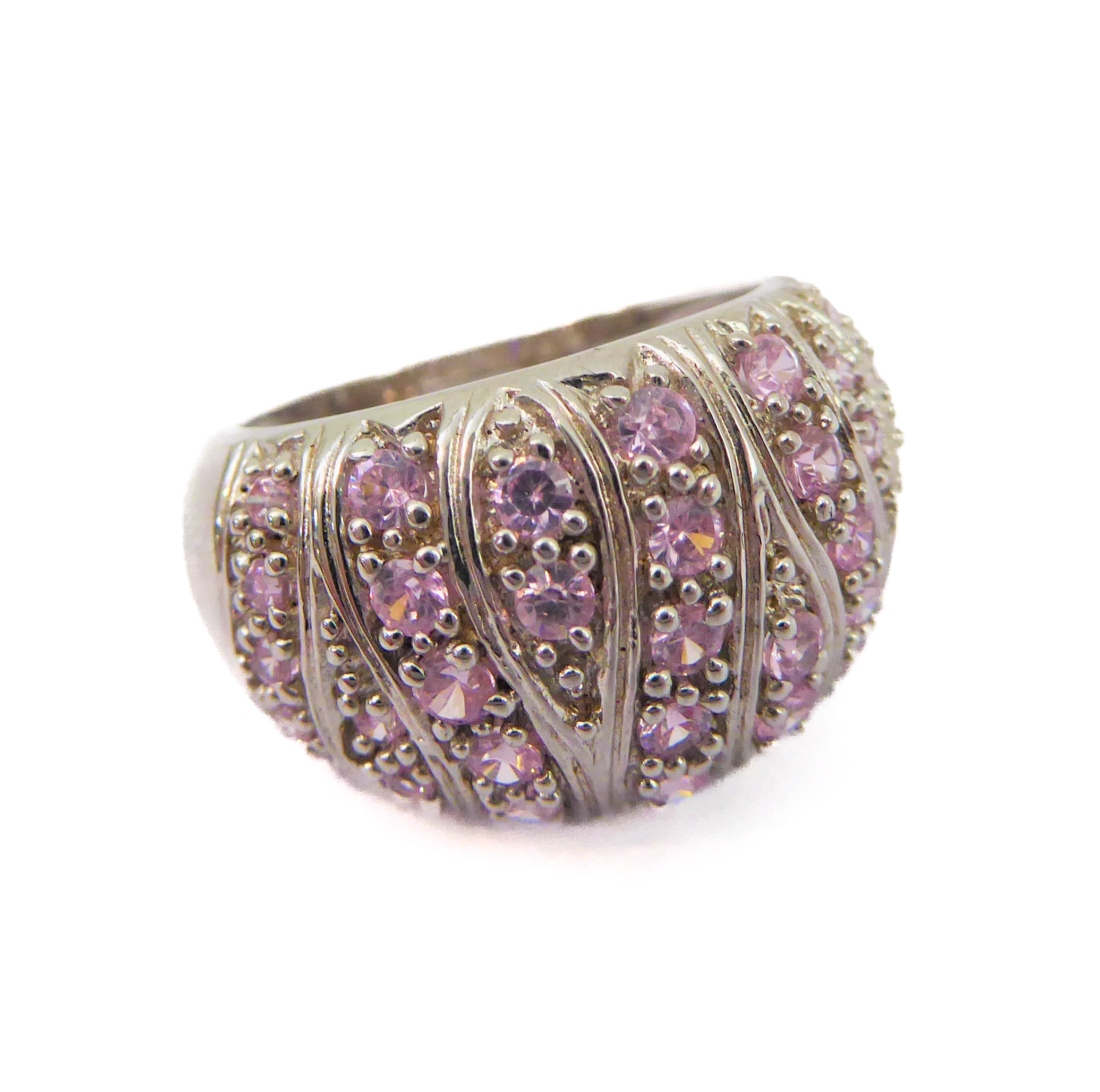 A silver dress ring set with 32 small hand-cut pink stones in an undulating design, ring size P