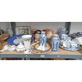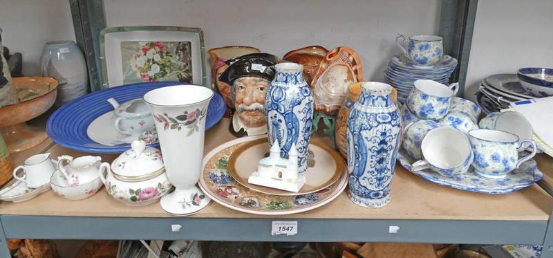 3 LARGE DOULTON TOBY JUGS, FARLEYS PORCELAIN TEAWARE, PAIR OF BLUE & WHITE VASES, ETC ON 1 SHELF
