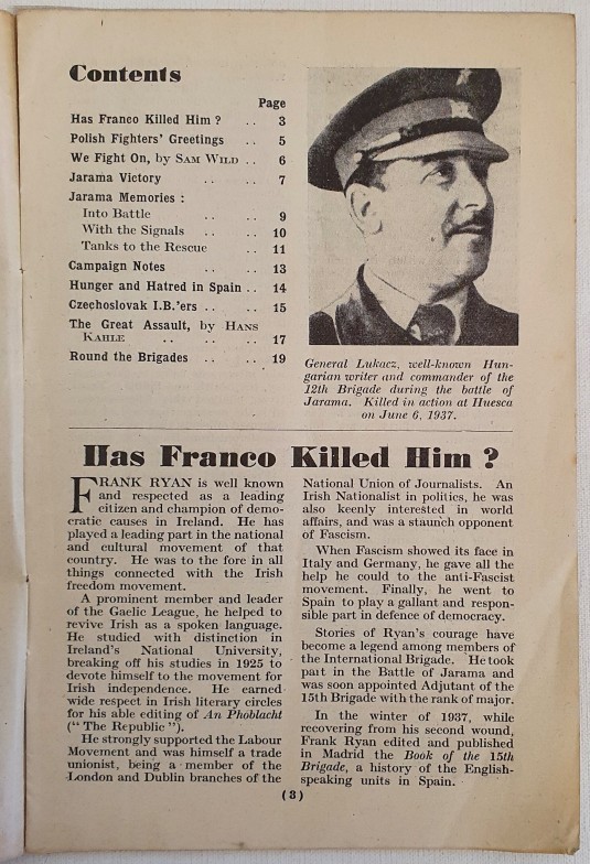 [Frank Ryan]. Has Franco killed Him. The Volunteer for Liberty. Journal of the International Brigade Association. Jarama Anniversary 1944. Printed wrappers with article on Frank Ryan and superb photograph on front cover. Wonderful survivor