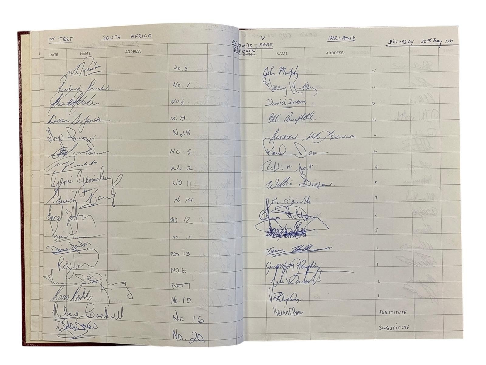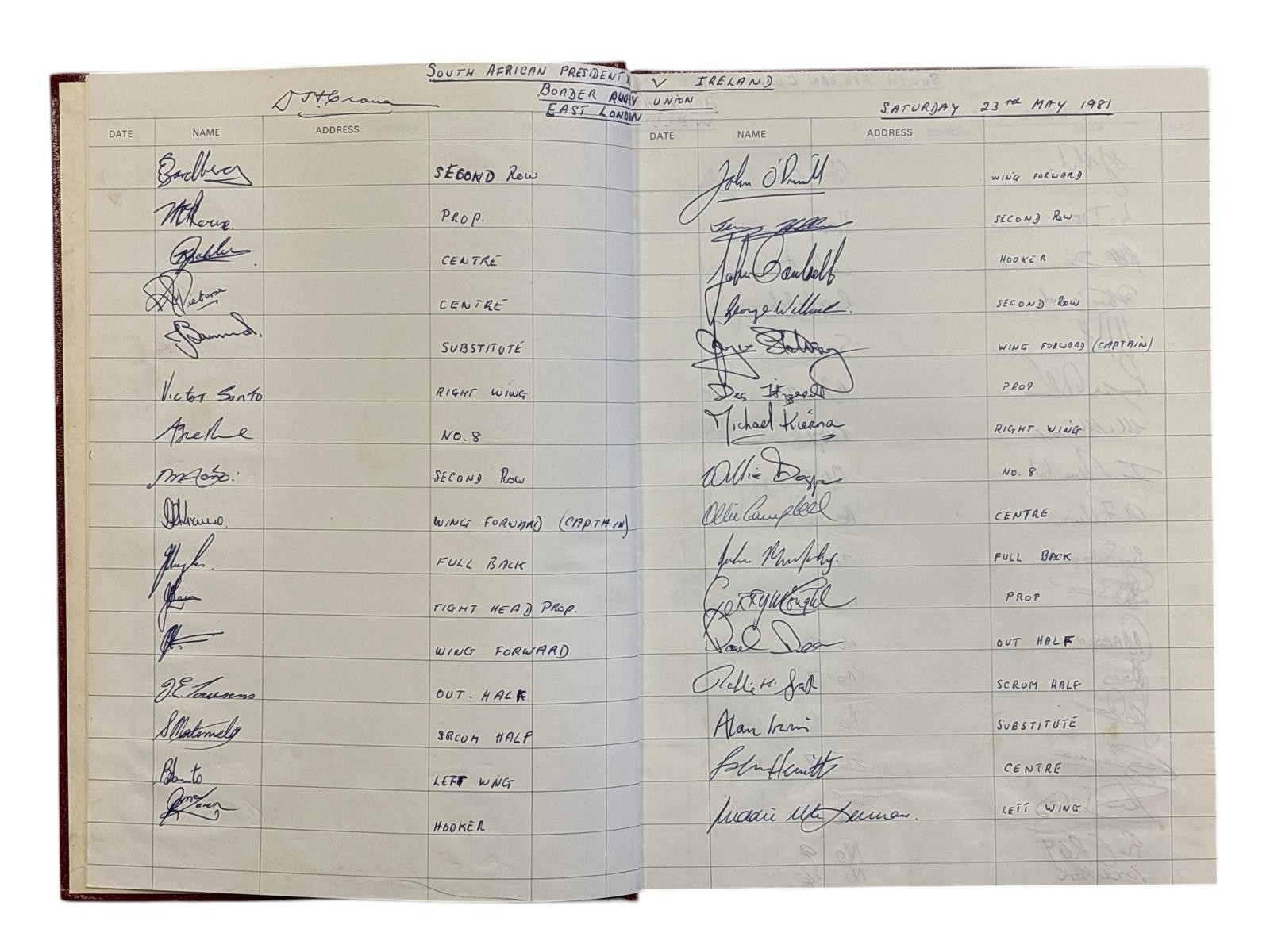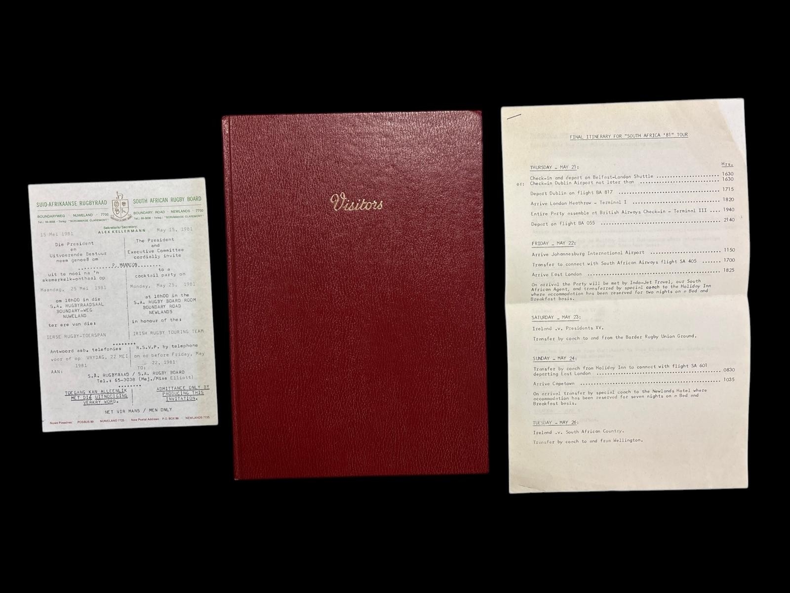 APARTHEID TOUR 1981: A hardback bound visitors book containing a selection of signatures and autographs from South African and Irish players involved in the May 1981 Irish rugby tour to South Africa also included is an itinerary and invitation from South Africa Rugby Board