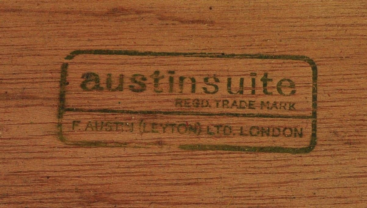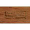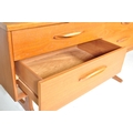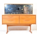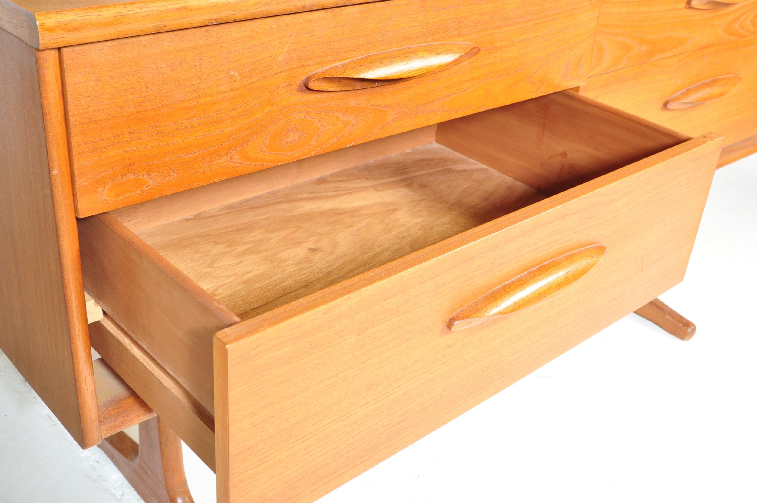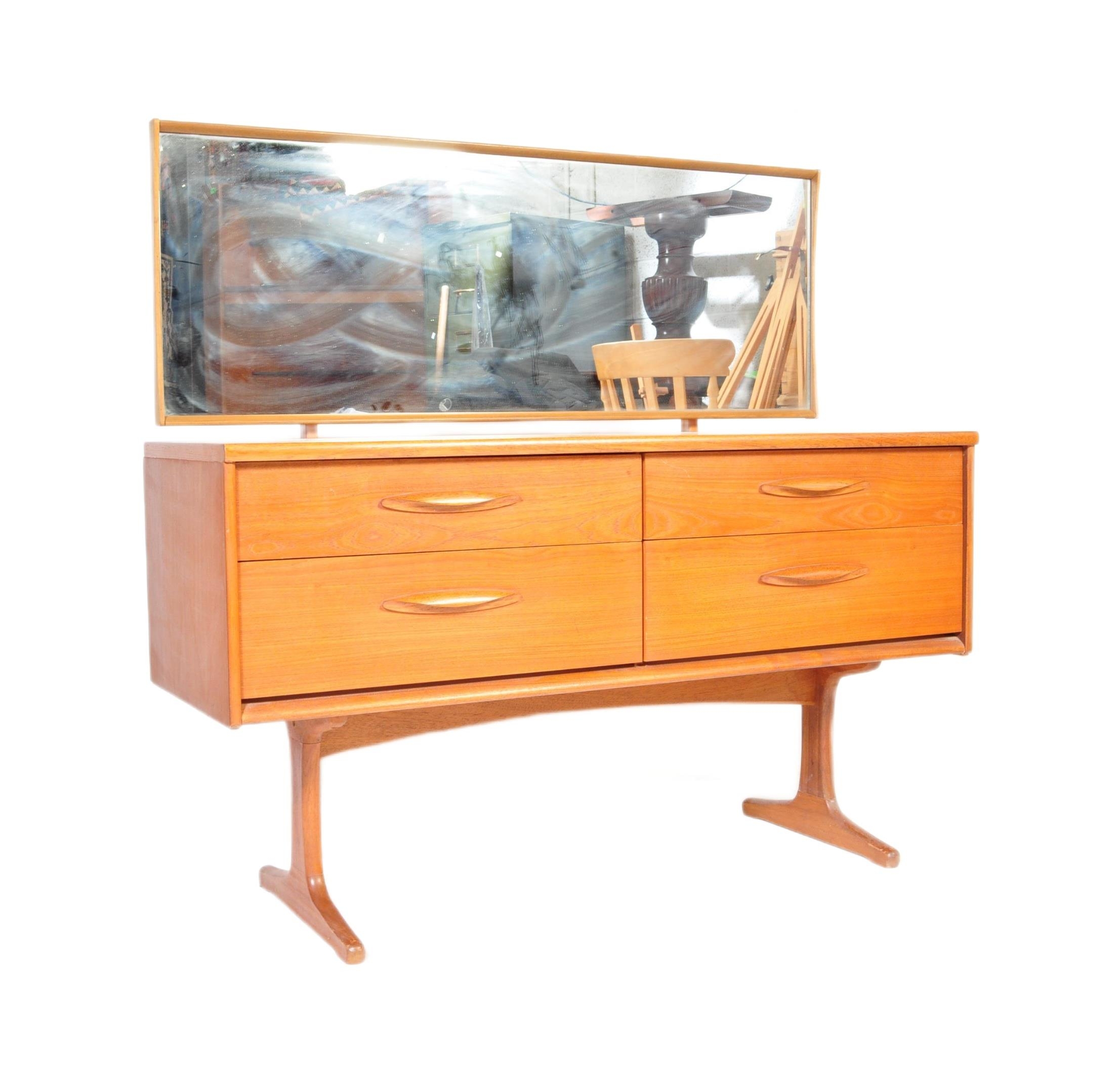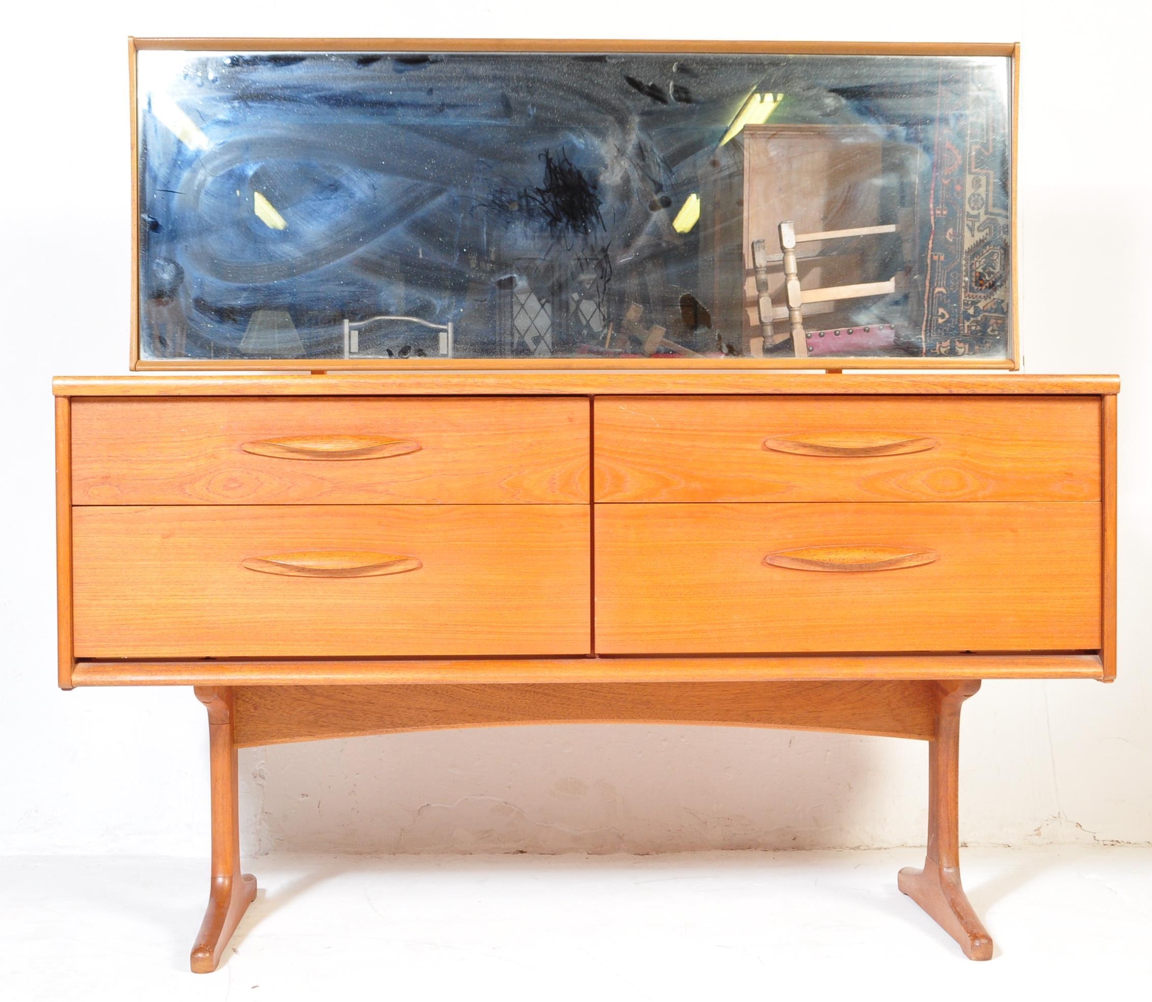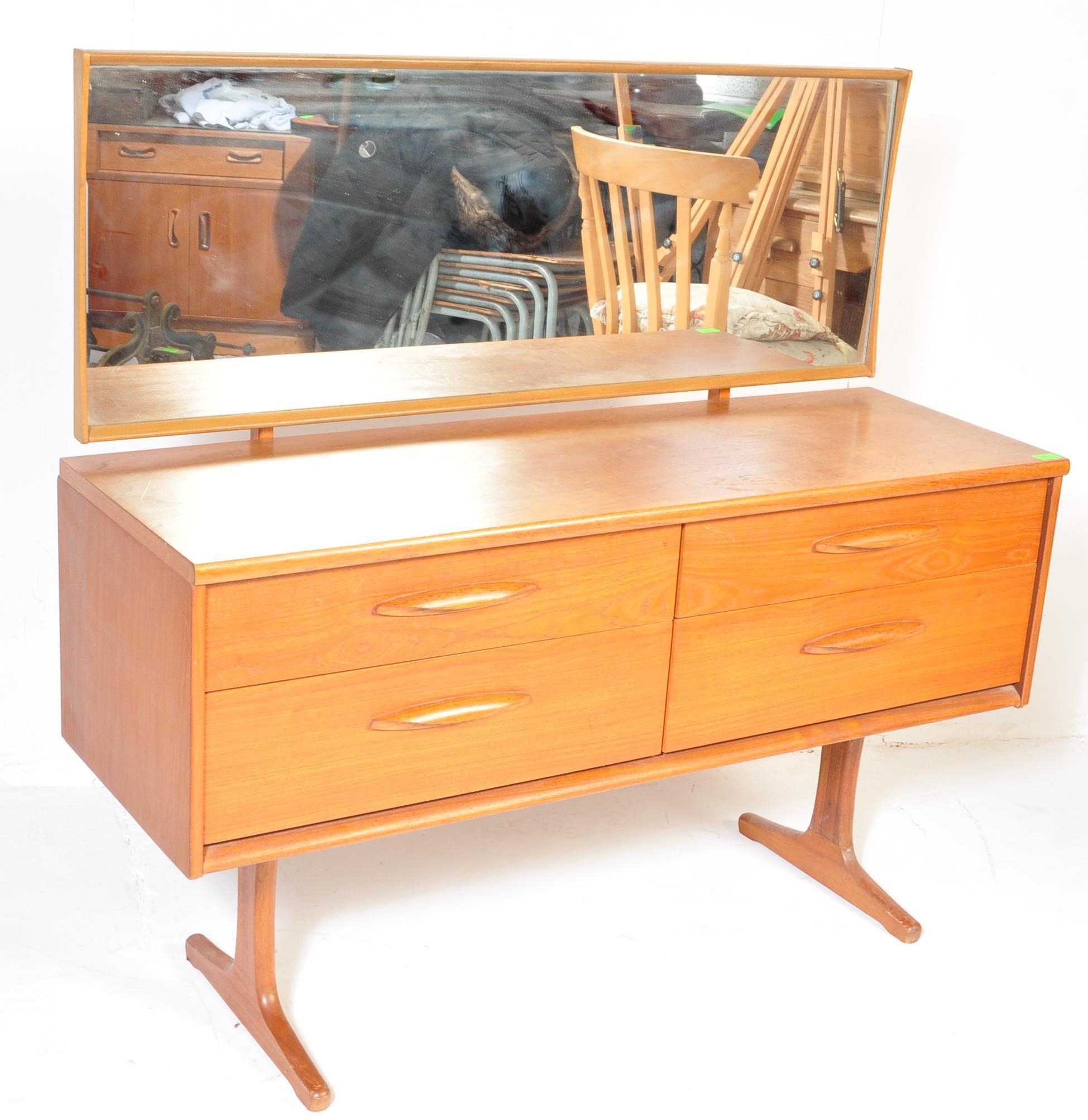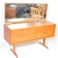 Mid century teak wood dressing table being raised on splayed legs with suspended body of four deep drawers with mirror atop. Measures approx. 117cm x 125cm x 47cm.