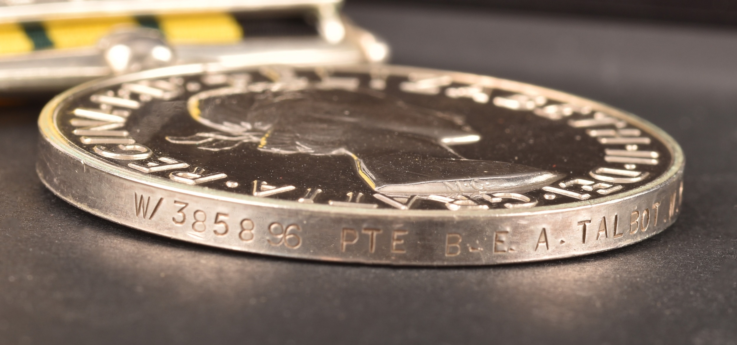An Africa General Service Medal 1902-1956, with Kenya clasp awarded to female recipient: W/385896 Private B. E. A. TalboTt Women's Royal Army Corps (W/385896 Pte B. E. A. Talbot W.R.A.C).