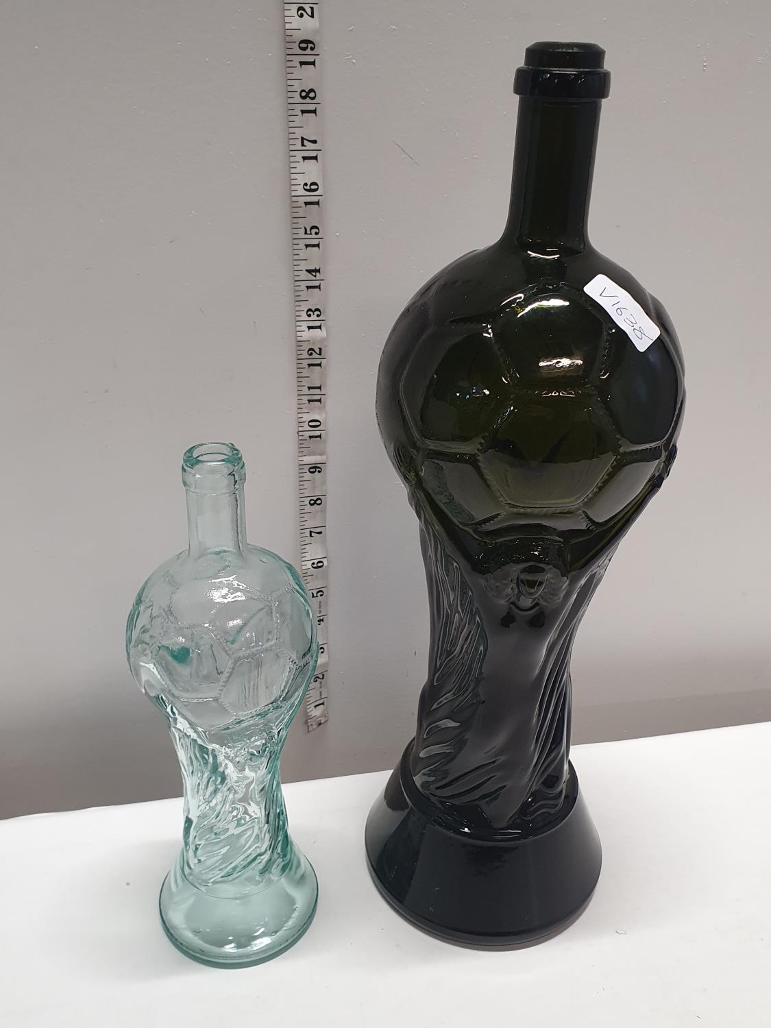 Two glass bottles in the form of The FIFA World Cup produced for Italia 1990 tallest 47cm, shipping unavailable