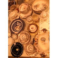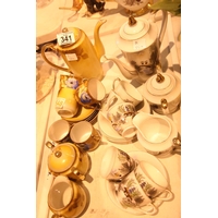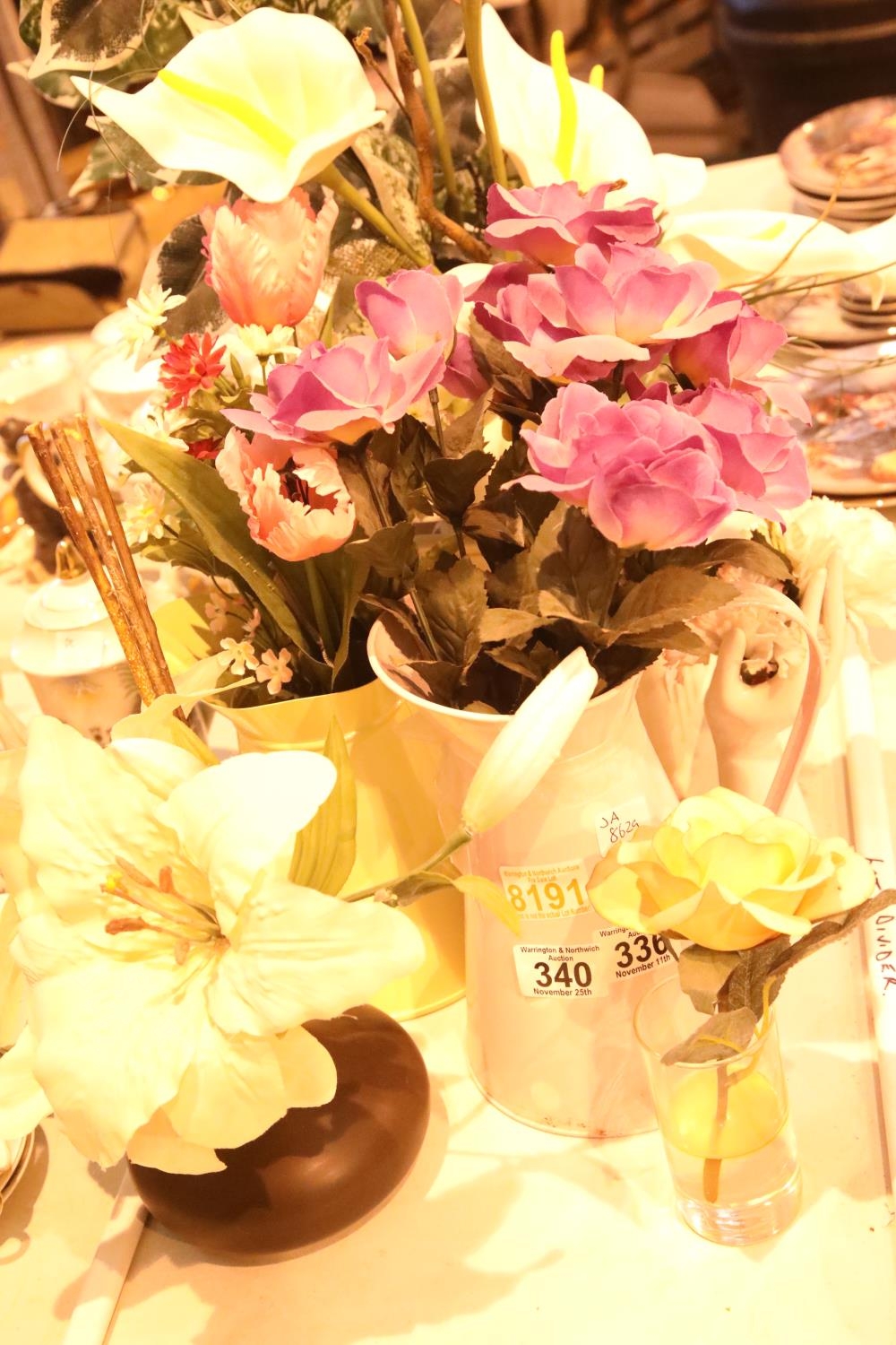 Six synthetic flower arrangements in an assortment of glass and china etc. Not available for in-house P&P