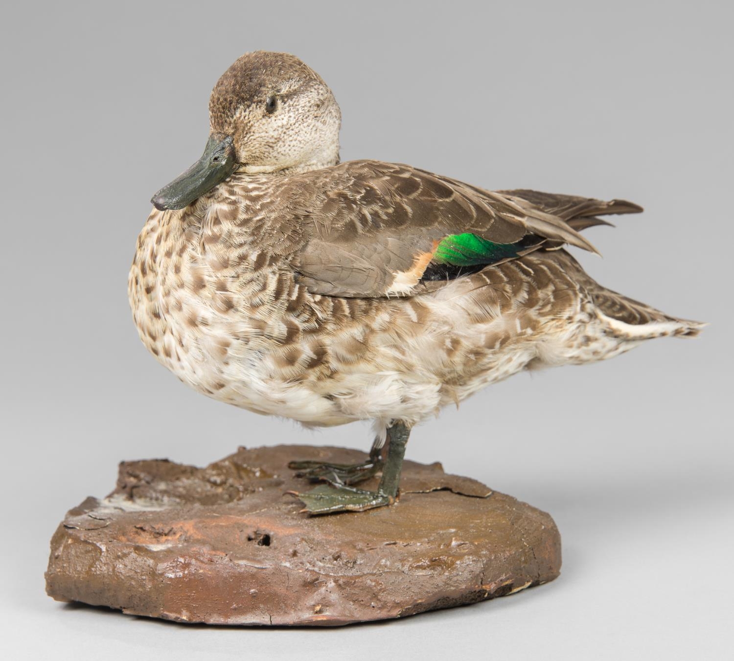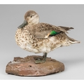 A 20TH CENTURY TAXIDERMY TEAL UPON A NATURALISTIC BASE.