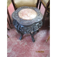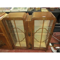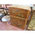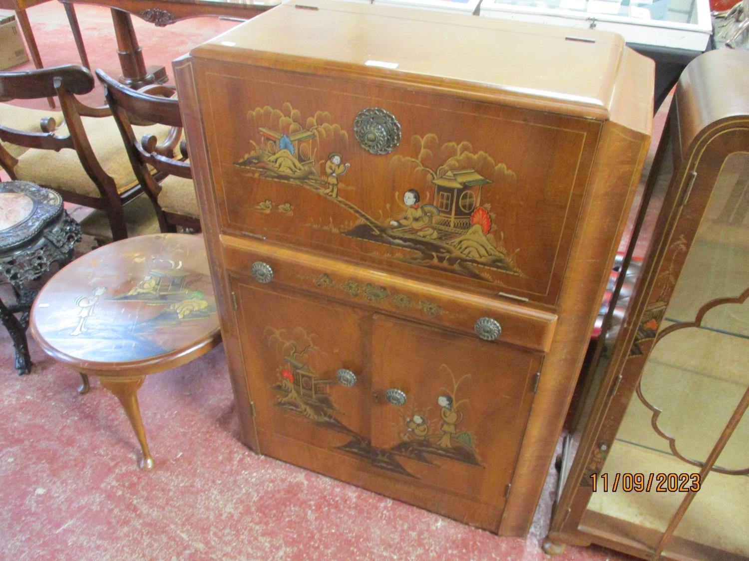 A mid century walnut cocktail cabinet with cantilever opening system with oriental decoration together with a matching coffee table