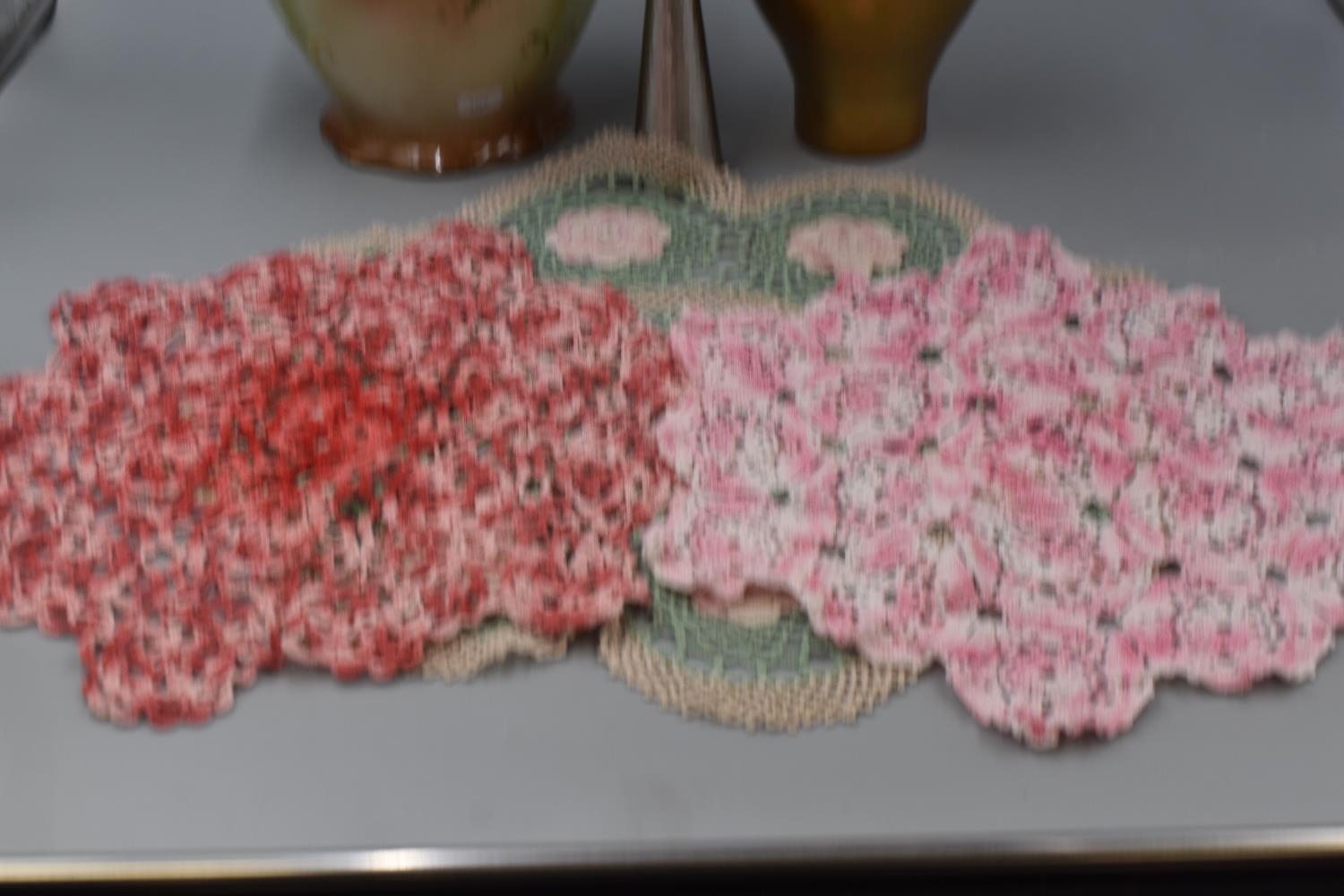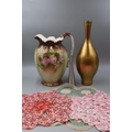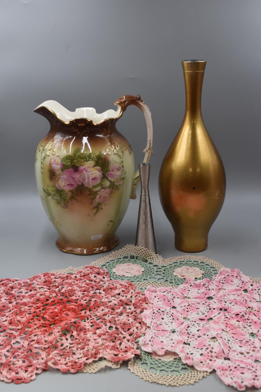 Large Pouring Jug, Glass Vase, Dragon Pewter and Selection of Lace Doilies