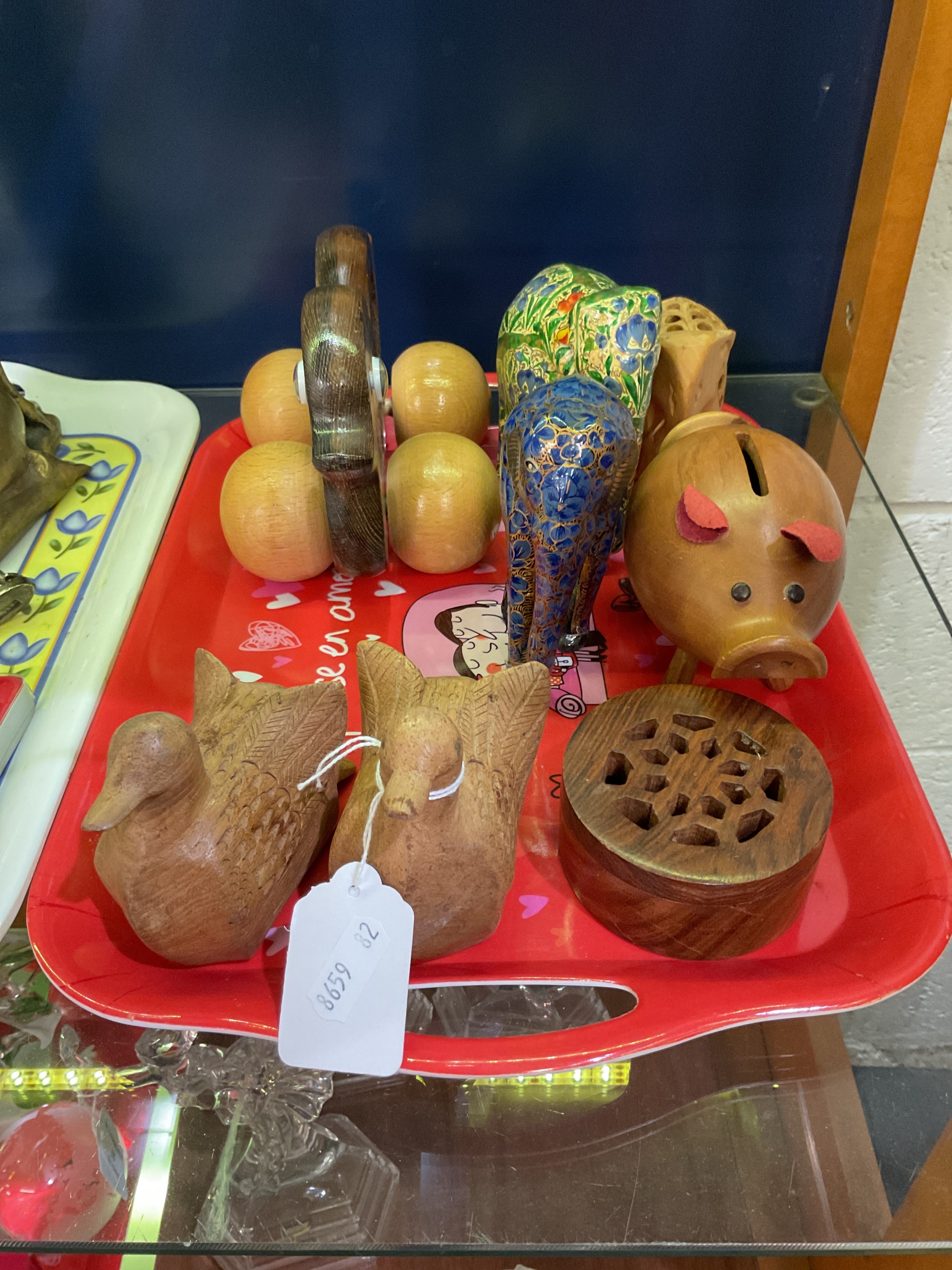 A mixed selection of treen items to include carved elephants, ducks and a pig money box