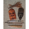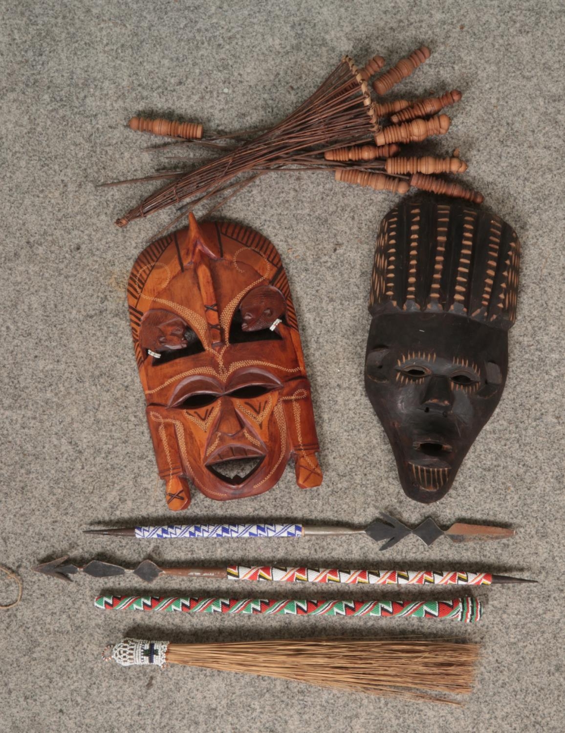 A collection of African items including two tribal masks, ceremonial spears, beaded ceremonial club, hand held sweeping brush etc