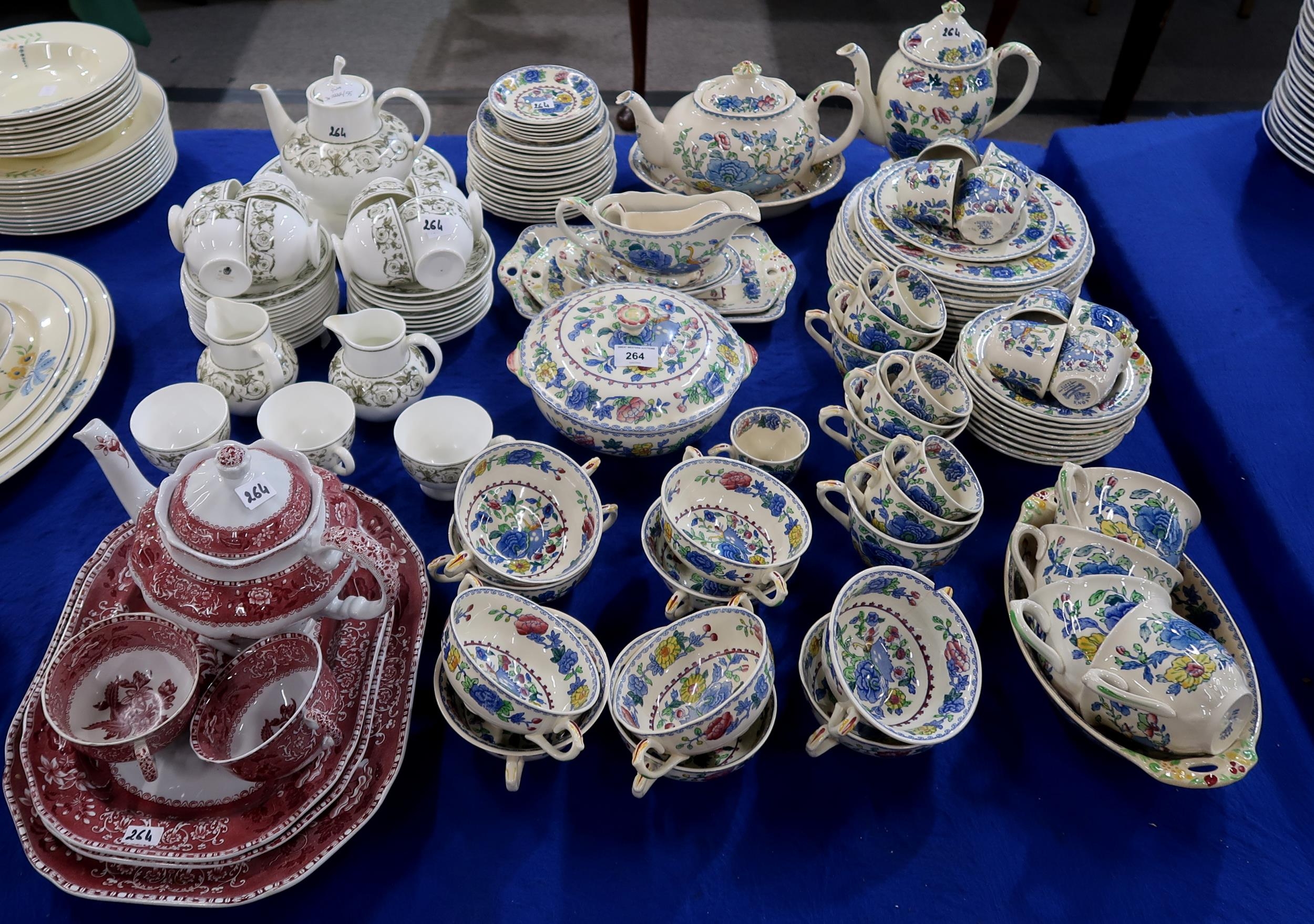 A Masons Regency pattern dinner service comprising cups, saucers, plates, soup coupes, bowls tureen etc, together with a Wedgwood Perugia pattern teaset and Spode Pink Camelia wares