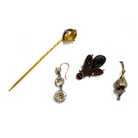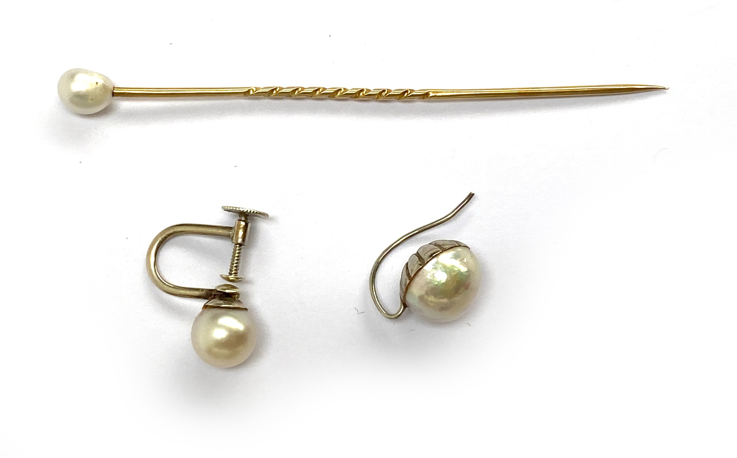 A Victorian gold and pearl stick pin, the pearl likely natural, the pearl 5mmL, unmarked but tests as 14ct or higher, 1.1g; together with two white gold mounted single pearl earrings, test as 9ct or higher, 2.7g (3)