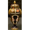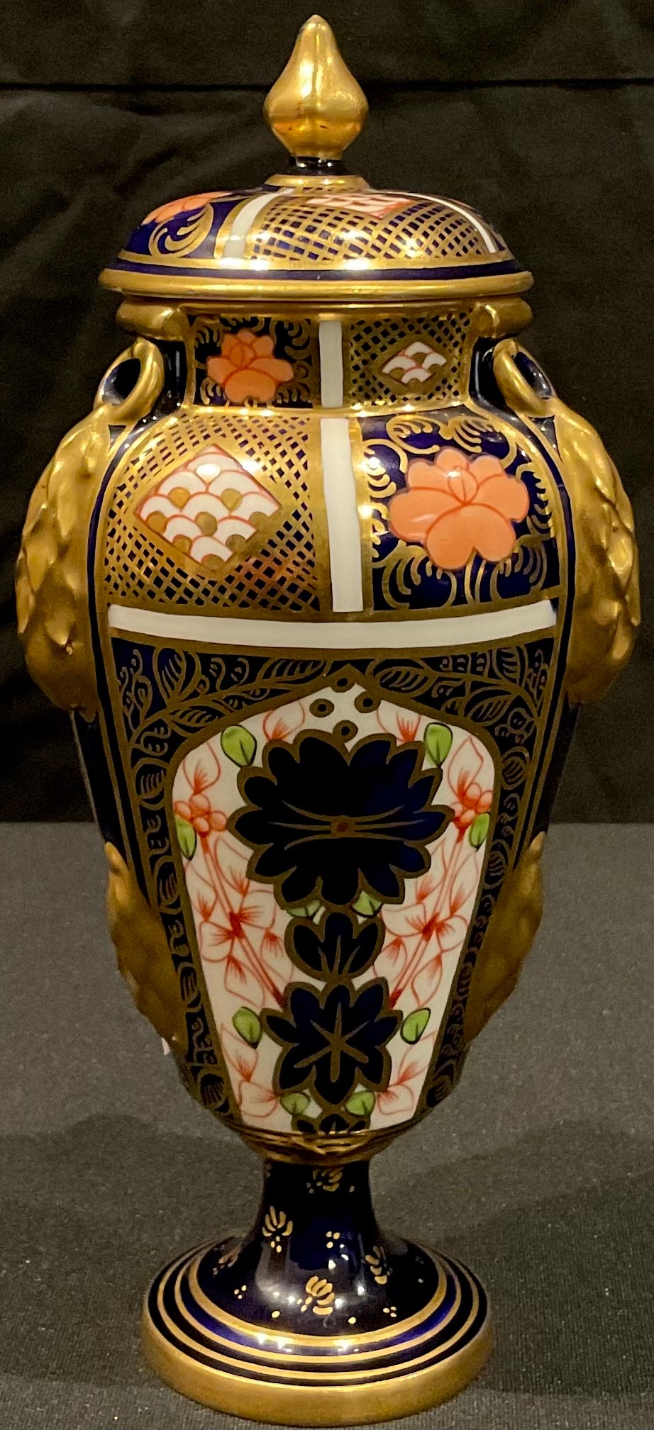 A Royal Crown Derby Imari palette 1128 pattern pedestal vase and cover, the domed cover with spire finial, four lug handles, stepped circular base, 17.5cm, year cypher for 1909