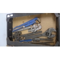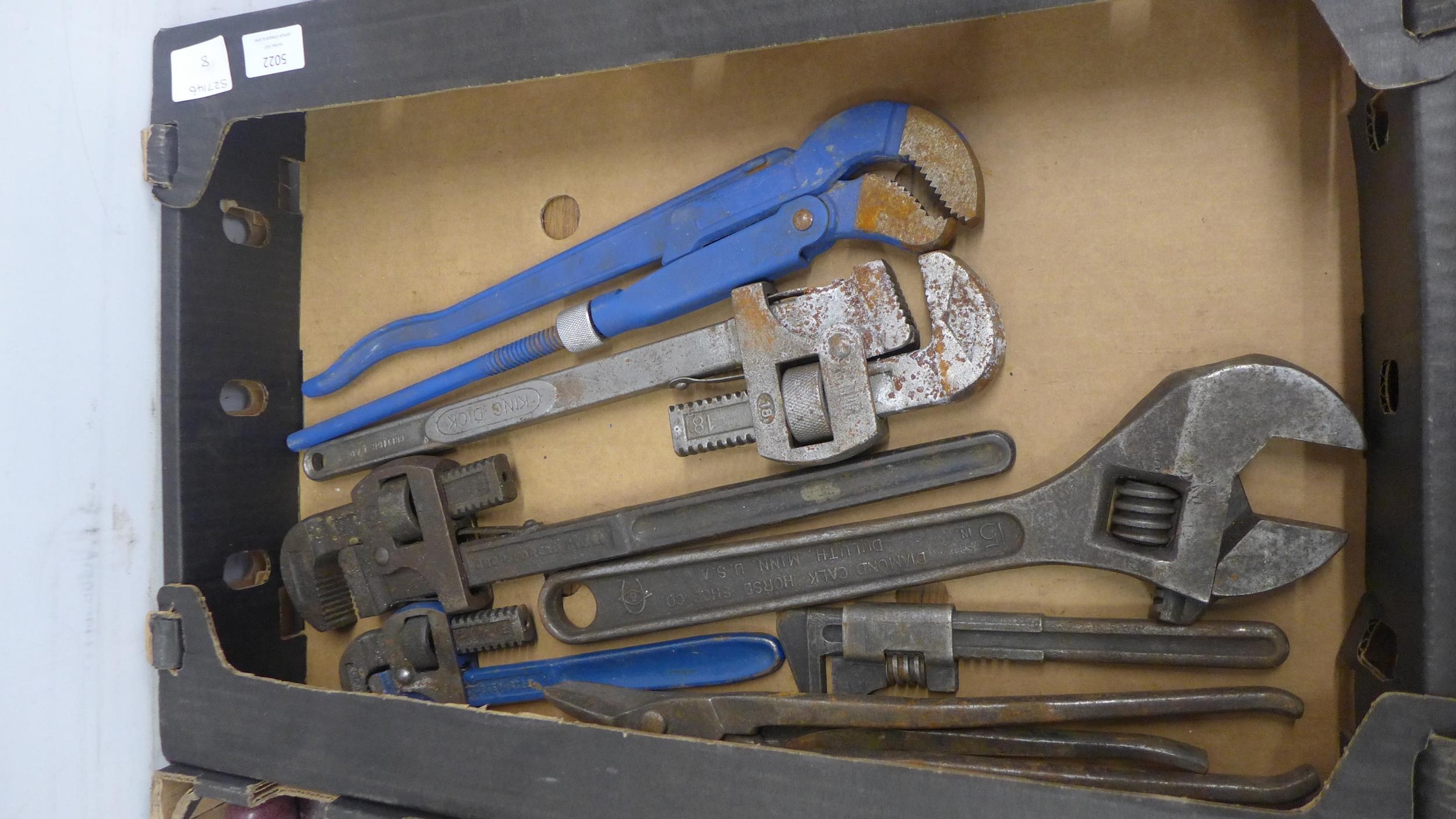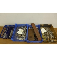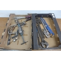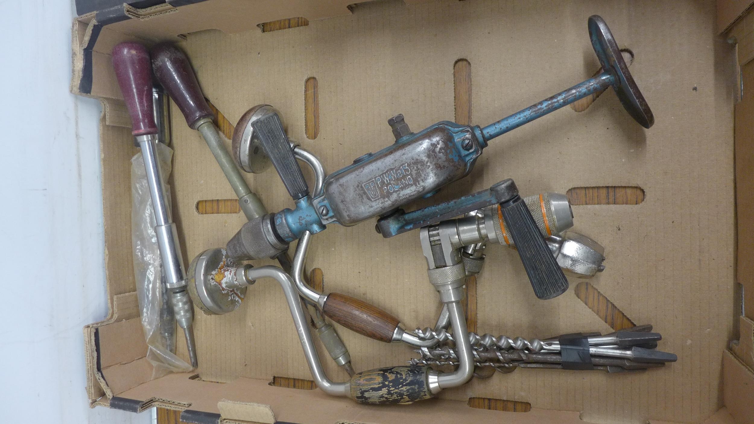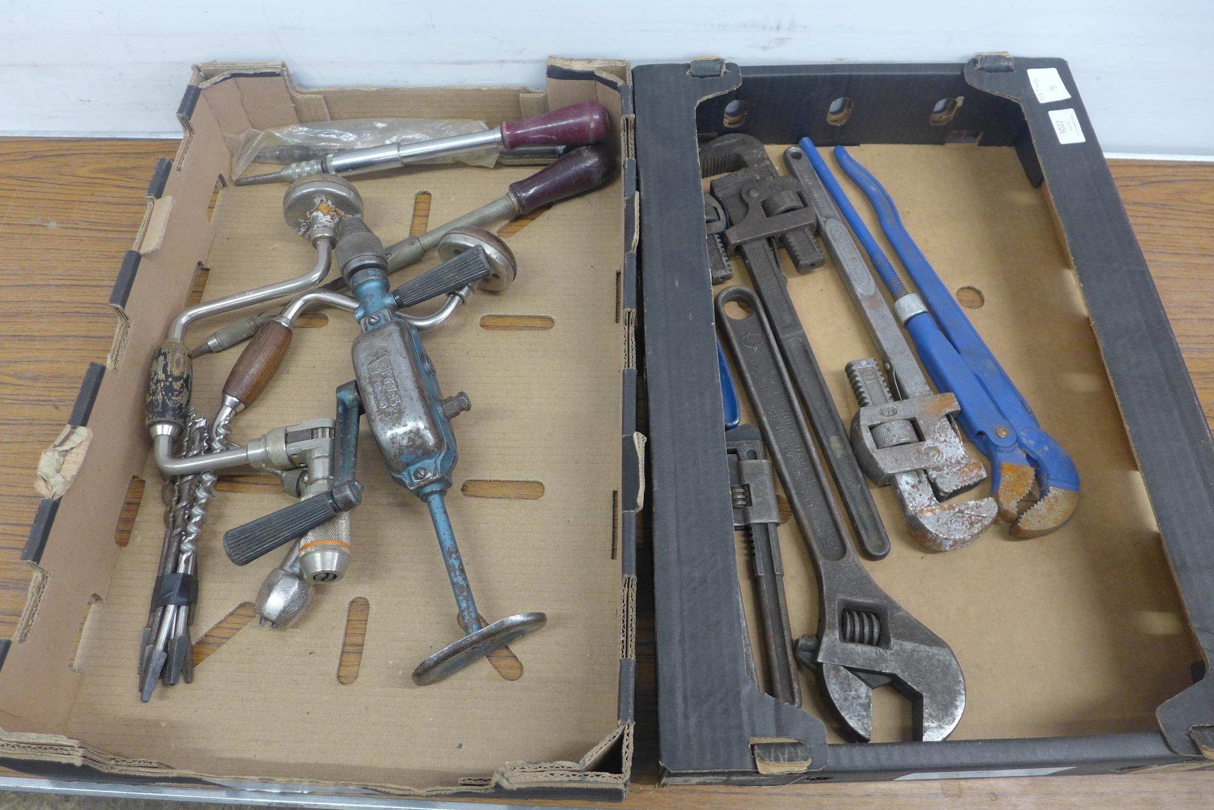 2 boxes of tools containing large wrenches, hand drills and drill bits etc.