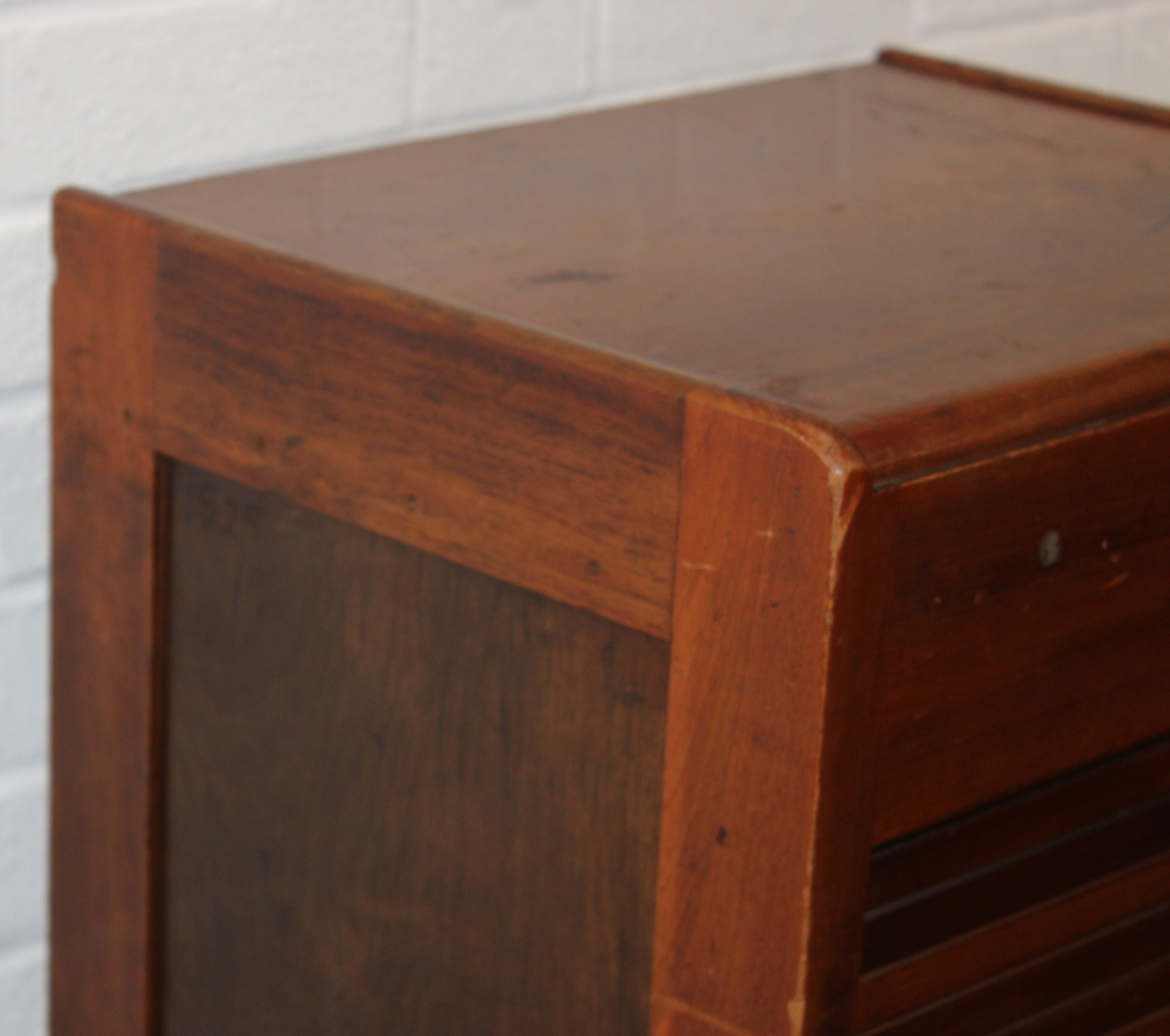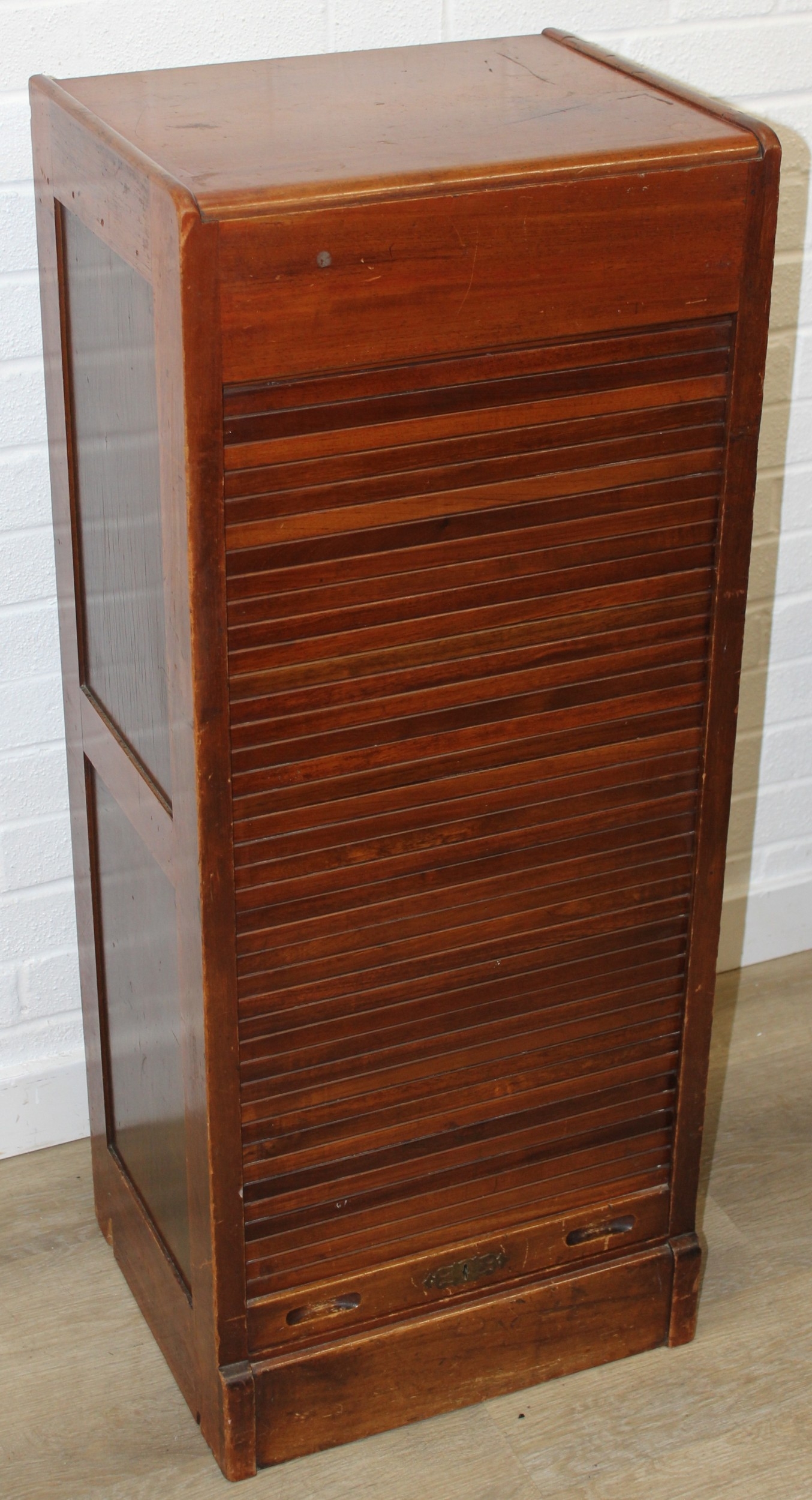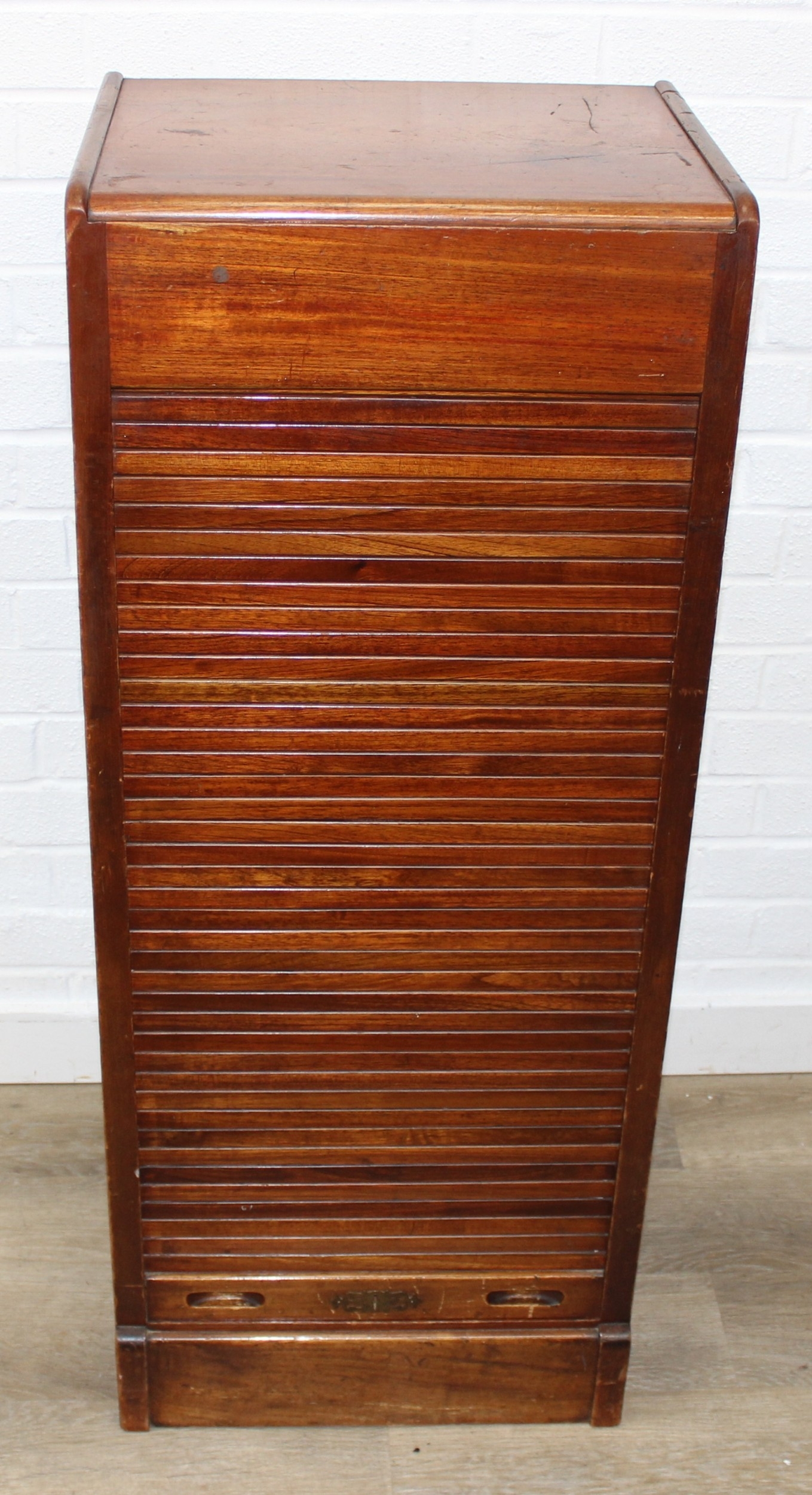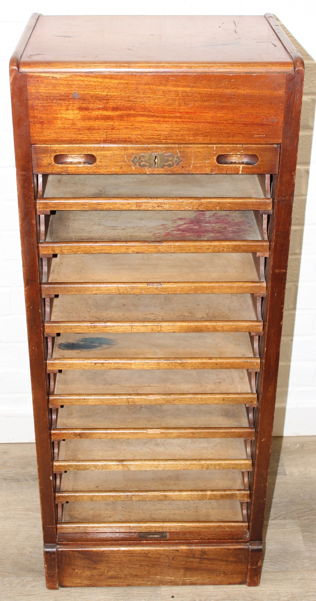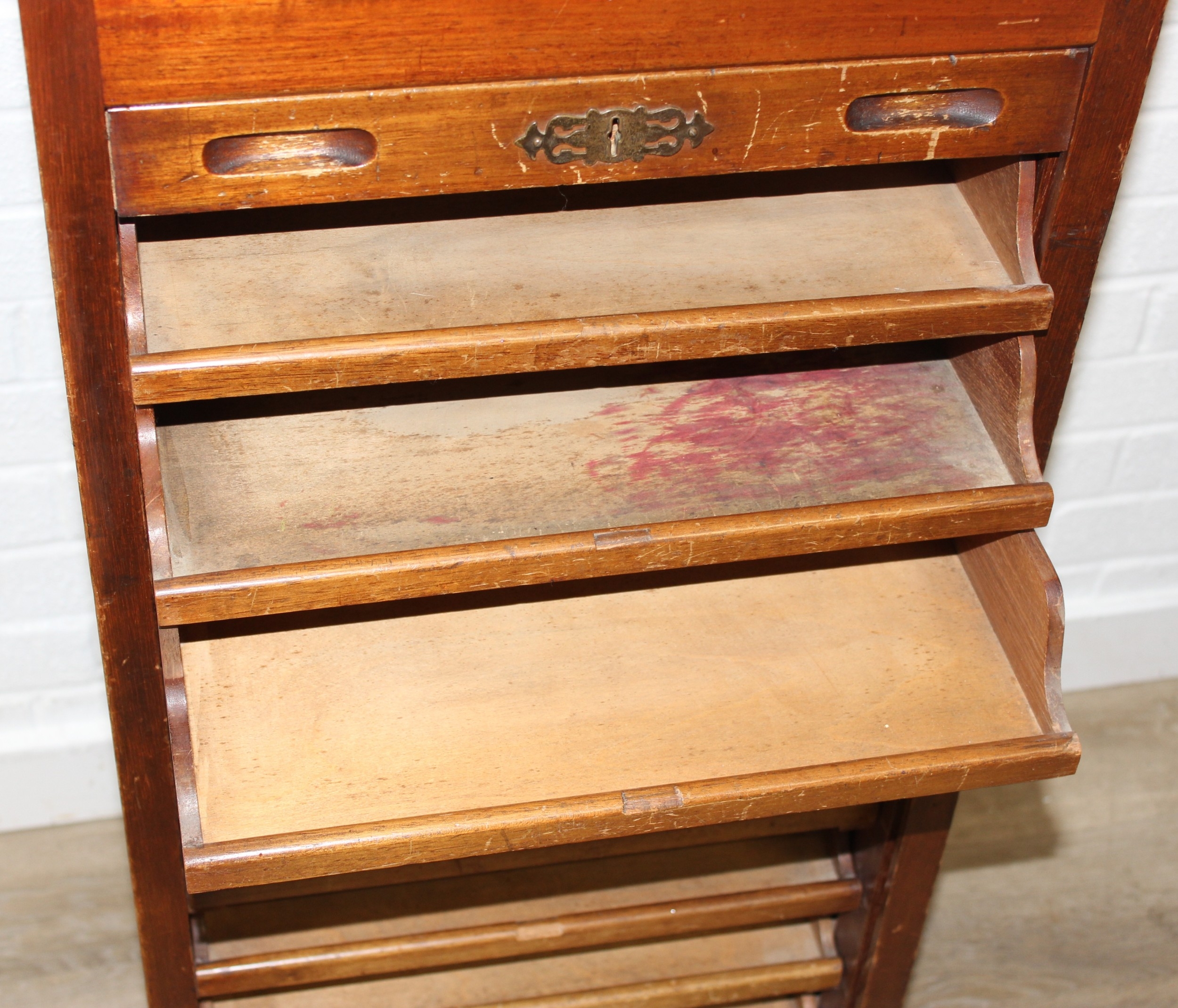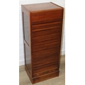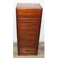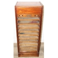 An early 20th century tambour fronted music or filing cabinet with ten sliding drawers, 45cm x 36cm x 110cm