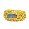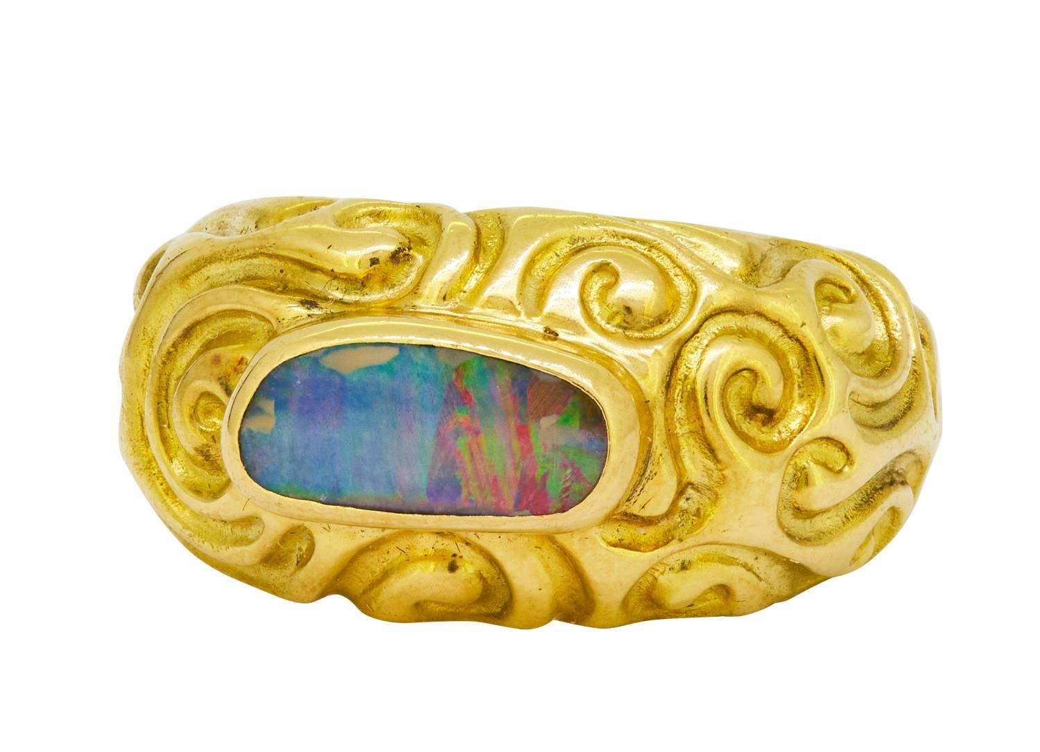 ELIZABETH GAGE, OPAL DRESS RING, in 18-ct gold. Set with an opal to the top, the shoulders and shank decorated with relief scrolling design. Signed Gage and makers mark EG. Size M. 9.7 grams.