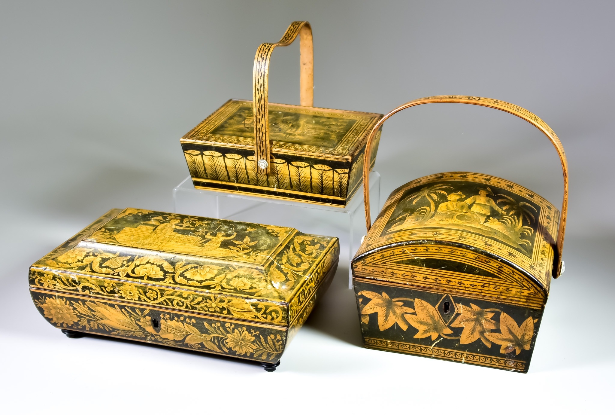 Three Wooden Pokerwork Boxes, comprising - a handled chest, with hinged lid to top, decorated with leaf garland to side and figures to lid, 6ins deep x 6ins wide x 4.5ins high, a sectioned box, floral pattern banding around side with oriental scene to top, 6ins deep x 9ins wide x 4 ins high, and another box with rural scene to top of lid
