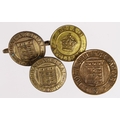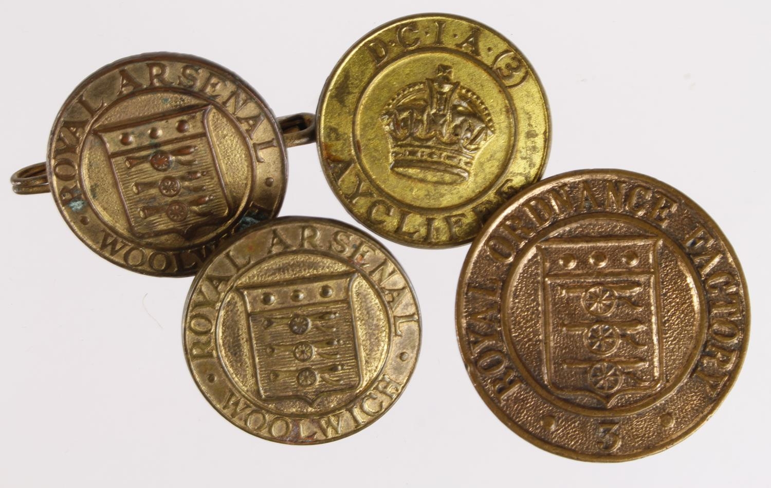 Badges: WW1 & WW2 Ordnance Factory Lapel Badges - Royal Arsenal Factory - 3, Glascoed stamped on the back with the makers name T.L.M.Ltd. Bham and Number: 2523 - 2x Royal Arsenal Woolwich stamped on the back with the makers name T&S Ltd. Bham and the numbers A3107 & N1766 - D.C.I.A. (3) Aycliffe Munitions Factory stamped on the back with the makers name T&S Ltd. Bham and the number 73. All the badges are in gilding-metal and are complete with their buttonhole fixings. (4 Items)