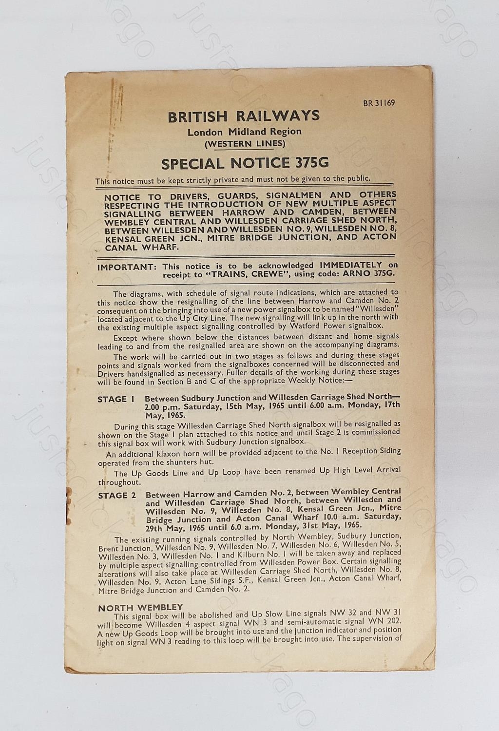 Railway. A B.R. London Midland Region Western Lines notice, "Special Notice 375G". 14 pages with good sized fold out signalling diagram of Harrow-Camden area. 1965. Rusting to staples.