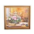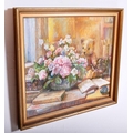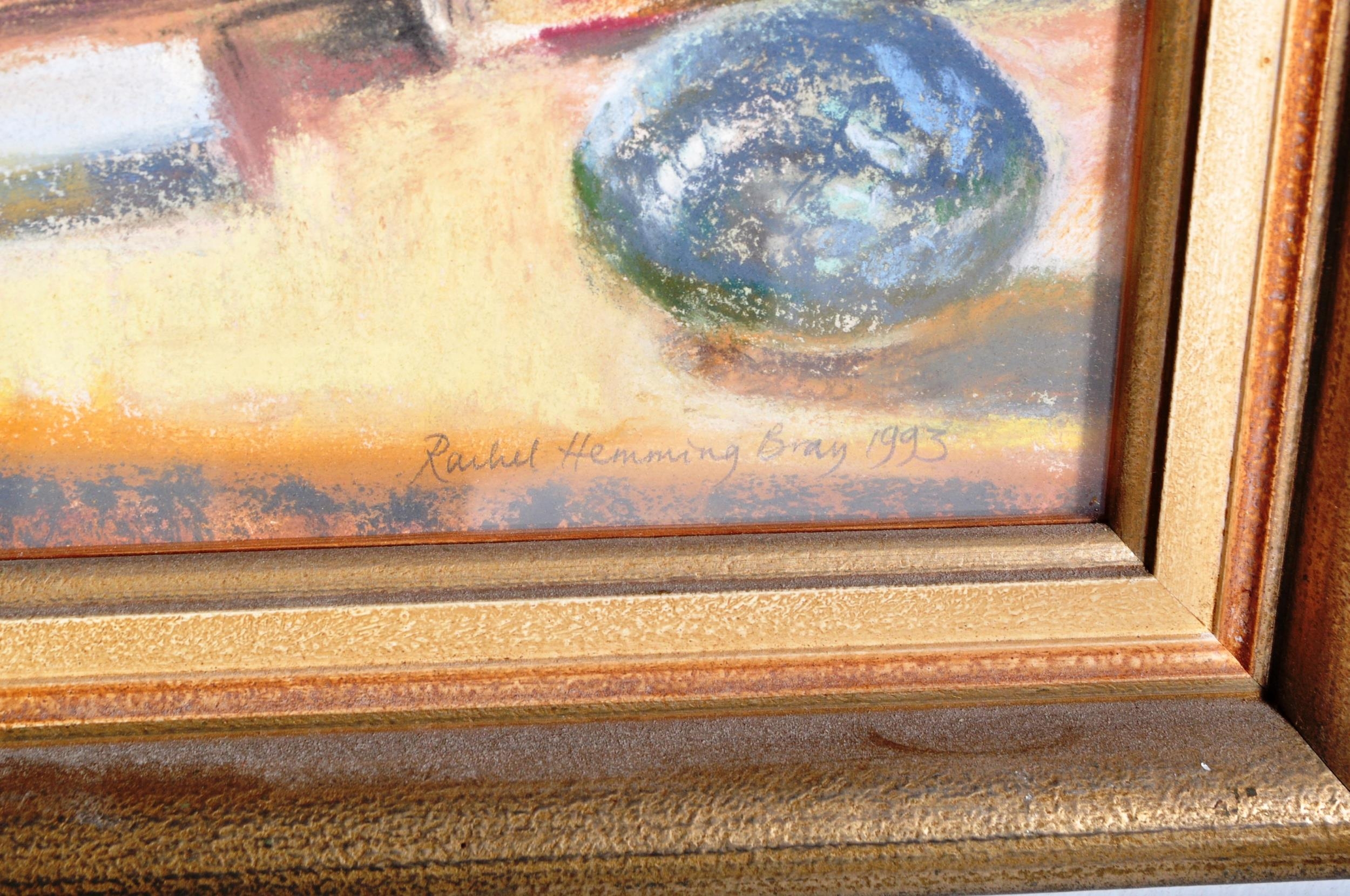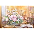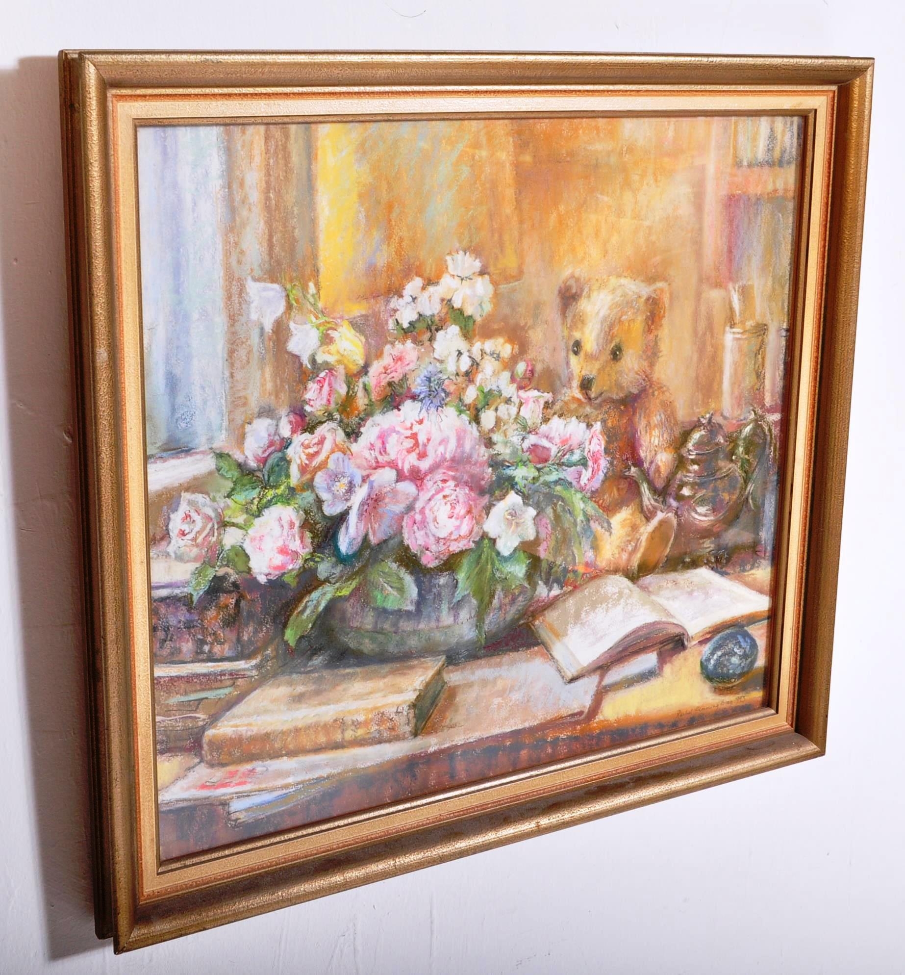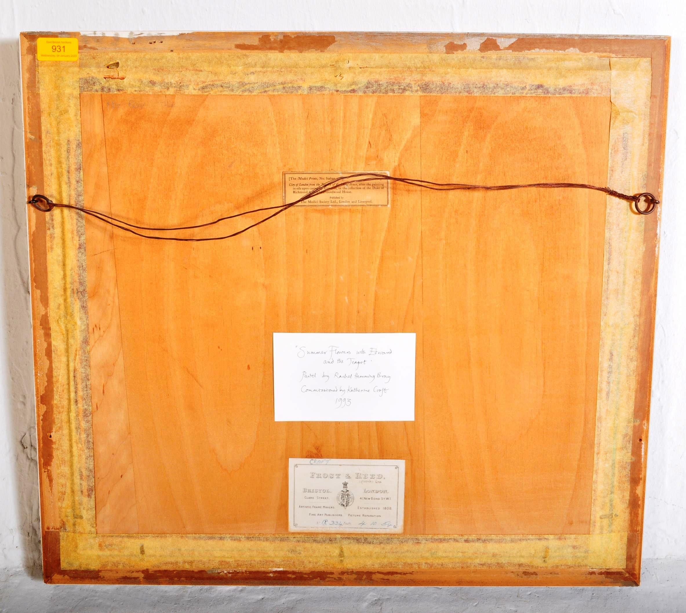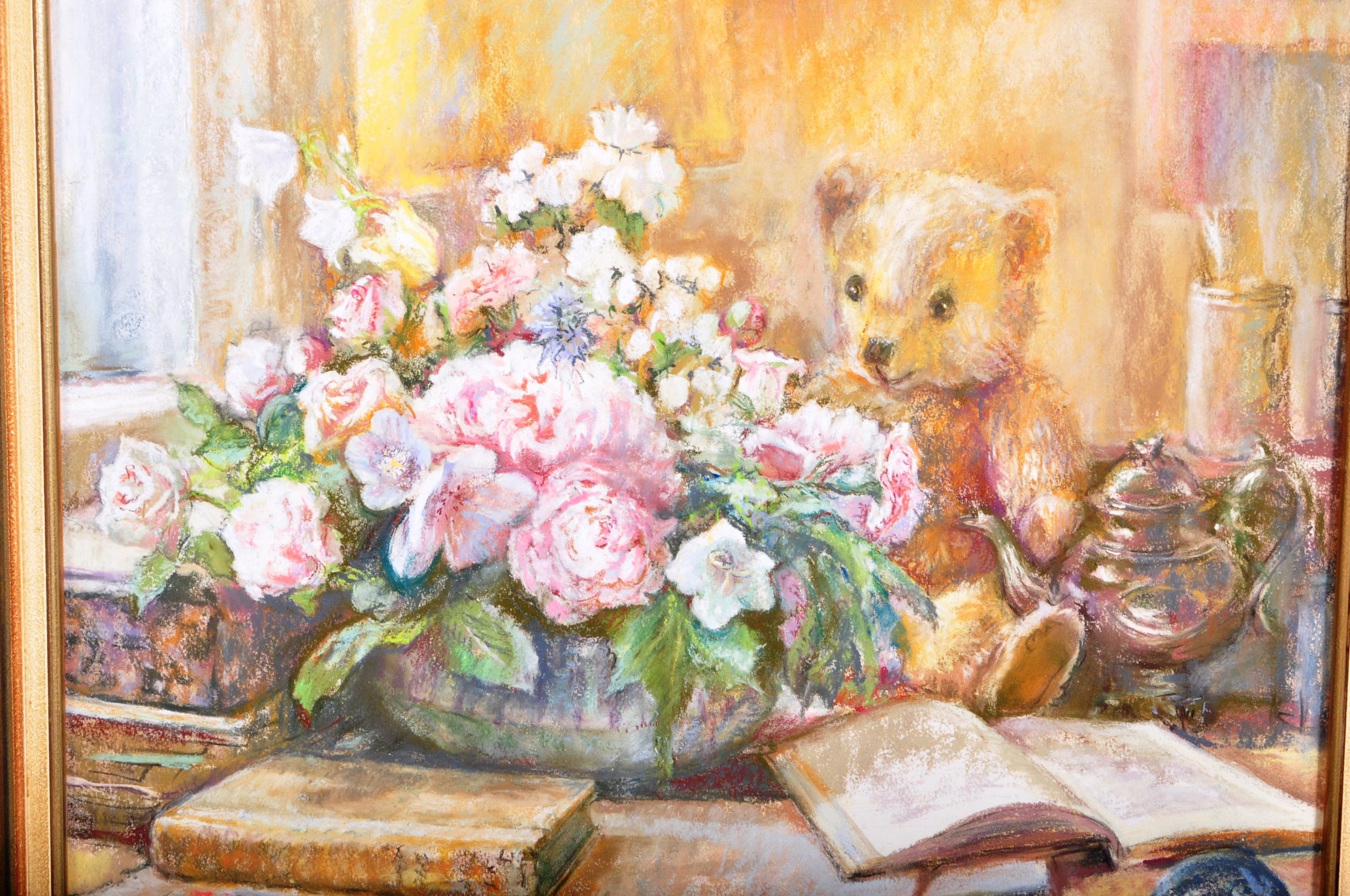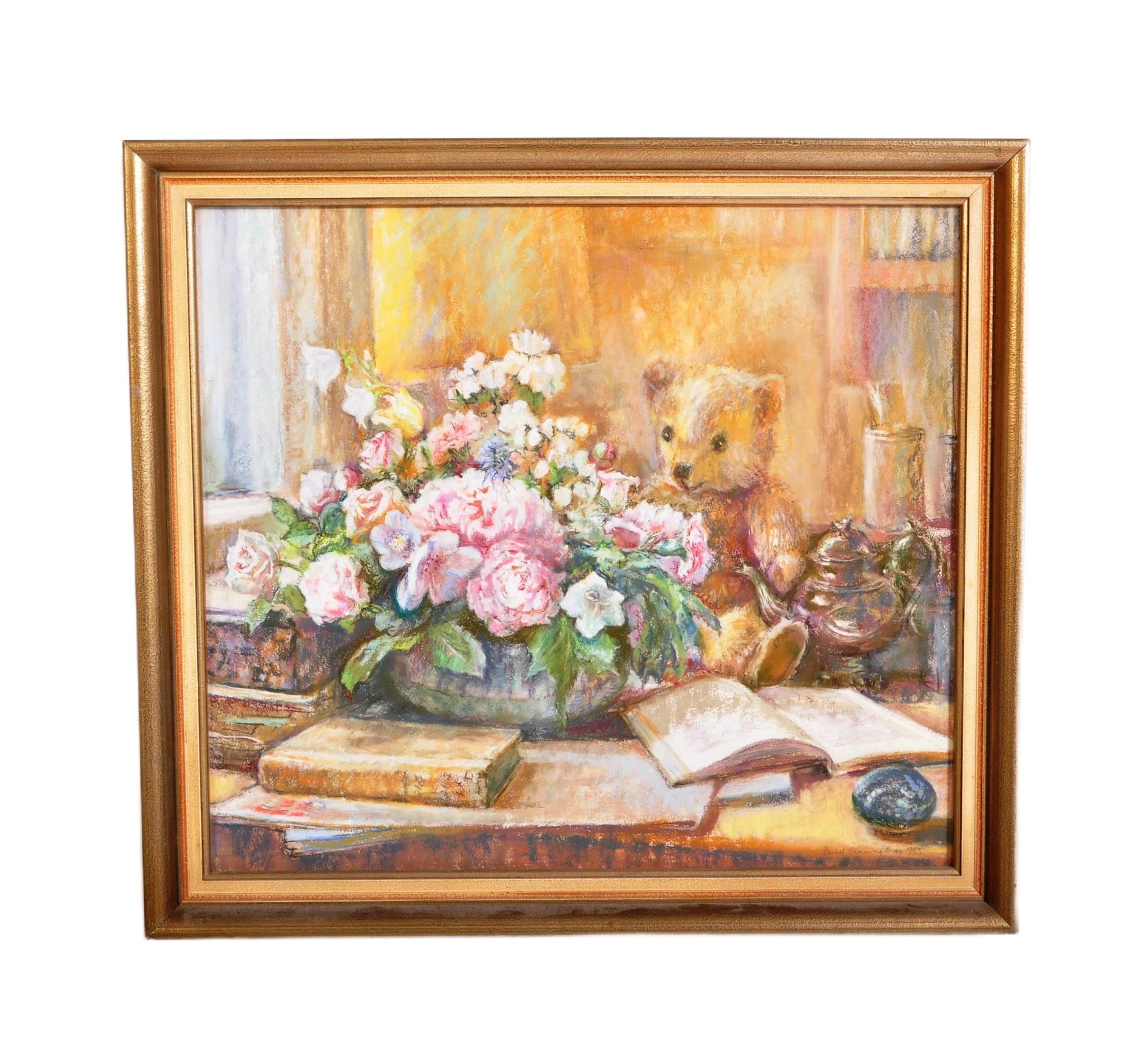 Rachel Hemming Bray (British, B.1947) - A Still life painting entitled Summer Flowers with Edward & the teapot. Pastel being signed and with label verso. Framed. Measures 55cm x 61cm.