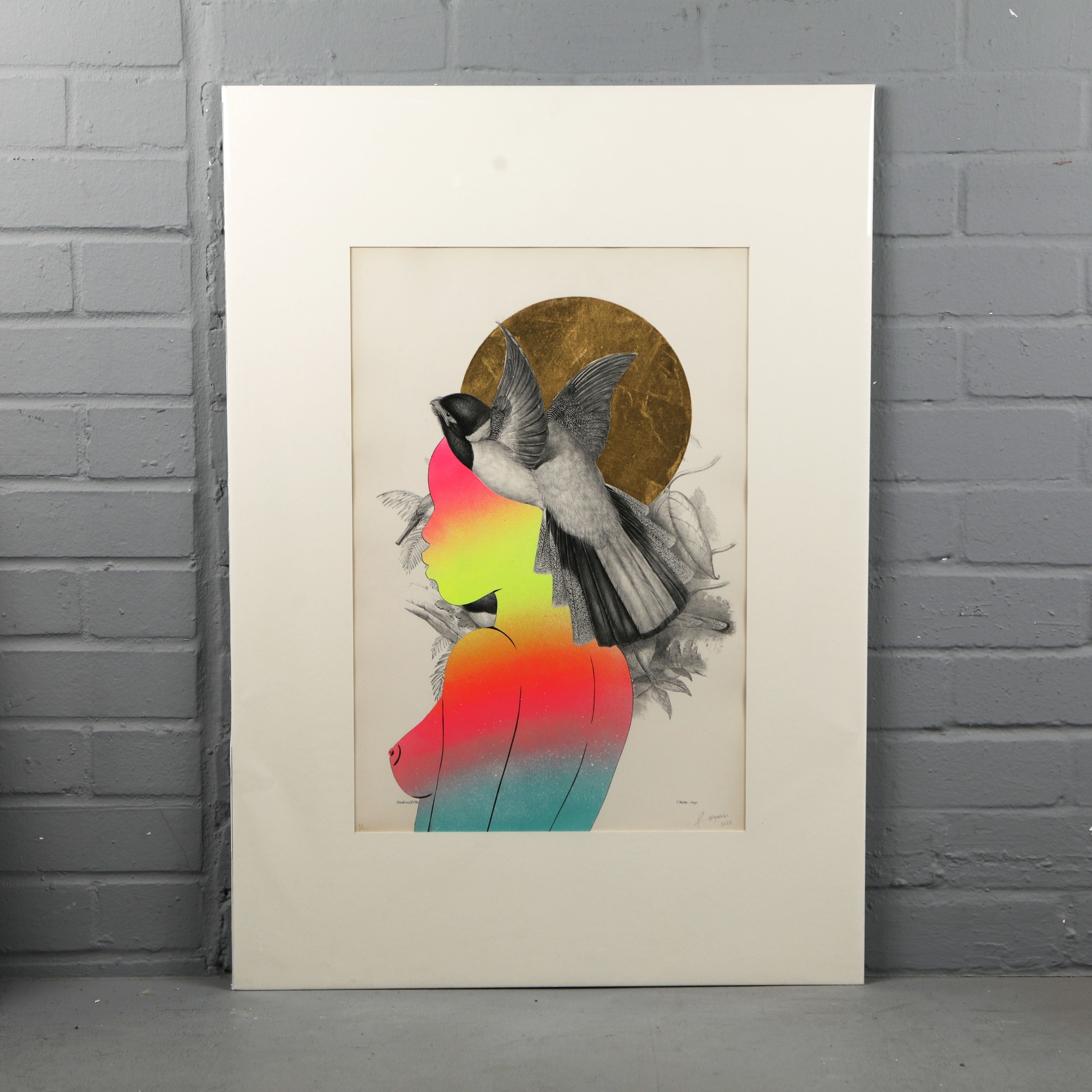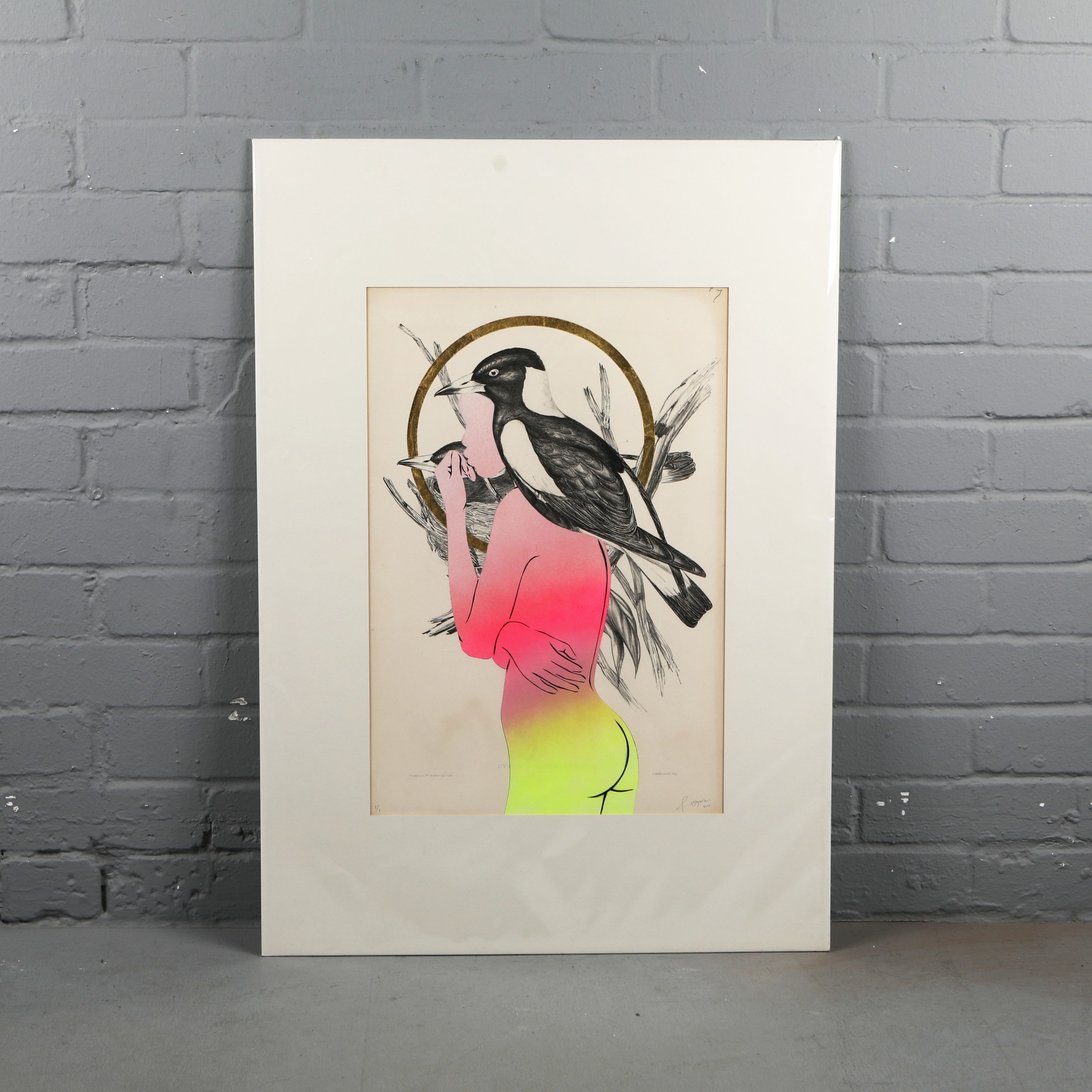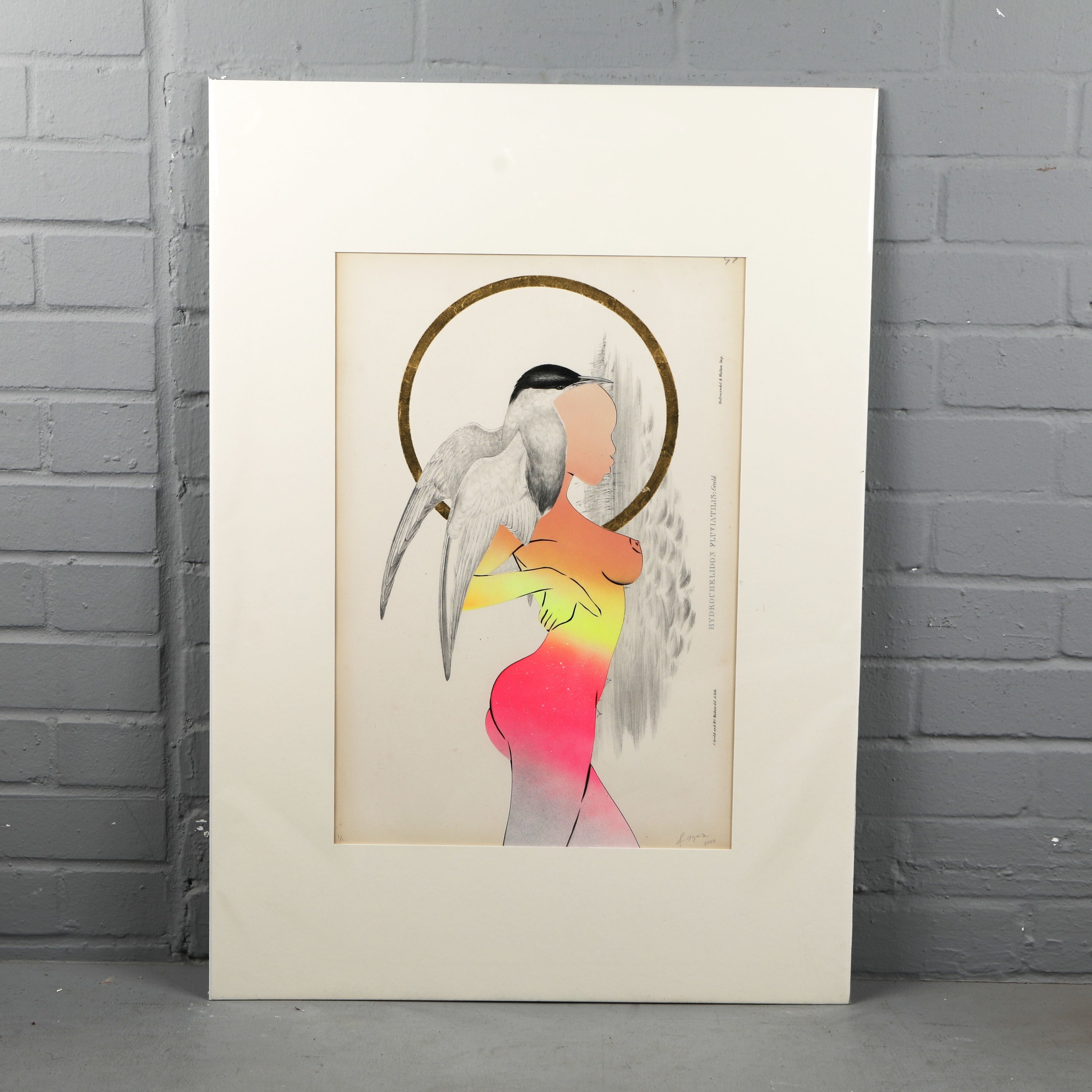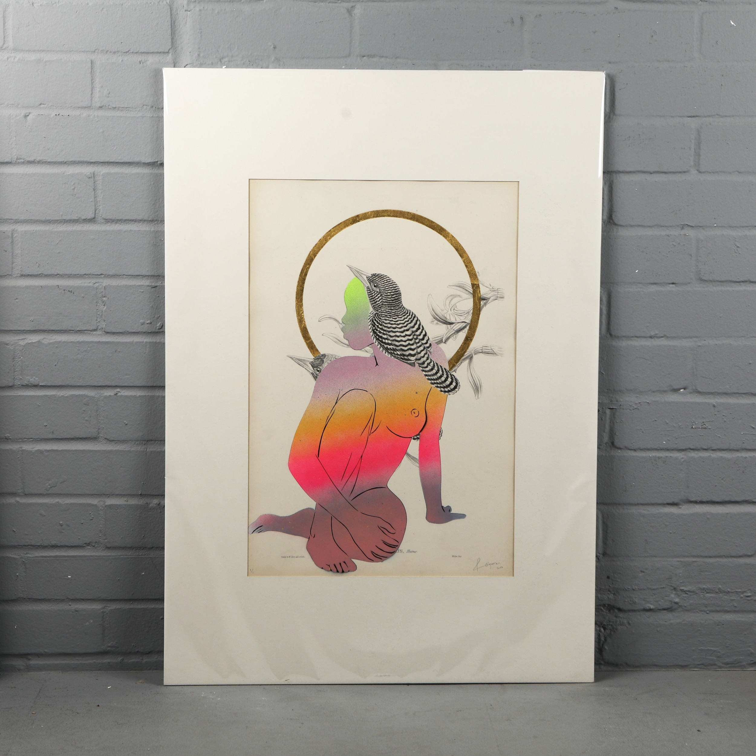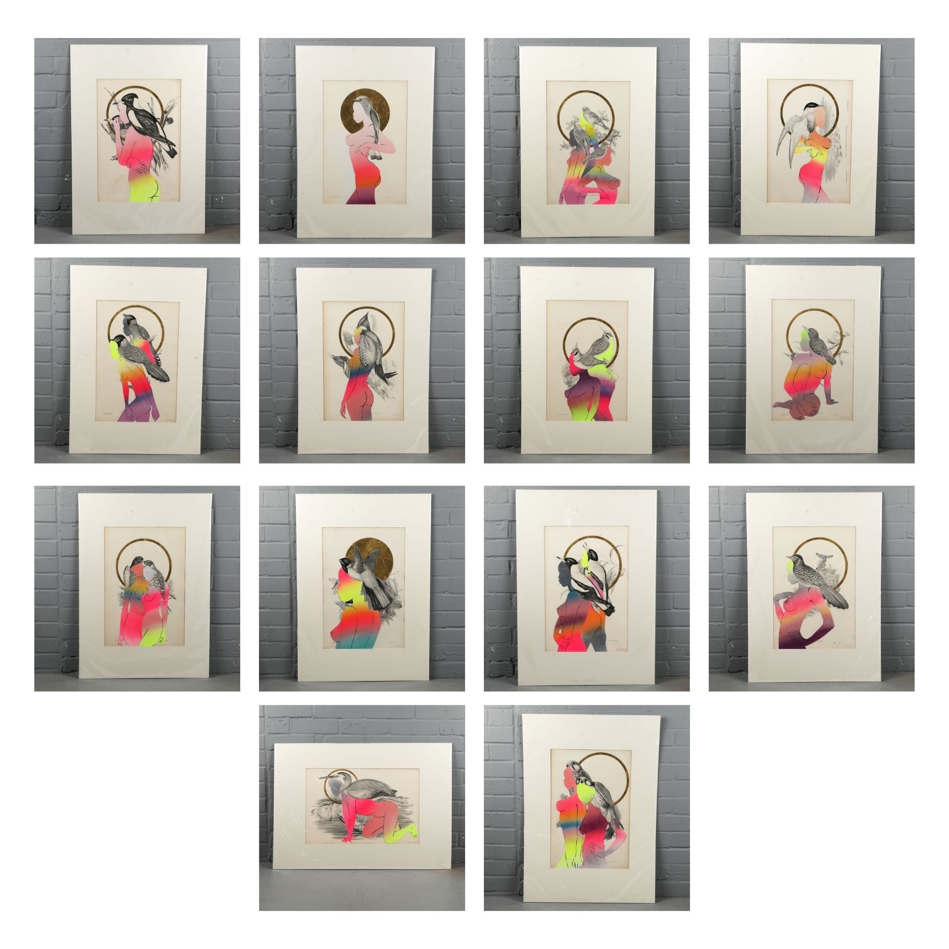 RUGMAN. JOHN GOULD ANTIQUARIAN PRINTS (14). Original lithographs by Gould with enamel, spray paint & 24 carat gold leaf by Rugman, signed by the artist, in collaboration with Sotheran's, each 84cm x 60cm, unframed.