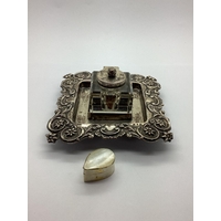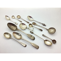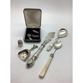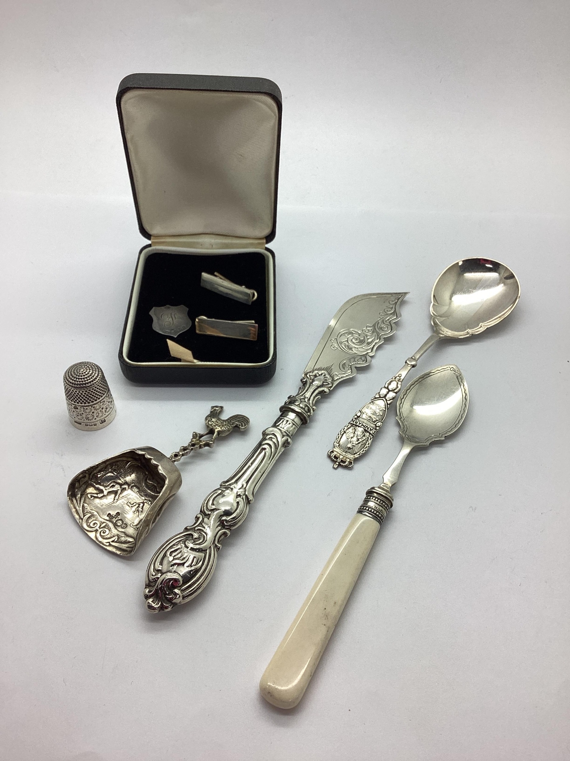 A Small Hallmarked Silver Shield Panel, initialled 'F' (2.1cm); a pair of panel pins, stamped "Silver"; a hallmarked silver thimble; DANMARK souvenir spoon, a Dutch export caddy spoon (stamped key mark), with cockerel finial; a decorative Victorian hallmarked silver butter knife and a preserve spoon. (8)