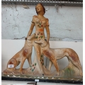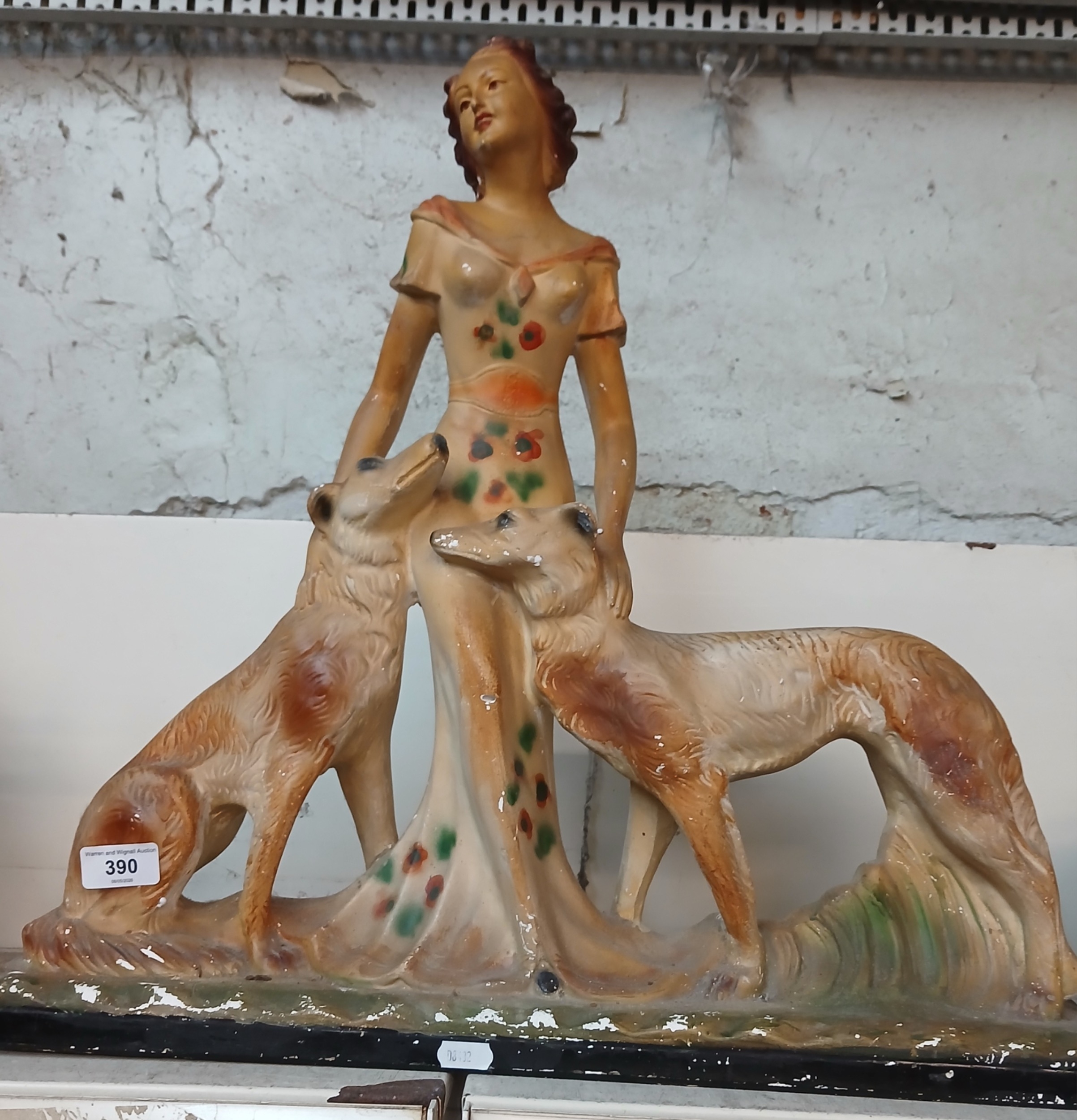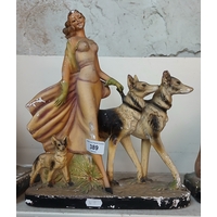 Large Art Deco chalk ware figure group of lady with 2 dogs