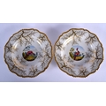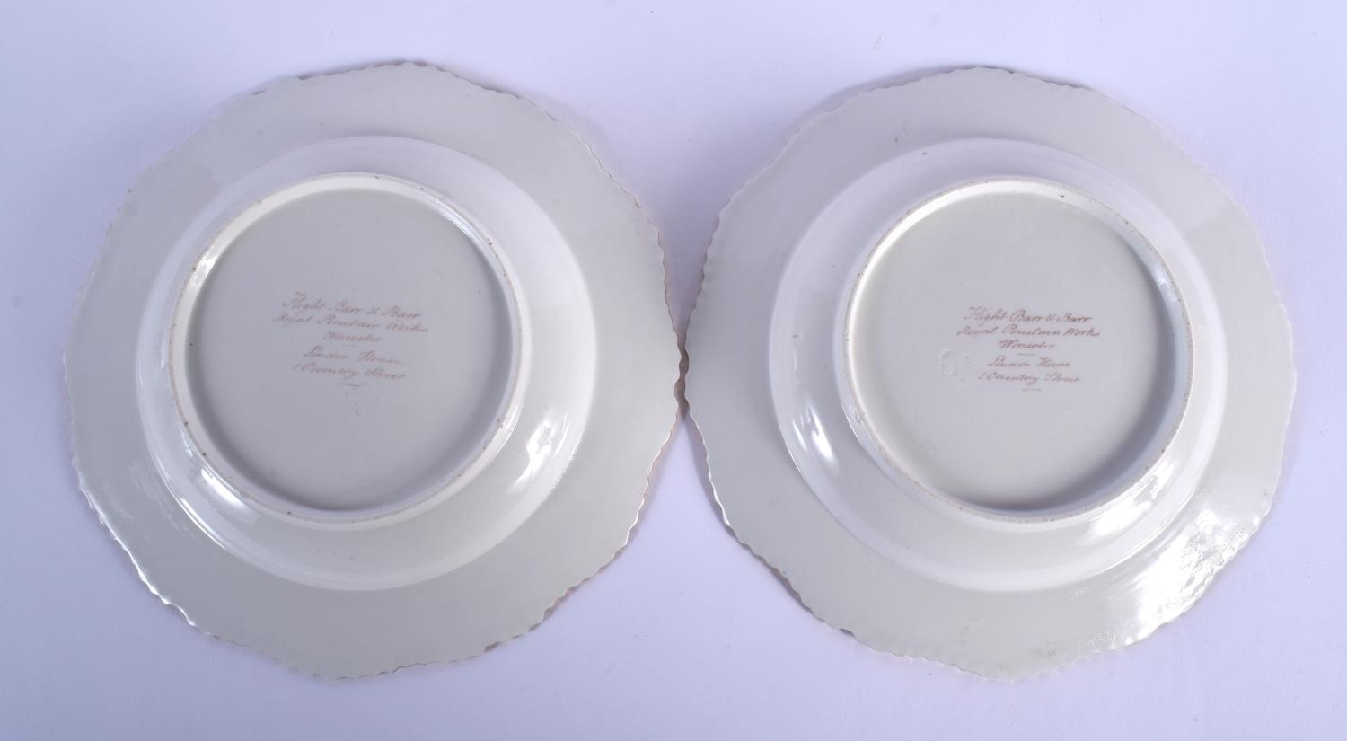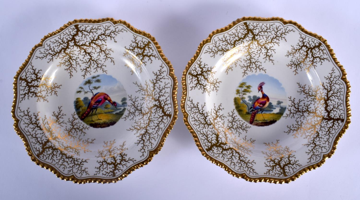 FLIGHT BARR AND BARR SHALLOW DISHES EACH HAND PAINTED WITH A BIRD OF PARADISE WITHIN IN GILT SEAWEED BORDERS, EACH WITH IMPRESSED MARKS AND FLIGHT BARR AND BARR SCRIPT MARKS TO THE REVERSE. 19.5cm diameter (2)