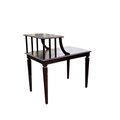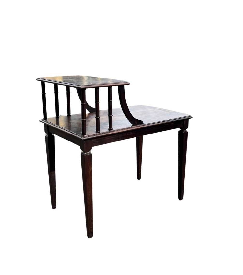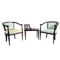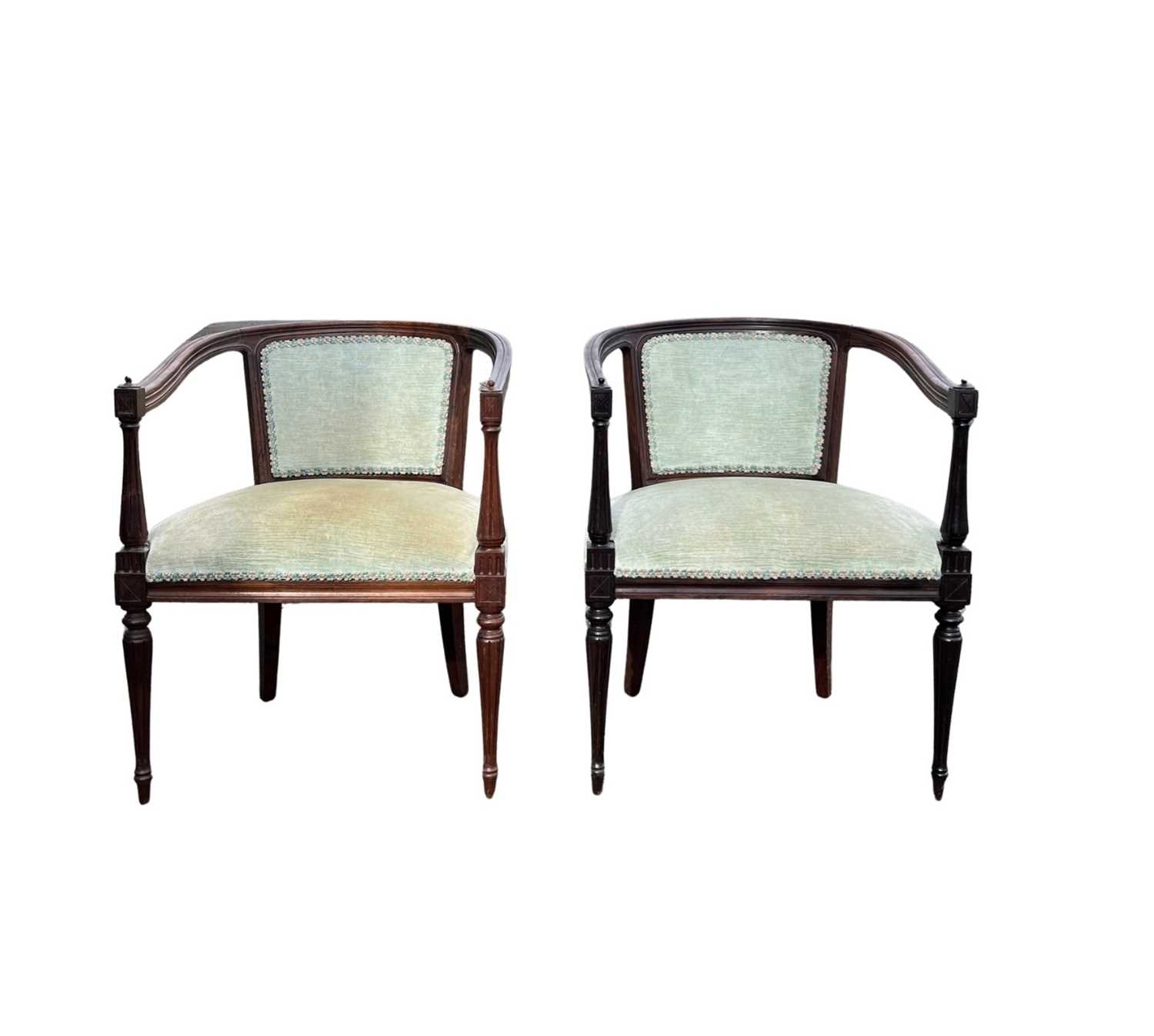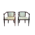 A pair of early 20th century rosewood tub chairs, open sided, padded central back, on slim tapering reeded legs, height approx 76cm, width 59cm, depth 58cm together with a hall or telephone table, square tapering legs, shelf to one side supported by turned spindles, height 65cm, width 65cm, depth 40.5cm (3)