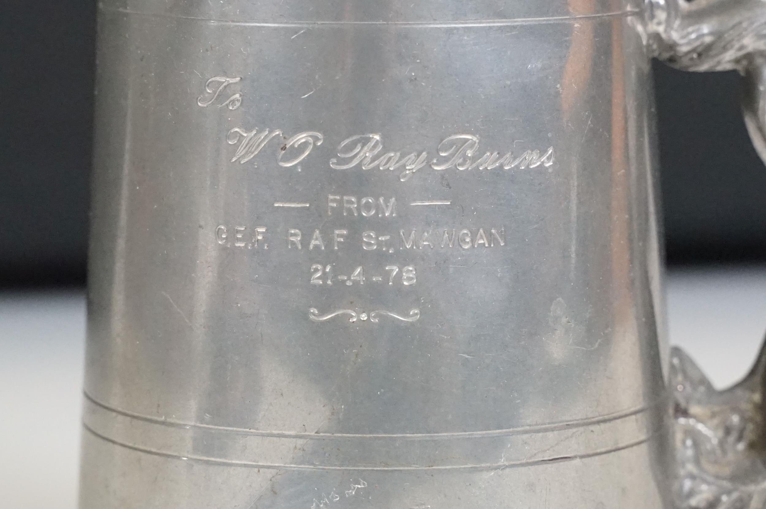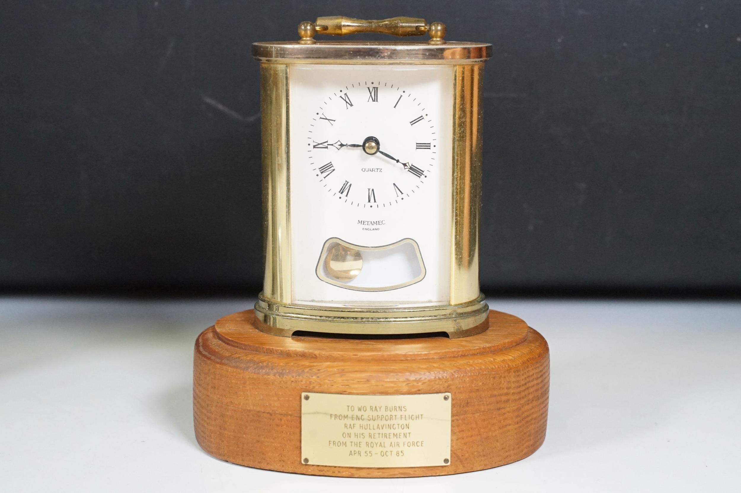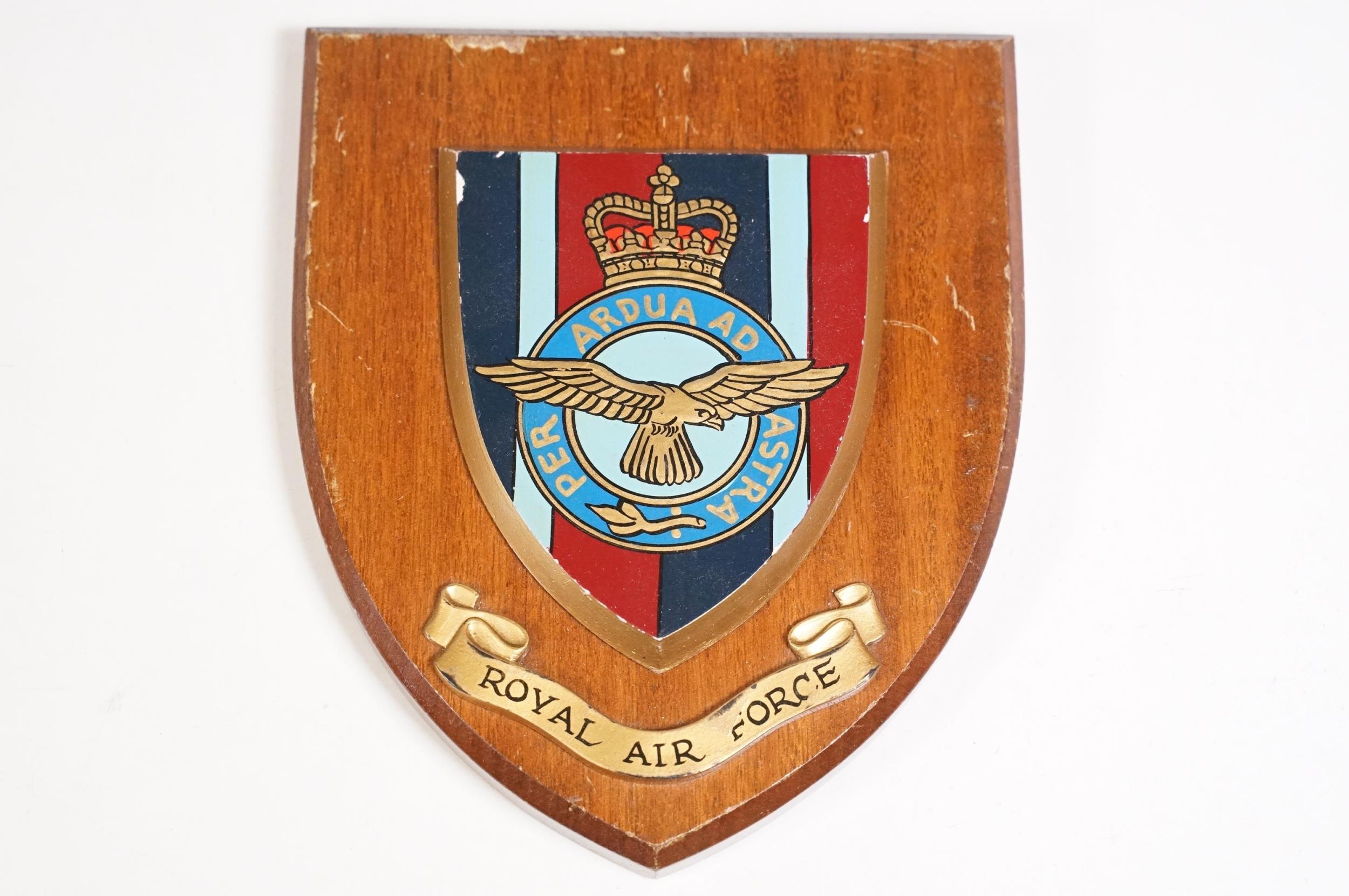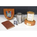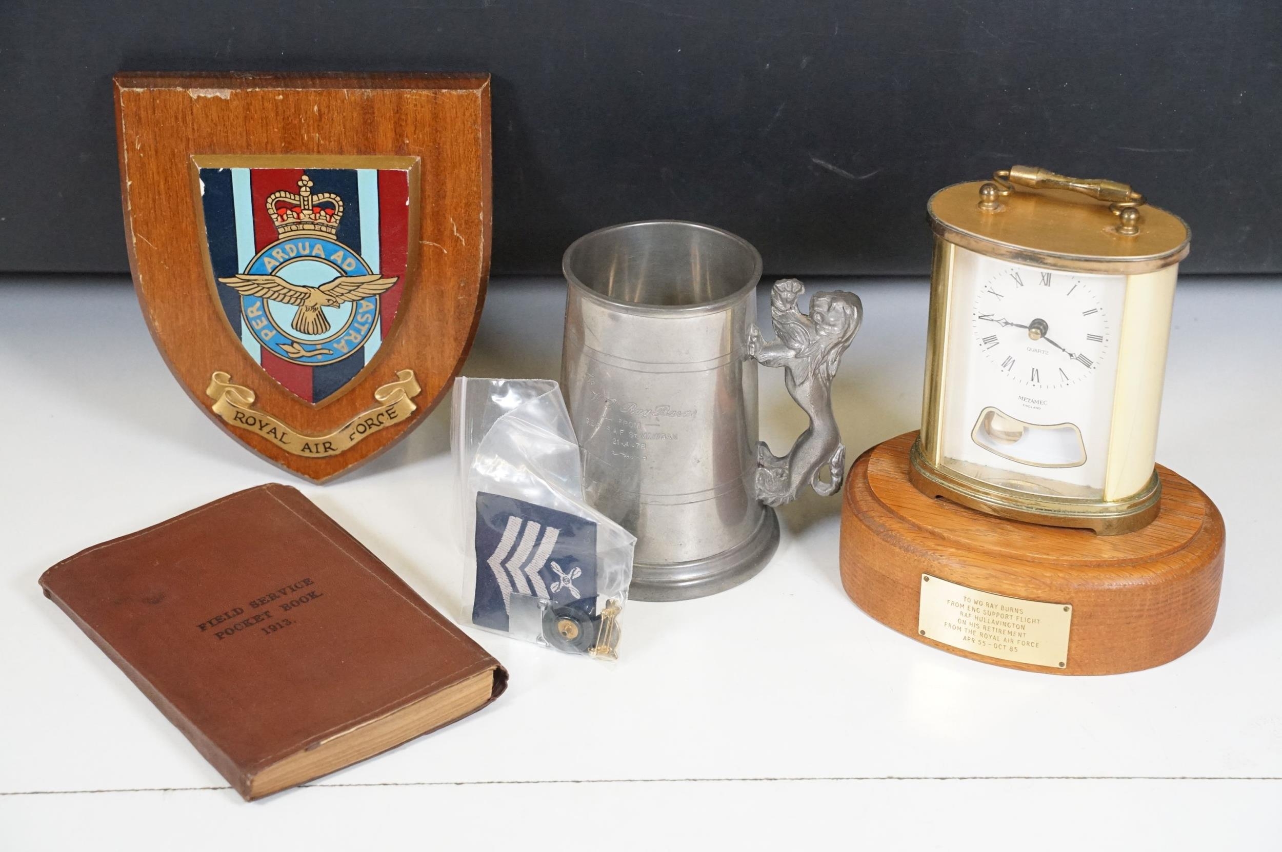 Collection of mixed RAF related items to include Field Service Pocket Book 1913, wooden Royal Air Force RAF plaque, commemorative RAF pewter tankard and RAF commemorative quartz Metamec clock