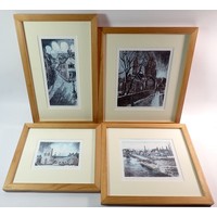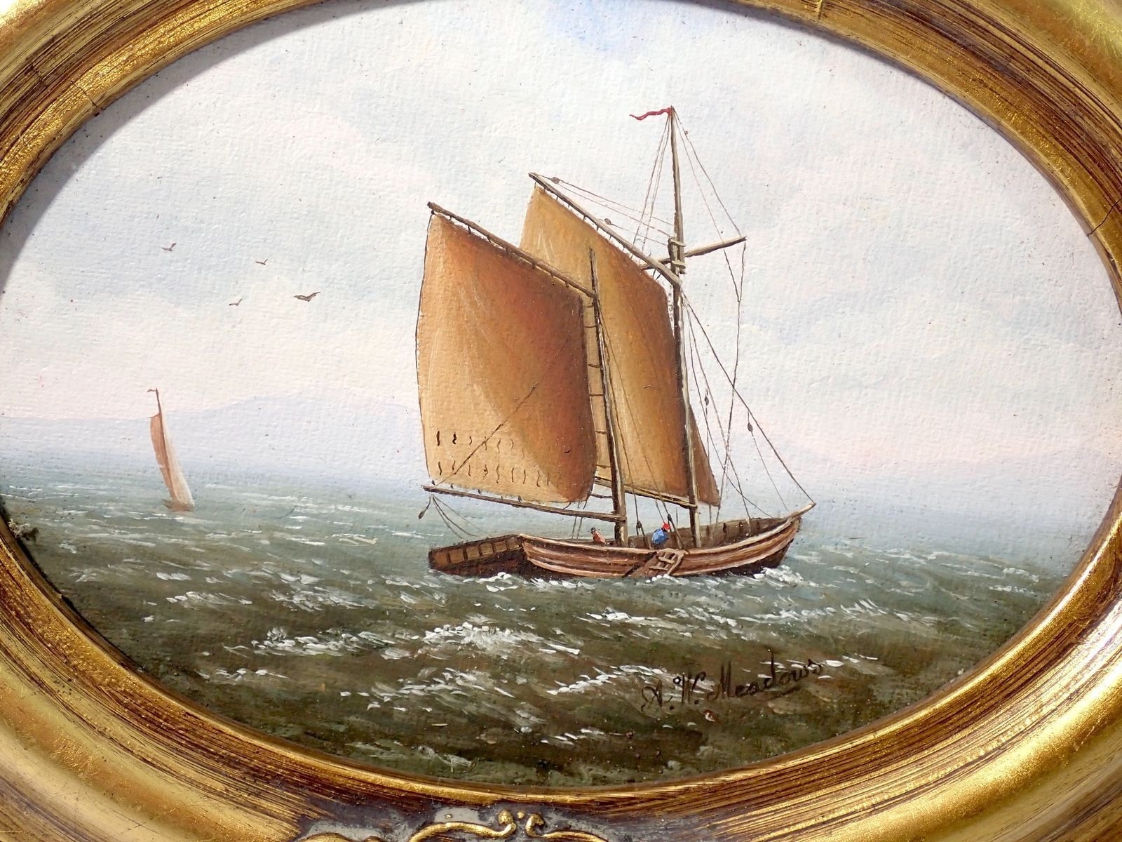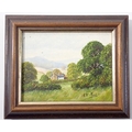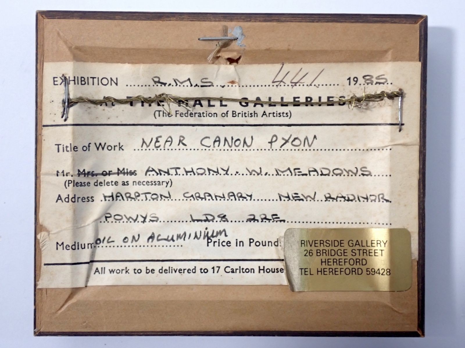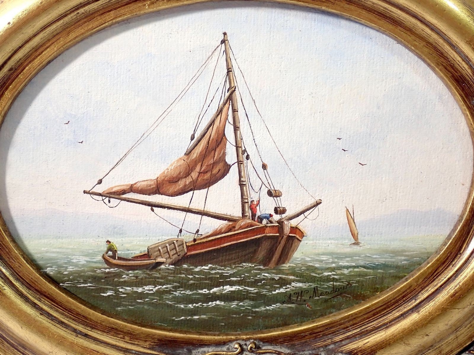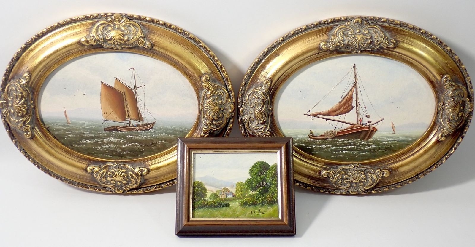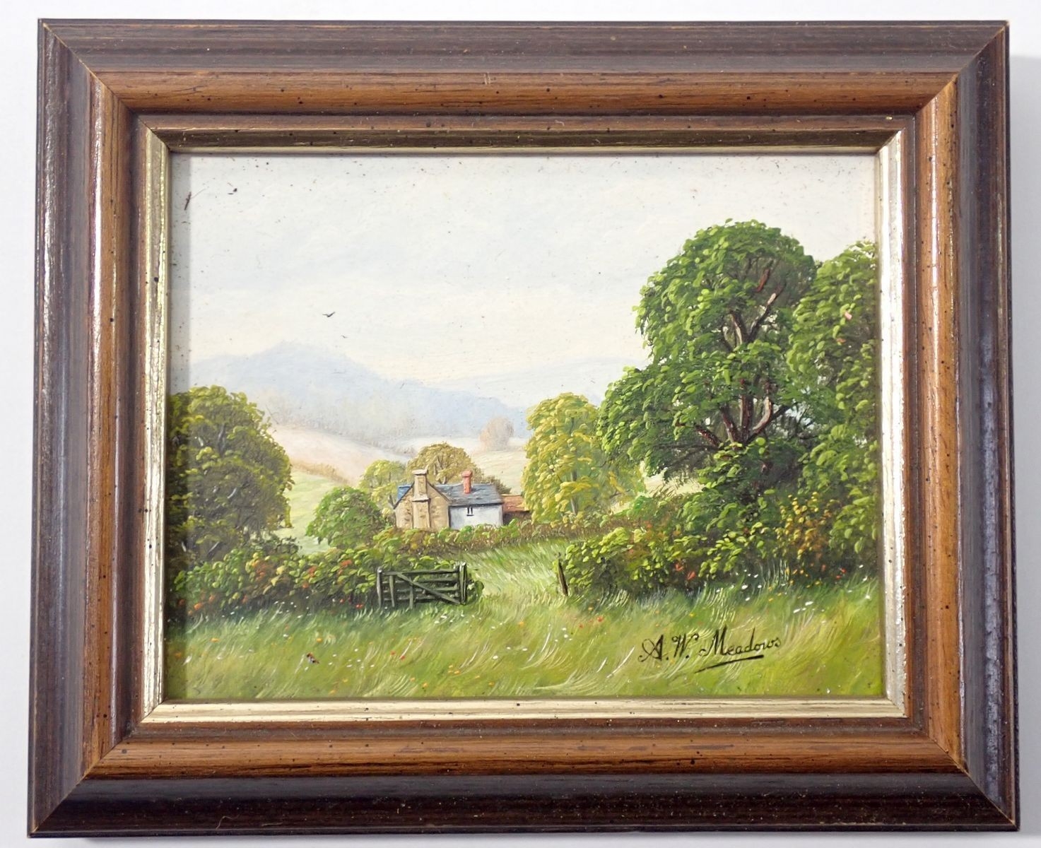 A pair of oval gilt framed oils by A W Meadows, 11.5 x 16.5cm and a miniature oil Near Canon Pyon