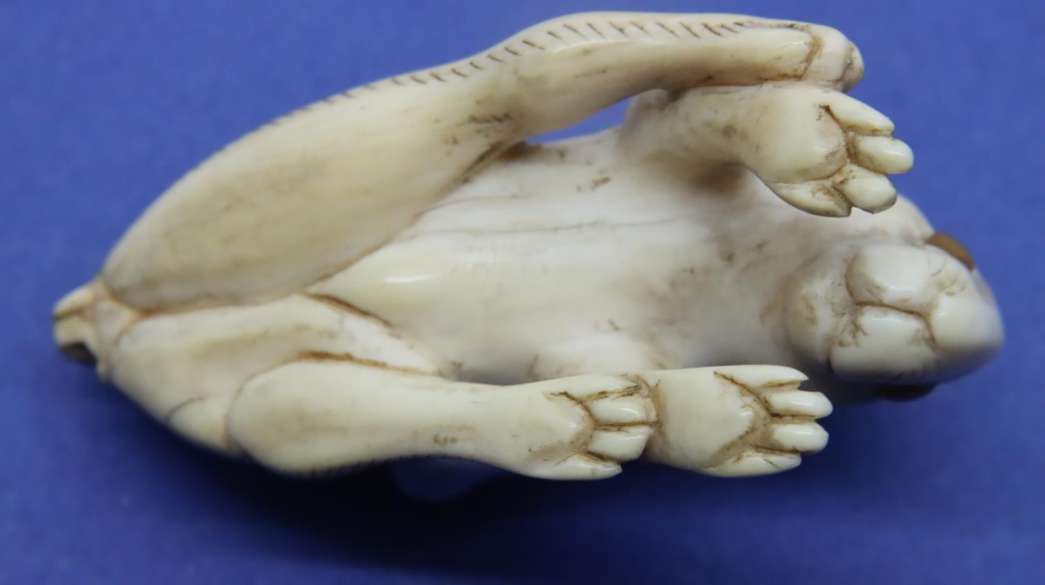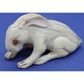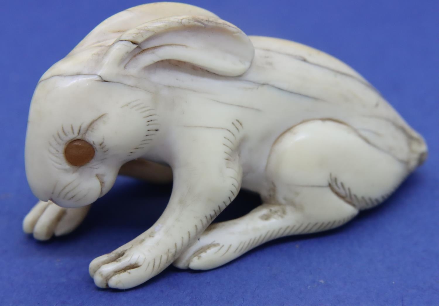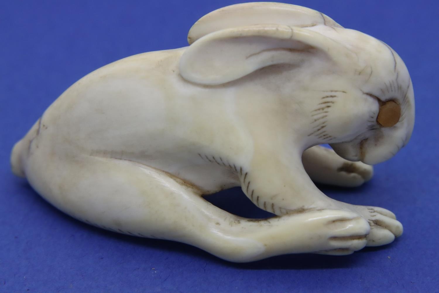 Carved ivory of a hare with amber eyes. P&P Group 1 (£14+VAT for the first lot and £1+VAT for subsequent lots)