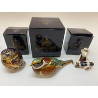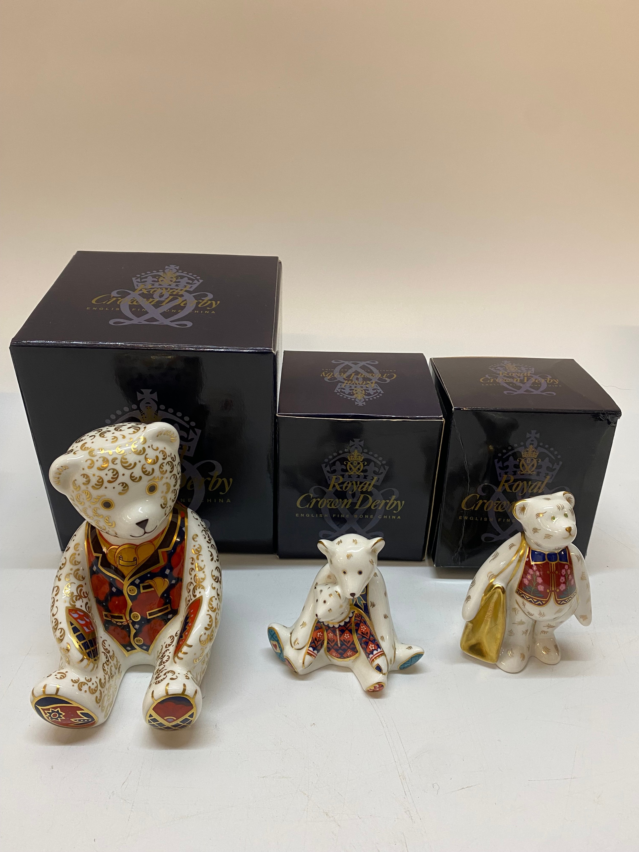 Three Royal Crown Derby paperweights, all boxed - Miniature Bear Shopper With Love, Miniature Bear Mum and Charlotte and Debonair Bear