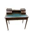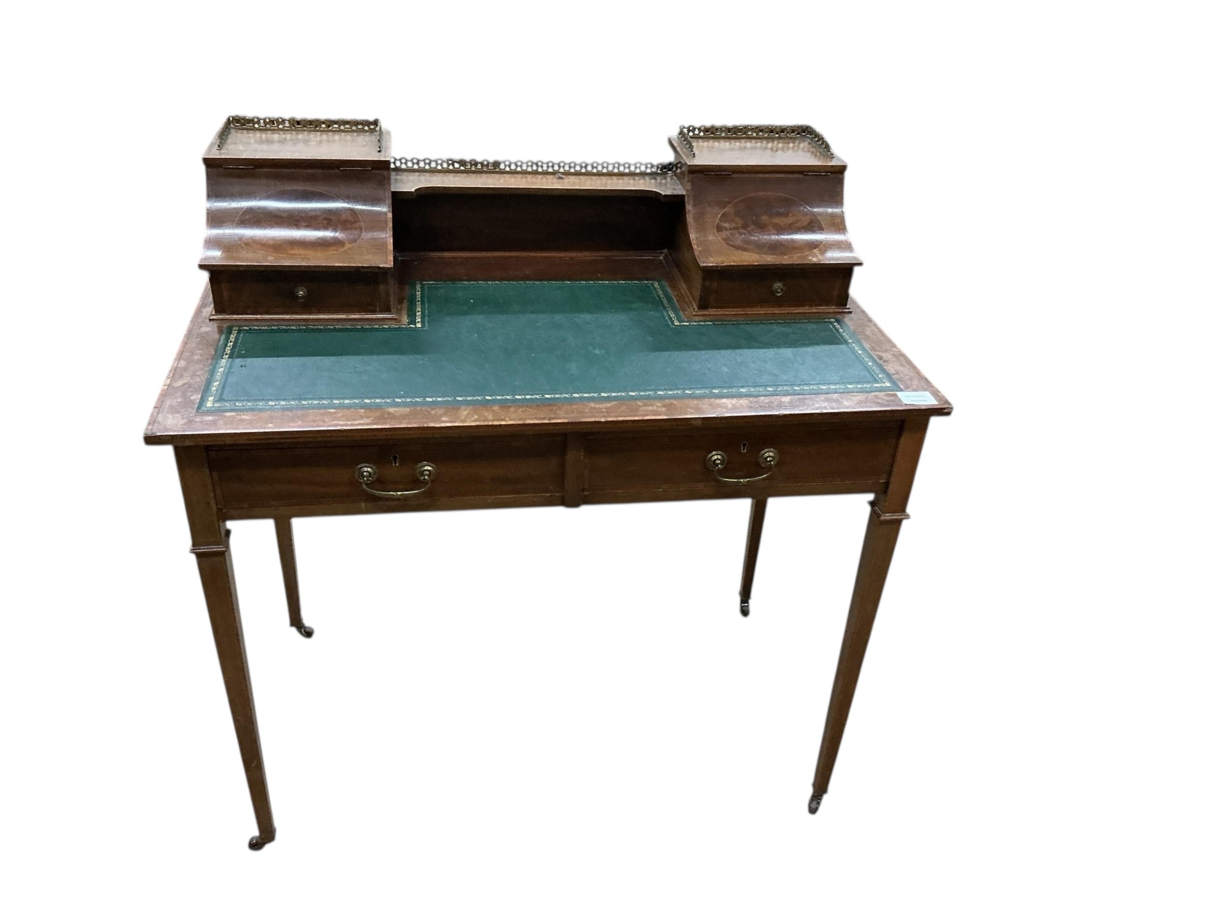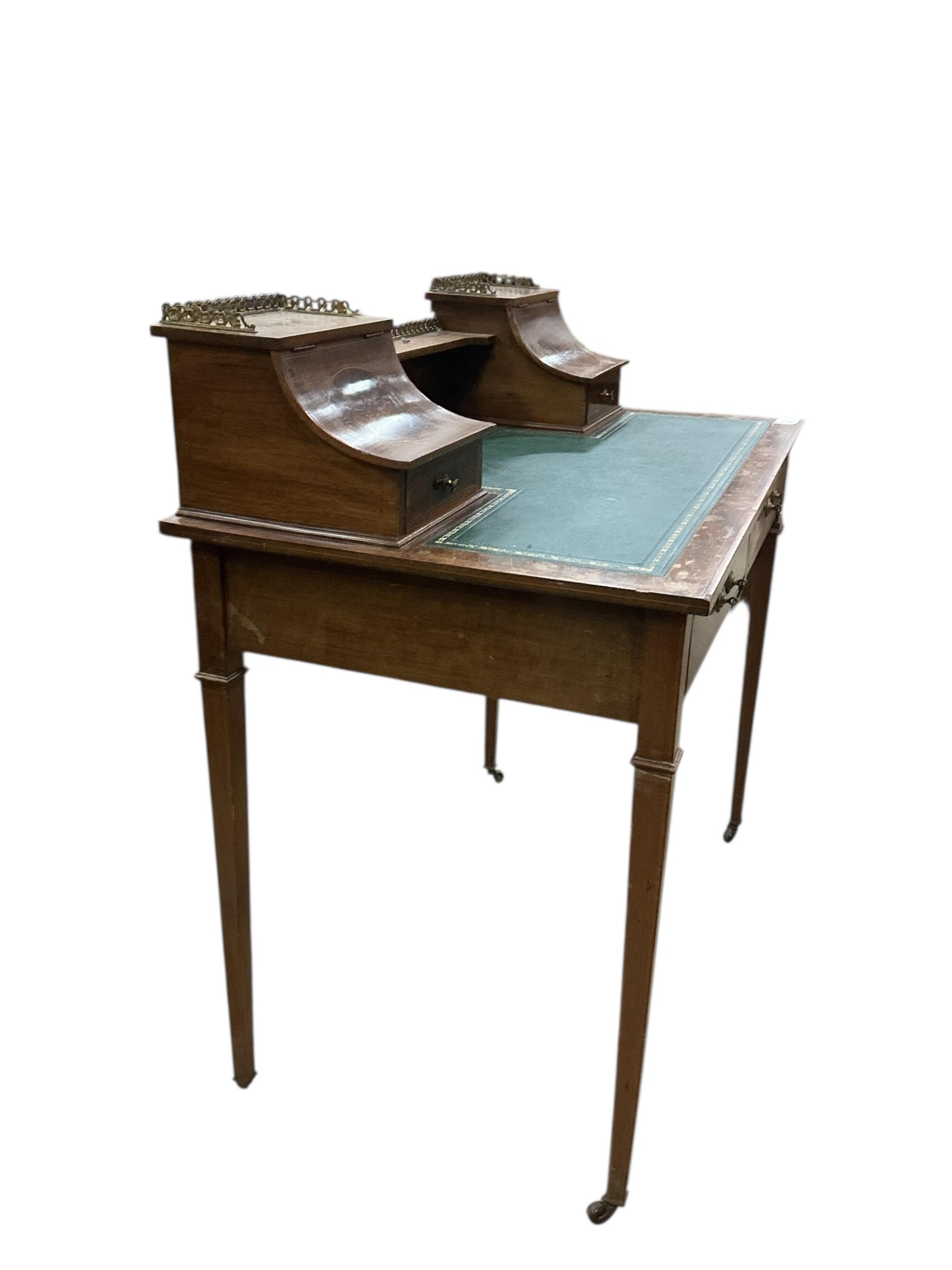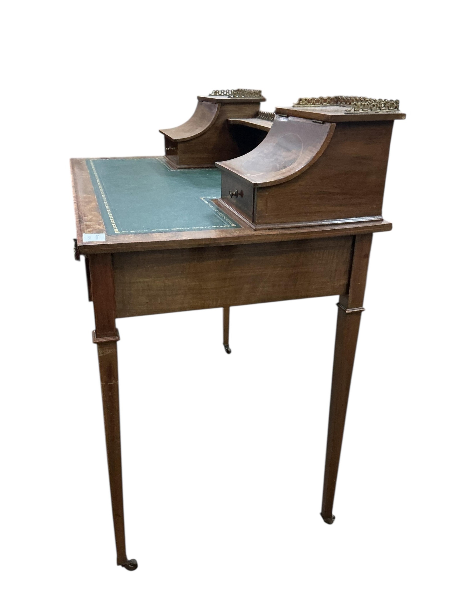 An Edwardian satinwood banded mahogany writing table, bears Maple & Co. label, width 91cm, depth 52cm, height 91cm
