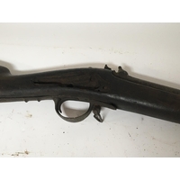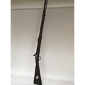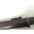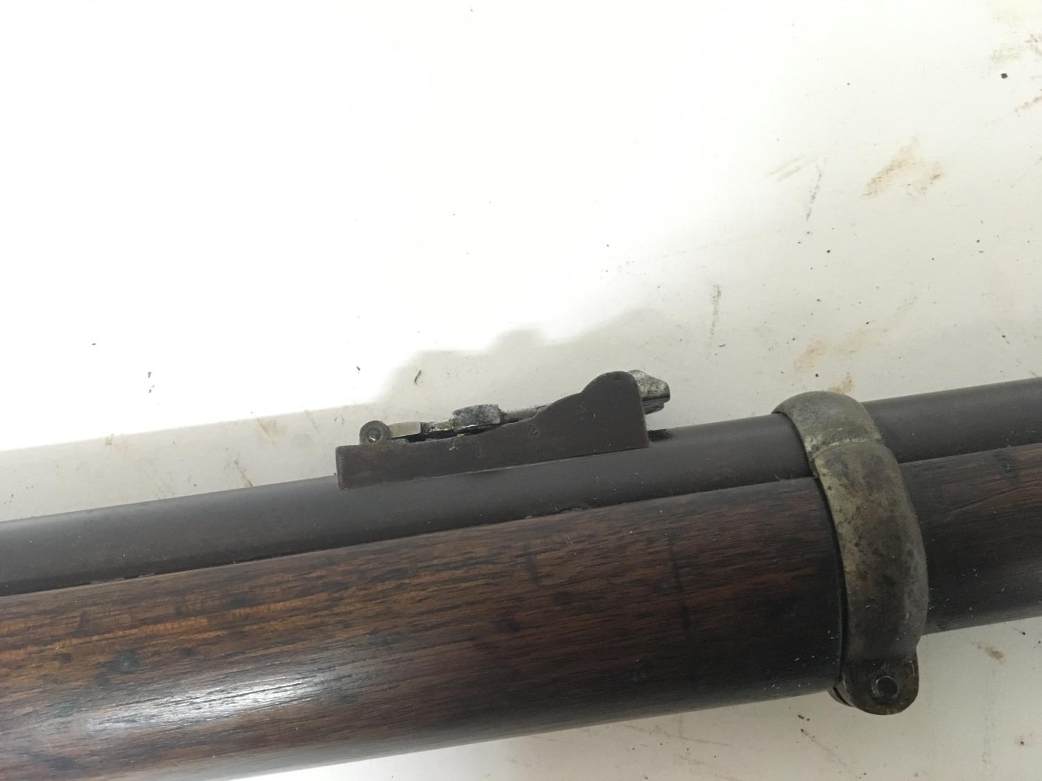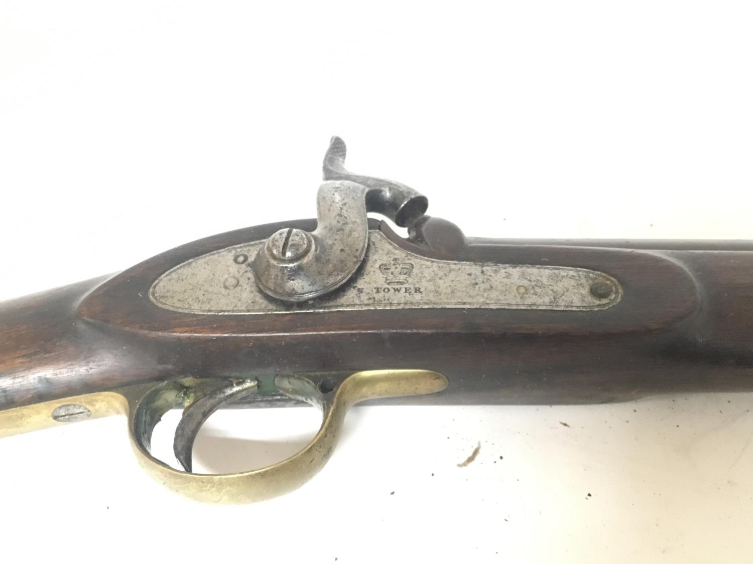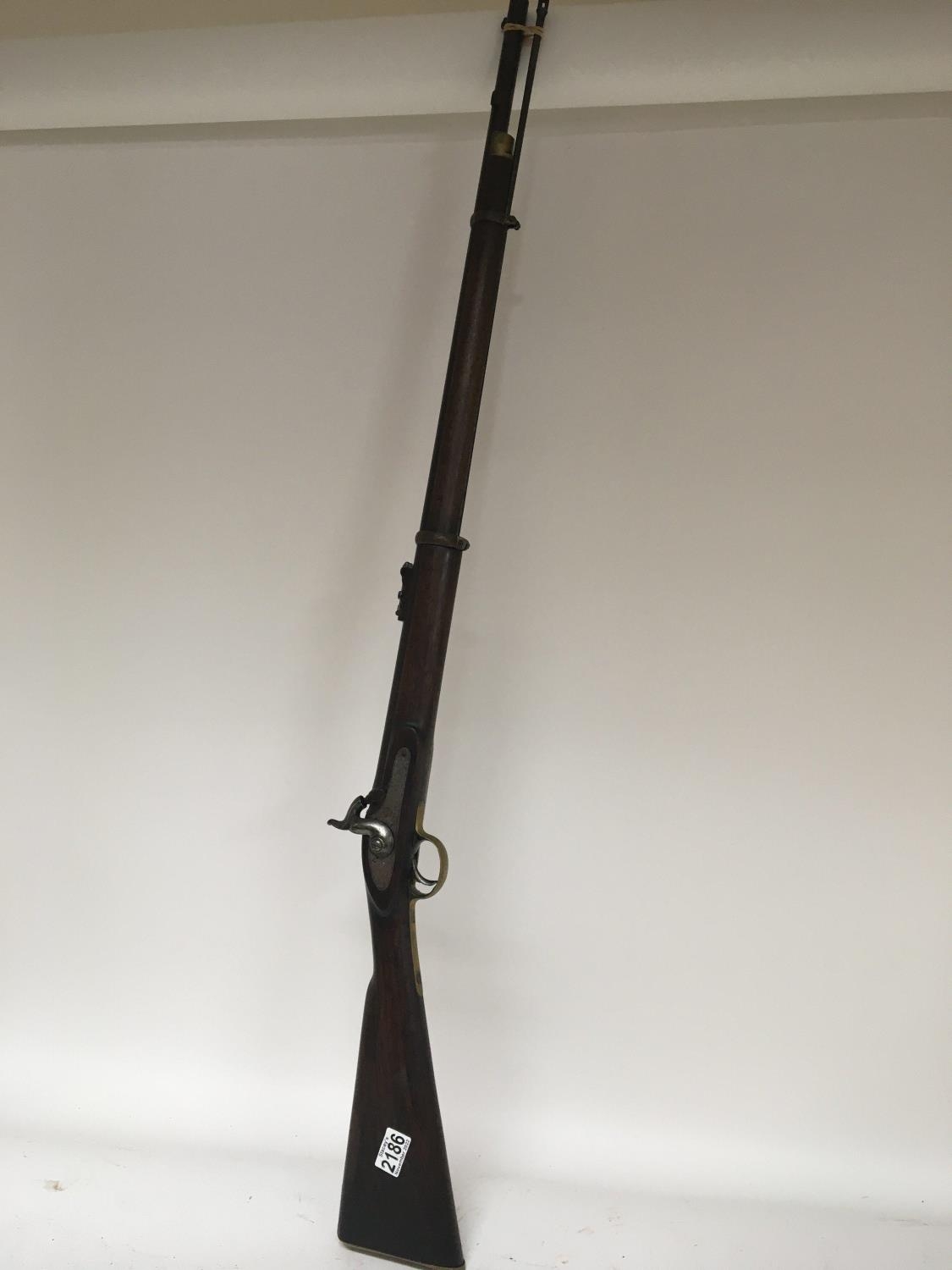 A British service 1842 pattern percussion musket rifle the action with crown and Tower the barrel with adjustable sight two steel barrel fixing rings brass fittings. Length 124cm
