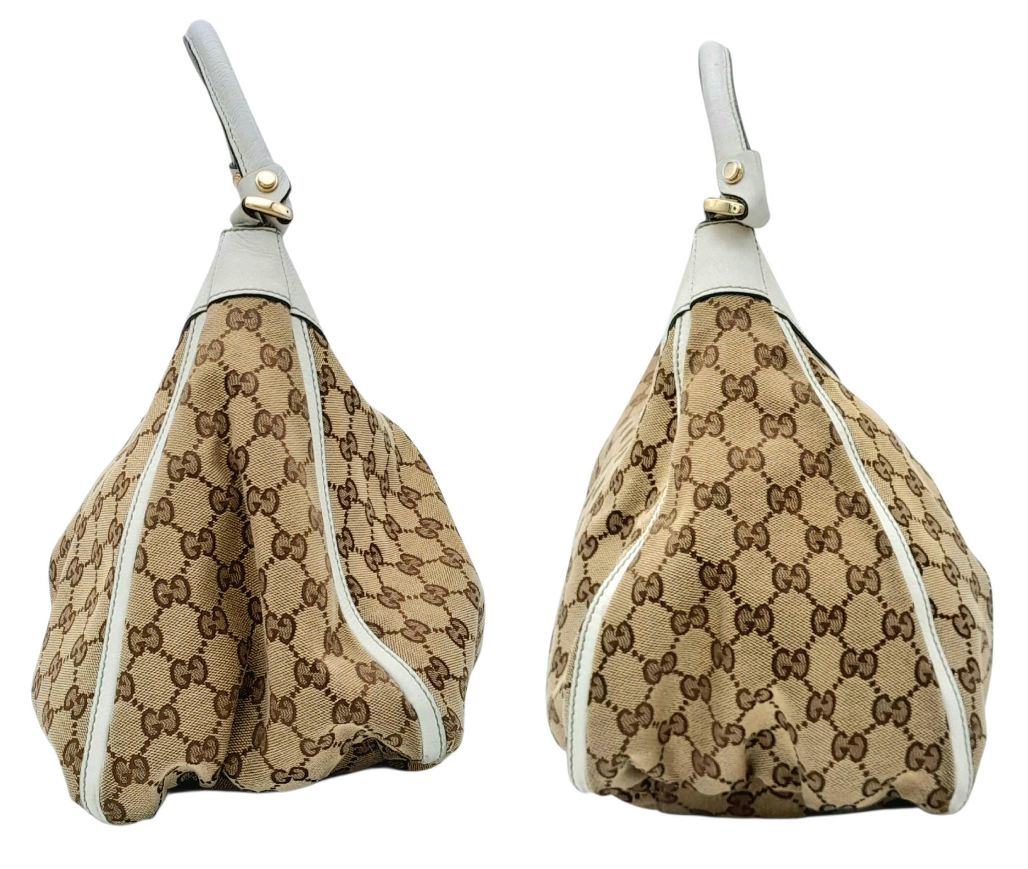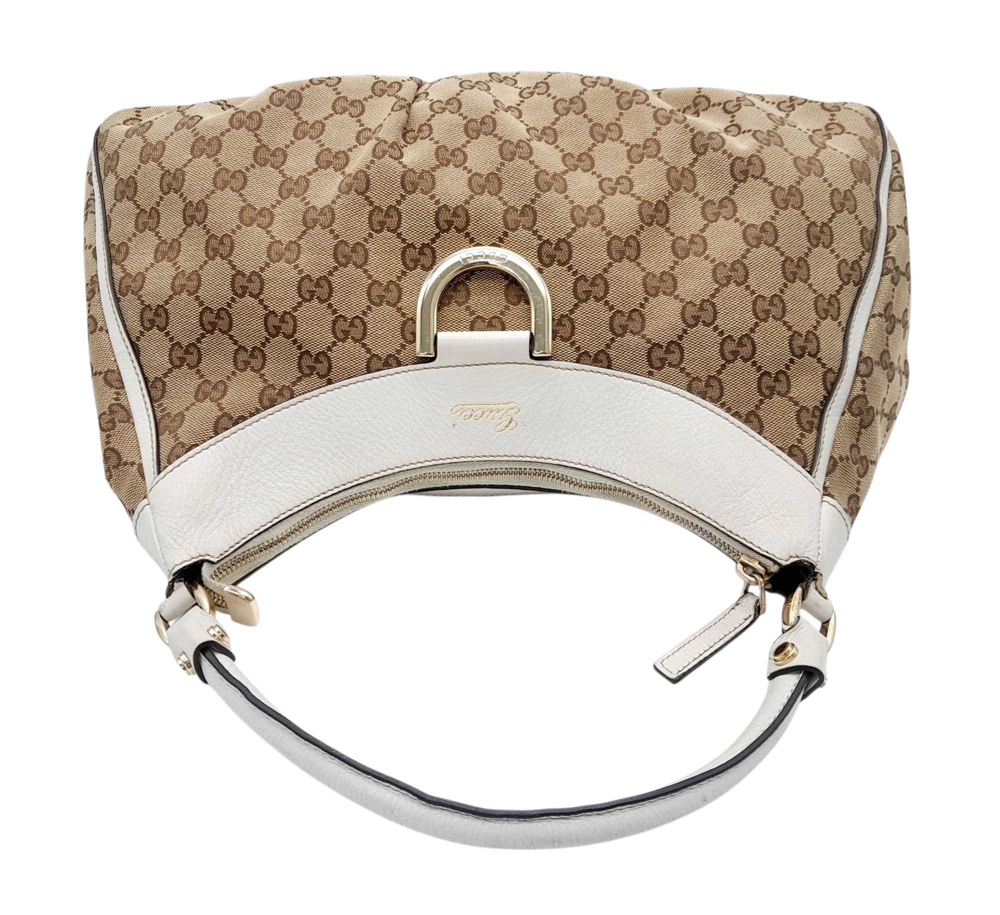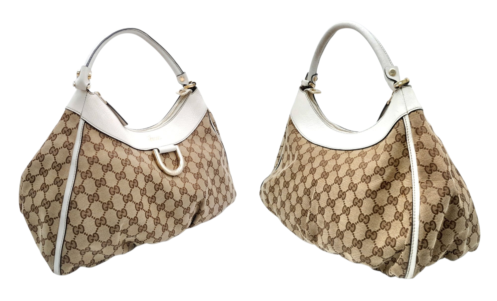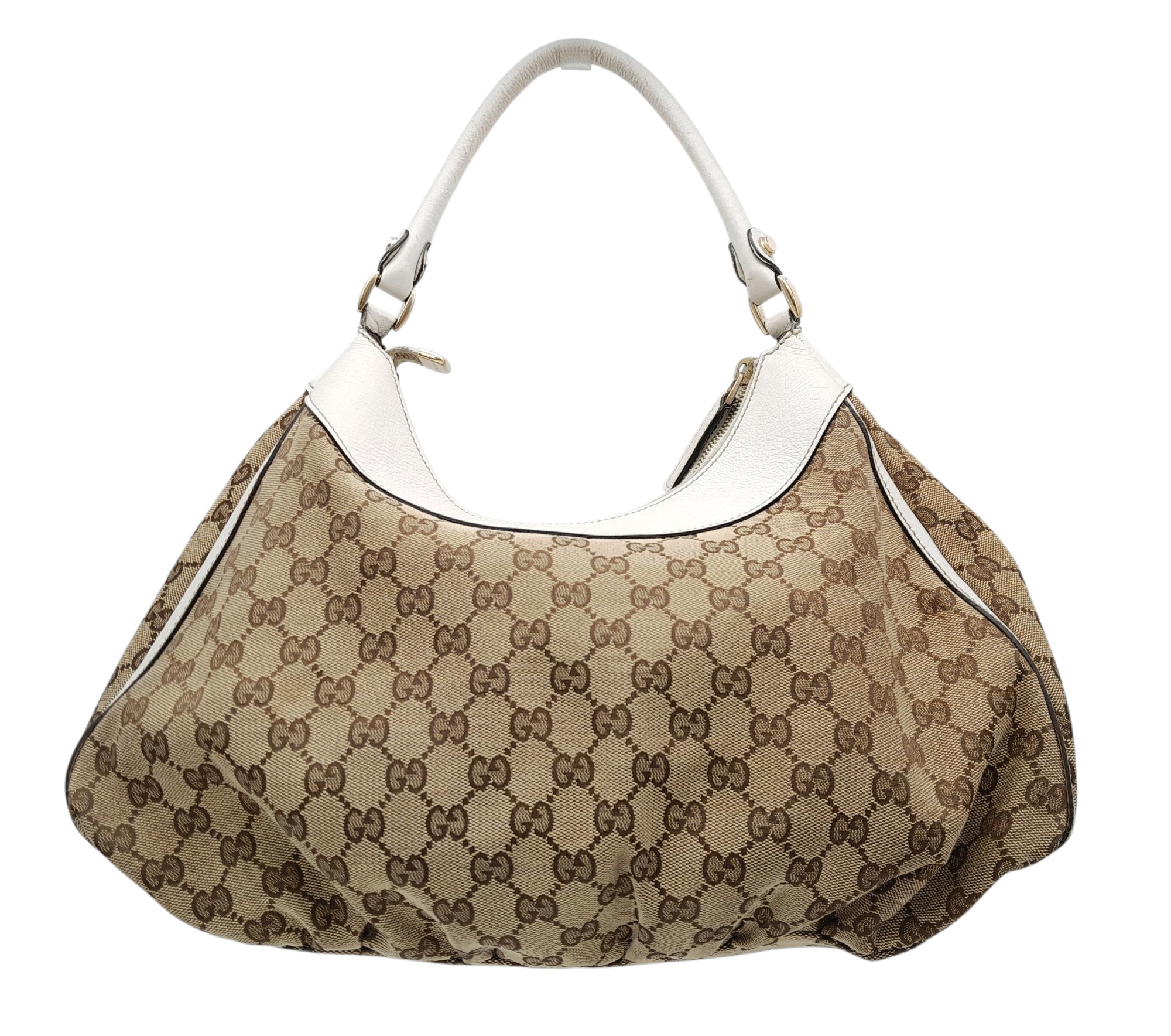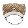 A Gucci Brown GG Canvas and White Leather Abbey Shoulder Bag. Brown GG monogram canvas exterior with white leather trim, silver-toned hardware, D-ring detail to the front, and a zipped top closure. Features a single white leather shoulder strap. Brown textile interior with one zipped side pocket and one open side pocket. Comes with certificate of authenticity and a dust bag. Some signs of wear and tear exterior, including scuffs to leather, minor creasing. Approx 38cm width x 27cm height x 16cm depth. Please see photos or request a condition report. Ref: STK023002