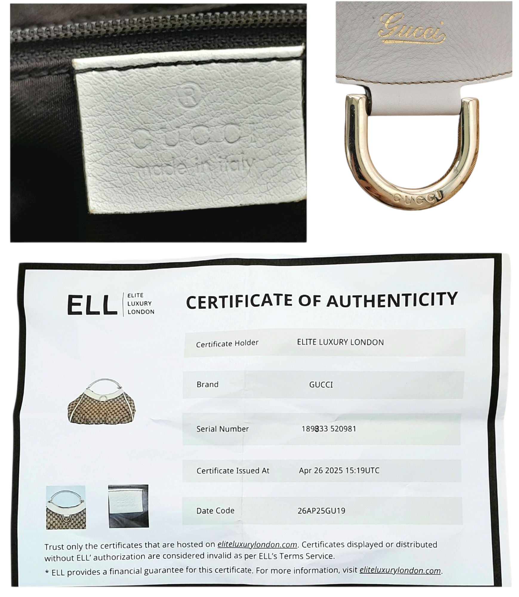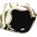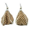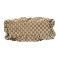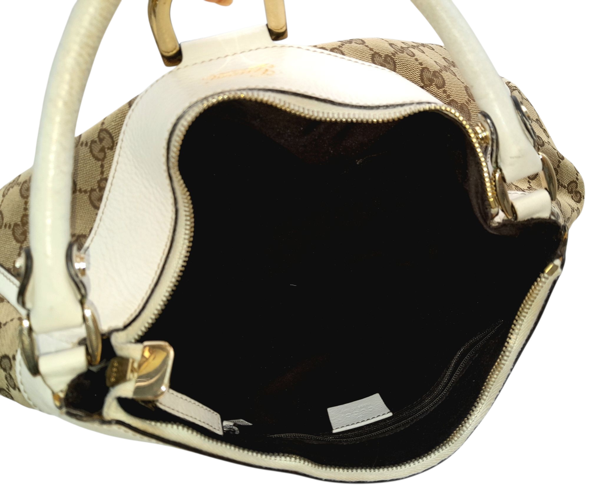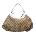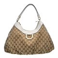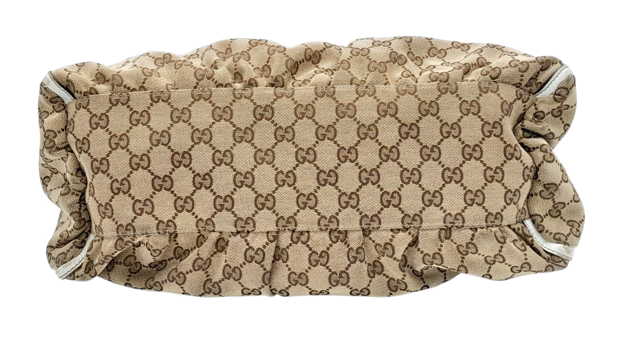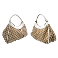 A Gucci Brown GG Canvas and White Leather Abbey Shoulder Bag. Brown GG monogram canvas exterior with white leather trim, silver-toned hardware, D-ring detail to the front, and a zipped top closure. Features a single white leather shoulder strap. Brown textile interior with one zipped side pocket and one open side pocket. Comes with certificate of authenticity and a dust bag. Some signs of wear and tear exterior, including scuffs to leather, minor creasing. Approx 38cm width x 27cm height x 16cm depth. Please see photos or request a condition report. Ref: STK023002