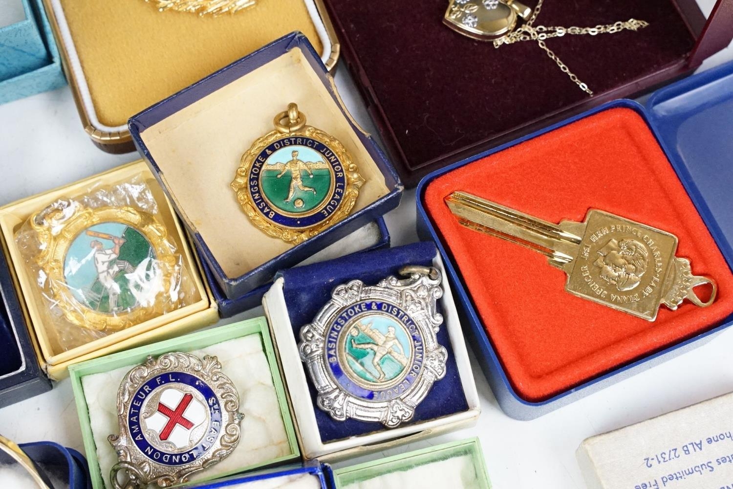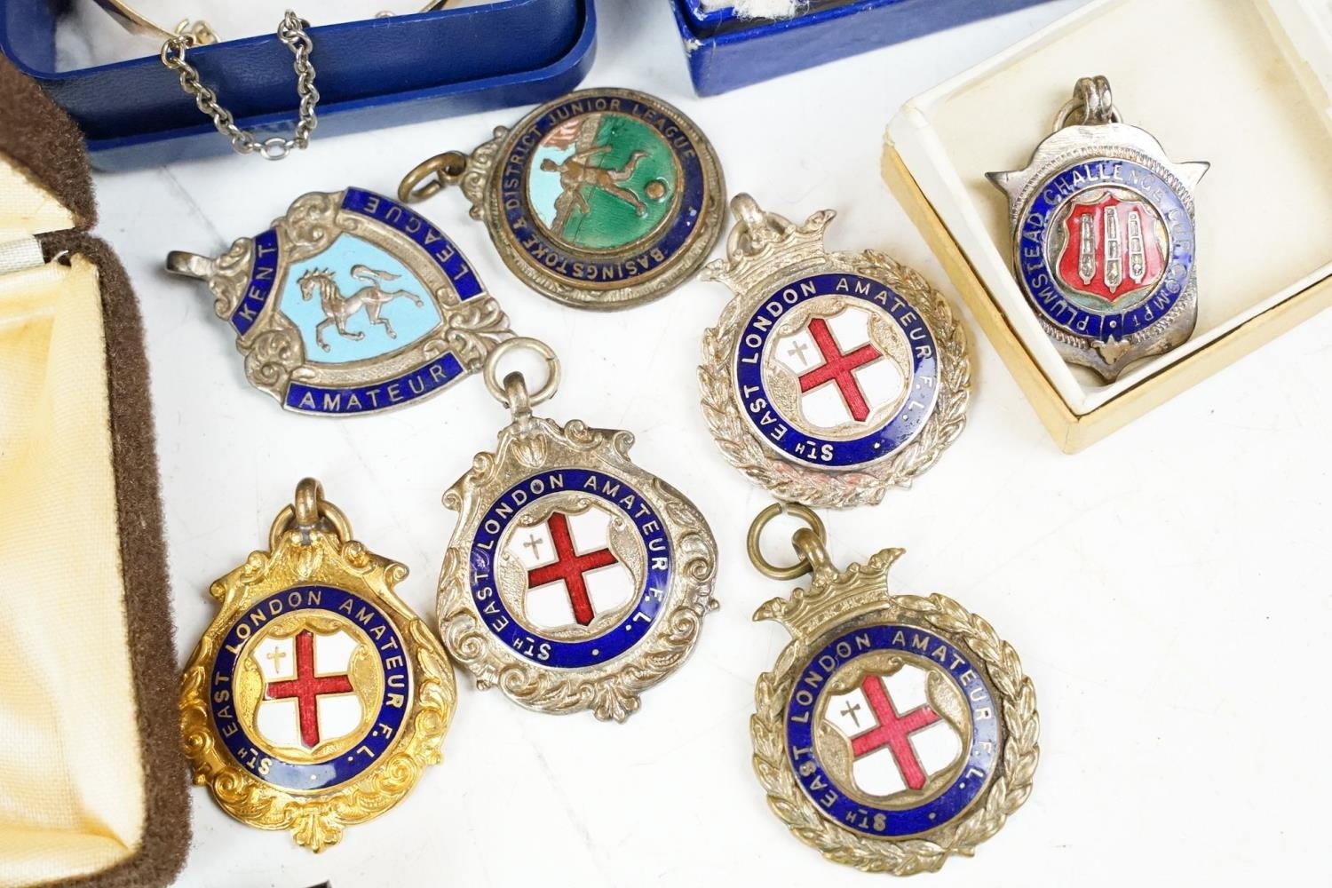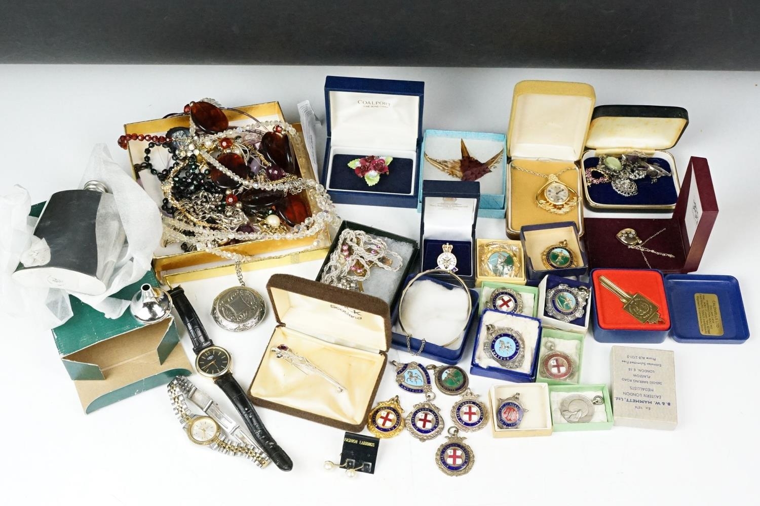 A collection of mainly vintage costume jewellery together with a selection of sporting fob medals