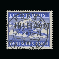 Germany - 1871 to 1945 : MILITARY POST 1944 German occupation of Greek Islands. Rhodes 30c postal stationery card bearing Fieldpost ovpt stamps incl Vukovar ovpt on Parcel roulette stamp (Michel 6), Rhodes Airmail ovpt & parcel ovpt both roulette (Michel 8B, 9), Agram Parcel roulette with blue ovpt (Michel 10b), Rhodes Christmas issue 5c with 'WEIHNACHTEN 1944' ovpt (Michel 12 type I), all tied by 3 strikes of Feldpost cds, plus 'POSTA AEREO/AGEO/25.12.44' cds, comes with Chris Ceremuga photo cert confirming 'genuine in all respects', a remarkable card in excellent condition, probably unique . (image available) [US3]
