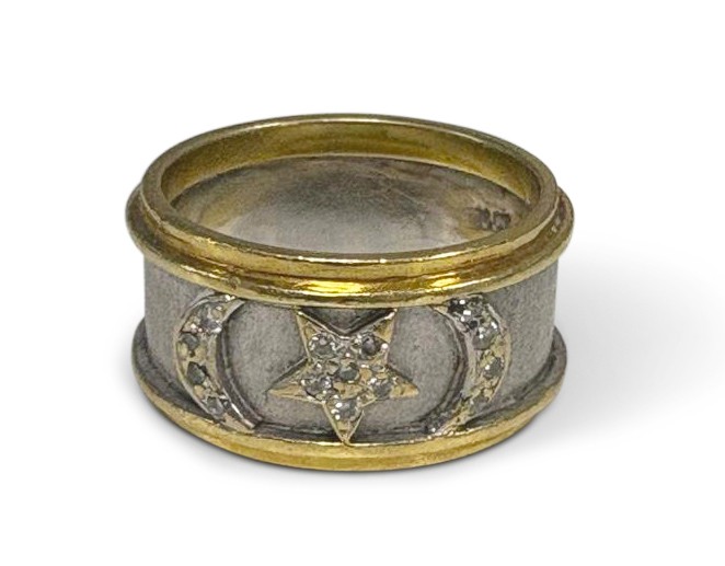 Pave set to centre in a star formation with 0.15 carats of round brilliant cut diamonds, colour H, clarity VS, in 18ct white and yellow gold, size J, 6,3g all in
