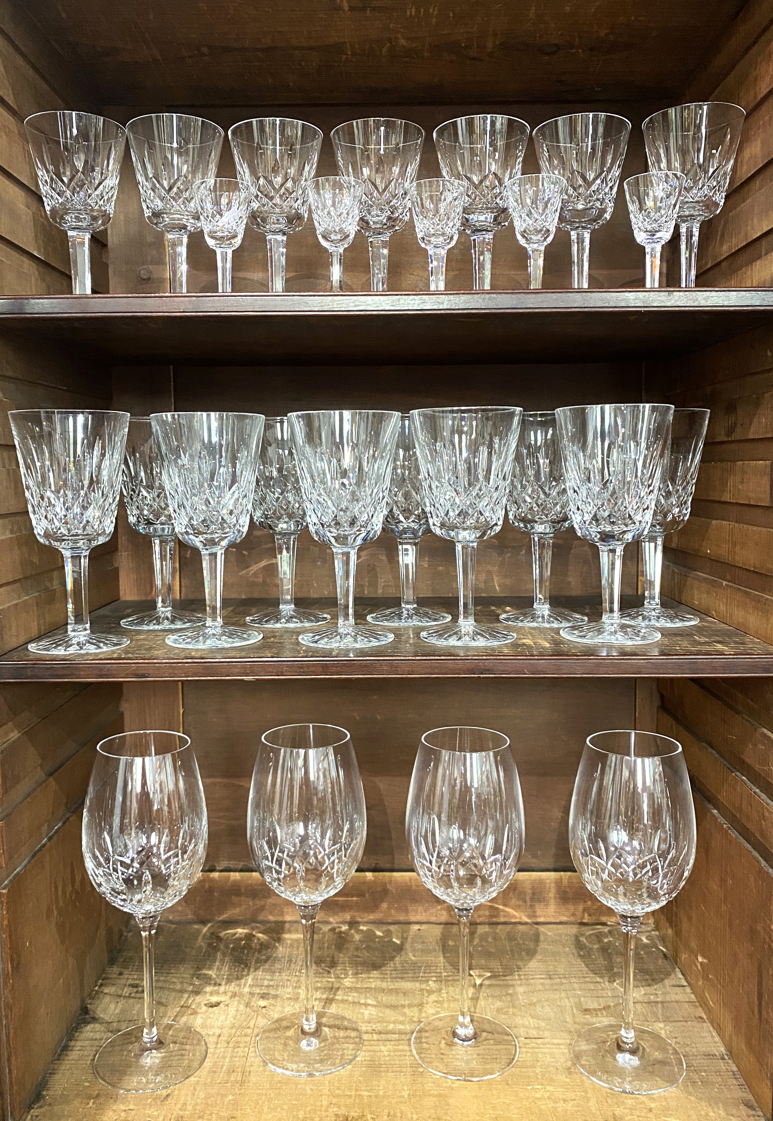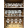 A collection of Waterford 'Lismore' pattern drinking glasses comprising four large red wine goblets 26.5cm high, ten goblets 17.5cm, seven claret glasses 14.8cm, and five liqueur glasses 8.8cm