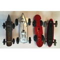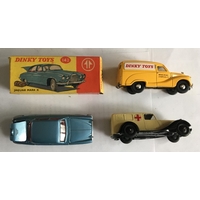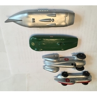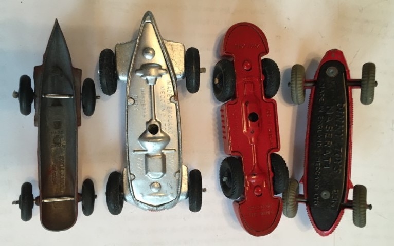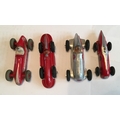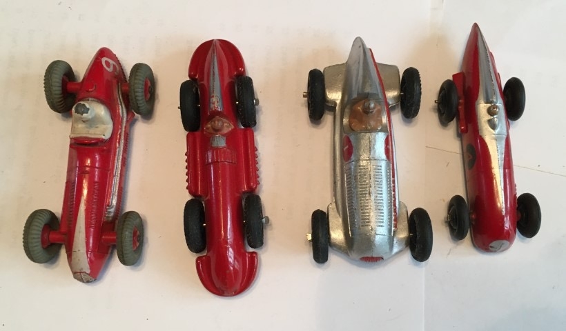 Four early Dinky Meccano, racing cars. Mercedes Benz, “Speed of the Wind”, Maserati, and one other. Condition as photographed