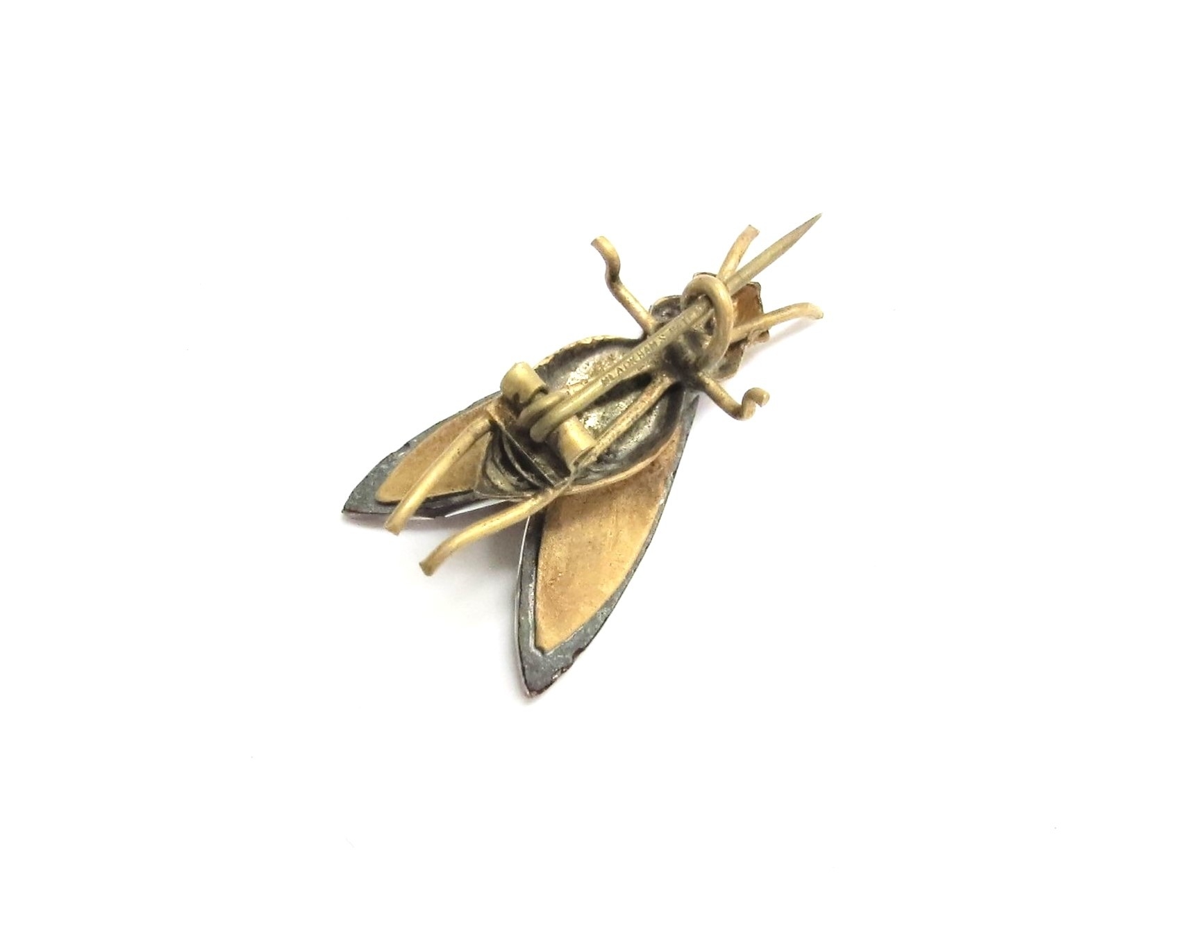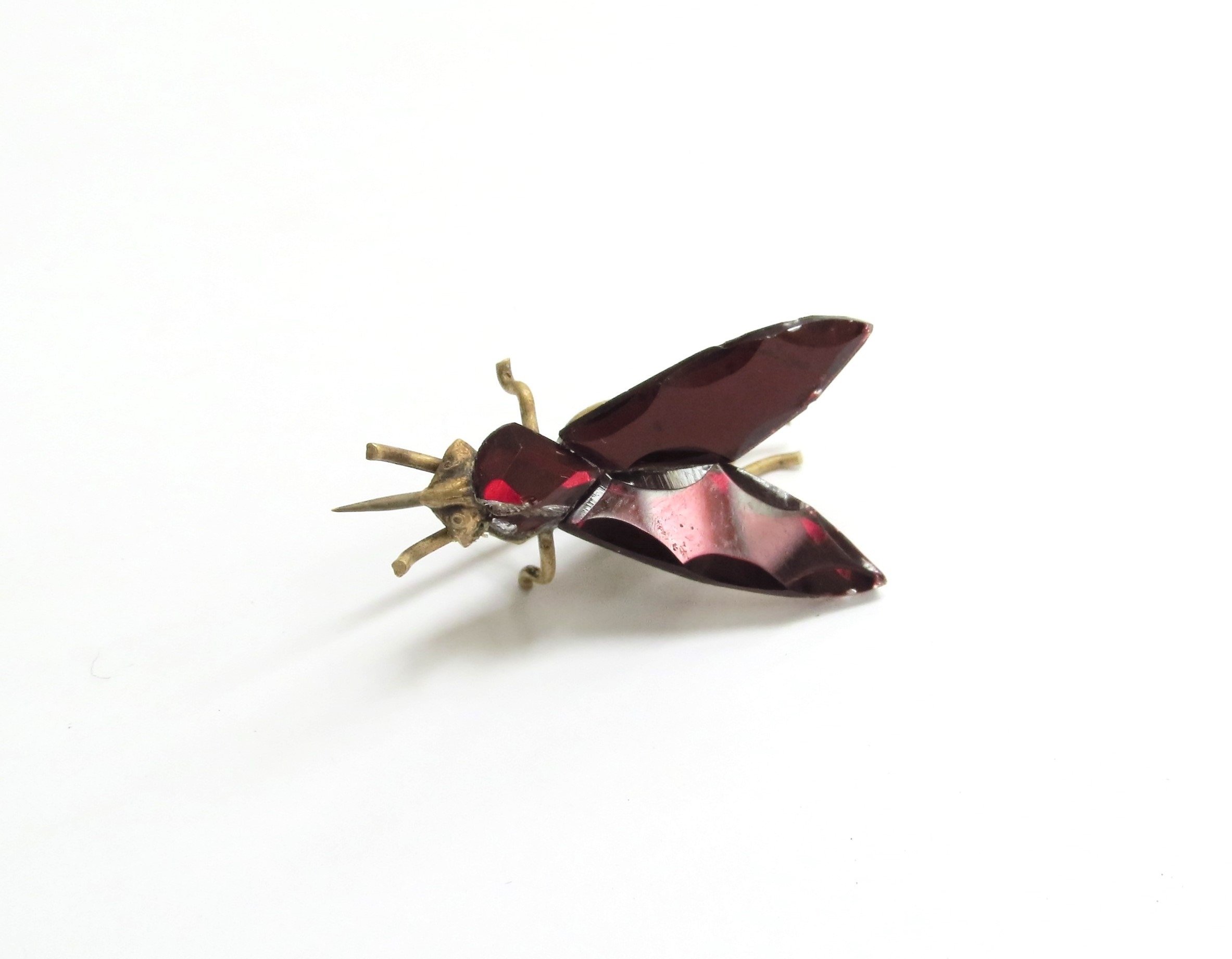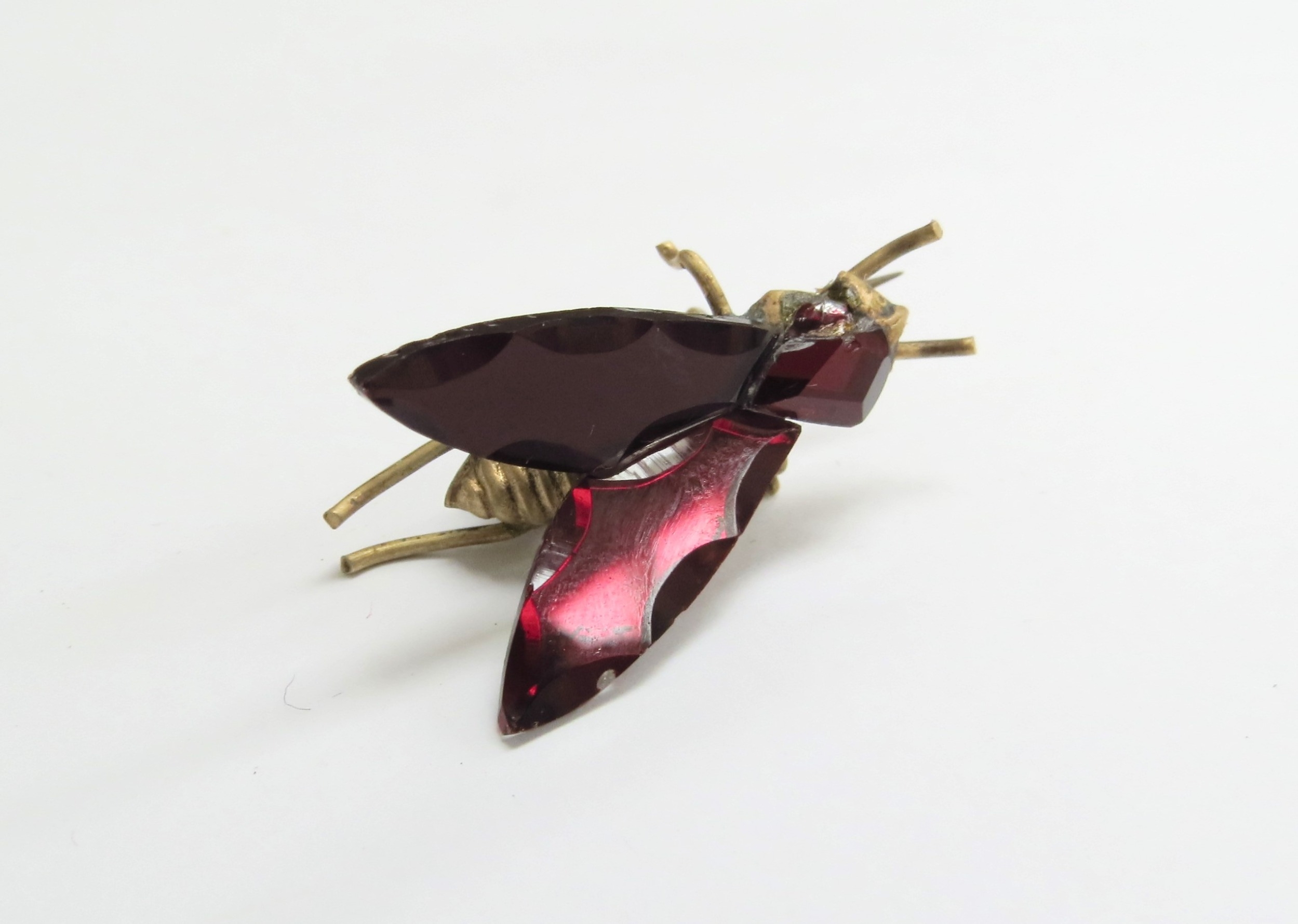 A Vauxhall glass fly brooch in dark red, Blackhams Patent marked to pin, 3.5cm long