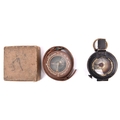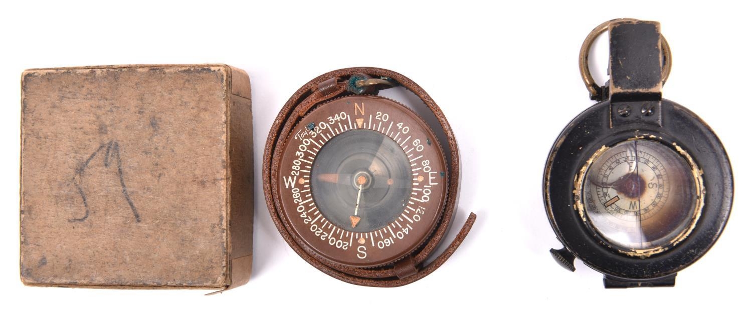 A WWII liquid filled prismatic marching compass, by T.G. Co Ltd, London”, number B119478, marked “1941 Mk III”, GC (some wear); also a brown bakelite US Army Taylor Model liquid filled wrist compass, unissued, in its stout card box with leather wrist strap. GC (the box slightly worn). (2) £60-80