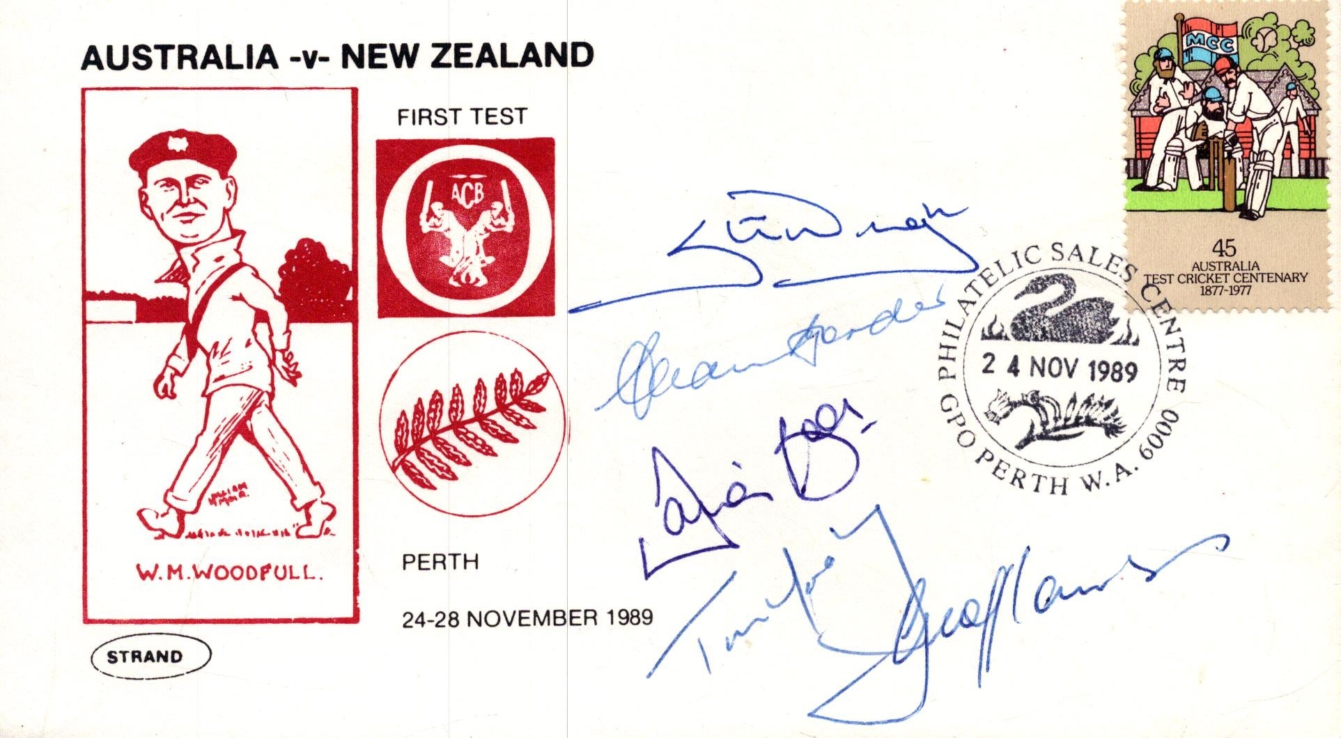 Steve Waugh, Allan Border, David Boon and others signed Australia v New Zealand stamped Nov 1989.