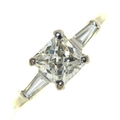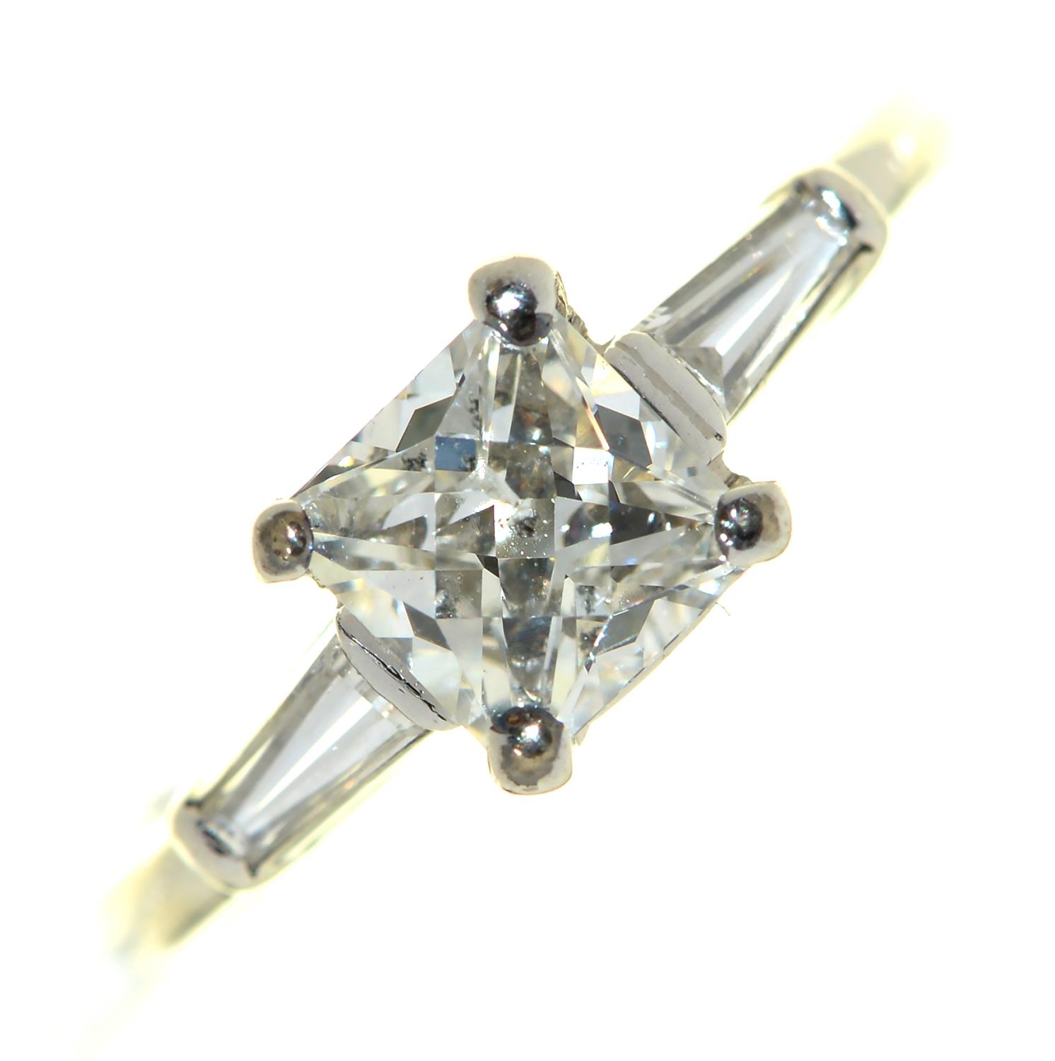 An Art Deco diamond ring, the French cut larger central diamond of approx 1ct flanked by trapeze cut diamonds, marked PL... and with inventory numbers, 4.4g, size K